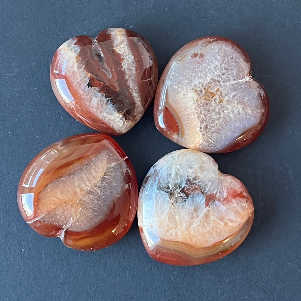 Cornaline, avec ses teintes orange vif en forme de cœur, symbolise la vitalité et la passion, encourageant le courage et la créativité.