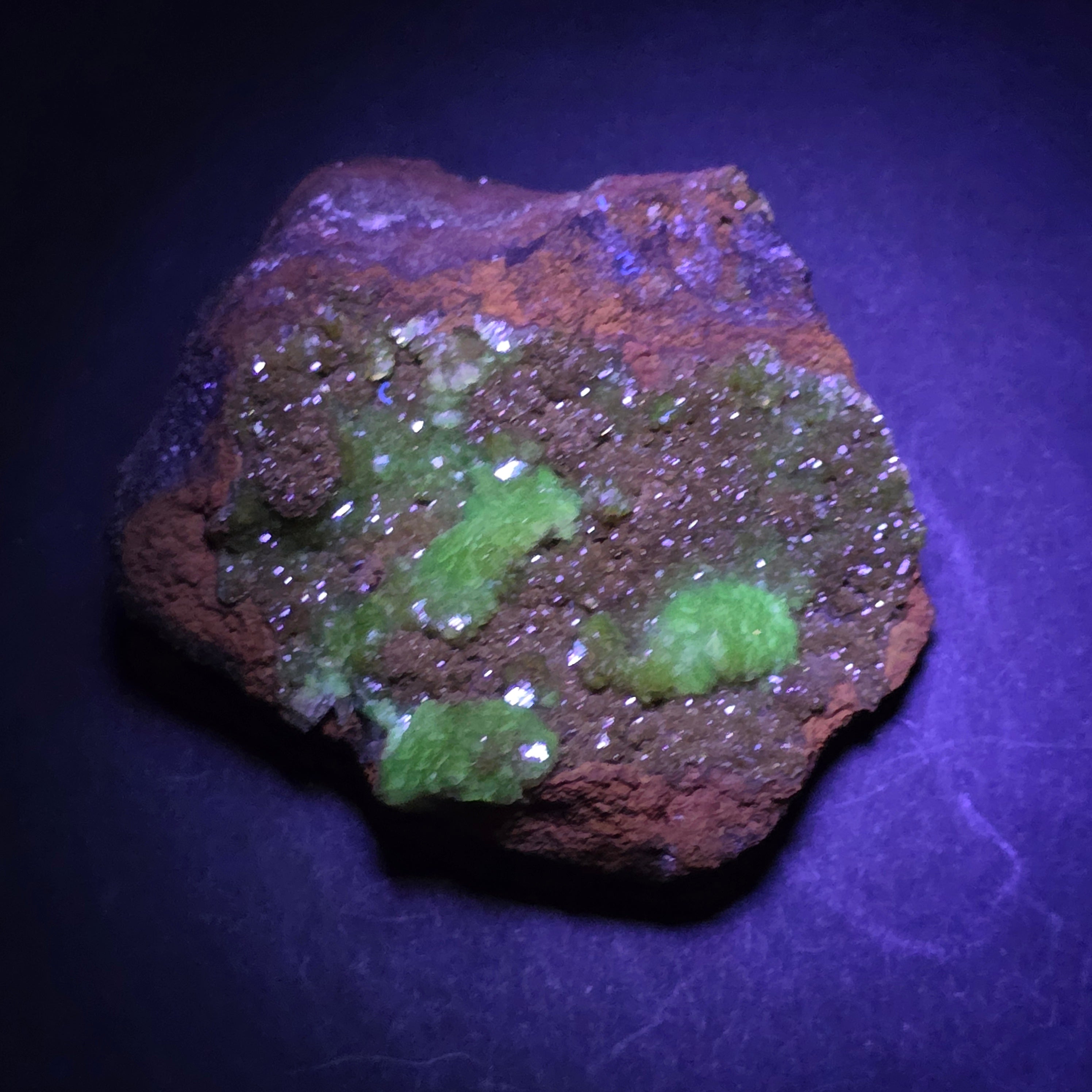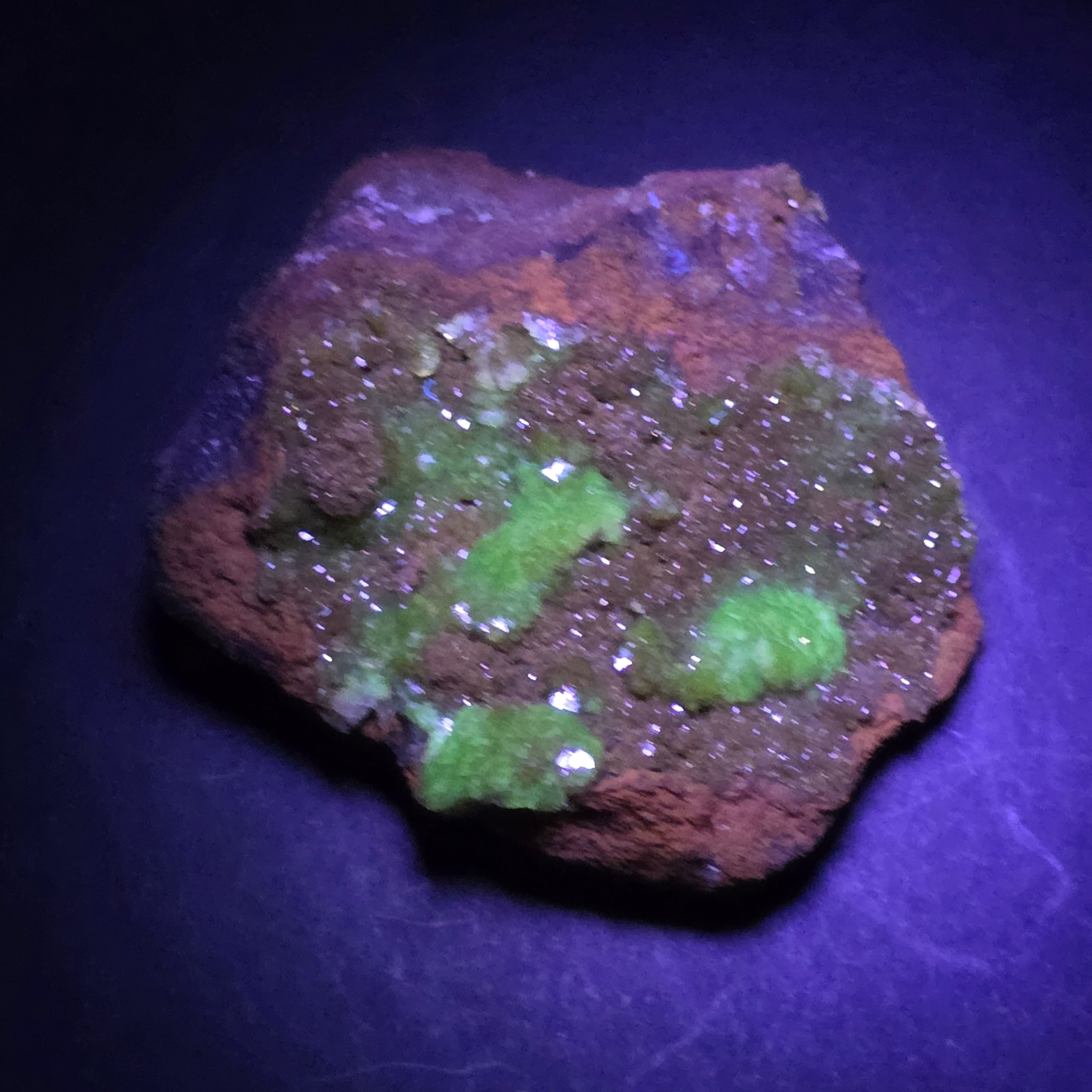 Adamite apparaît sous la forme de cristaux fins ou agrégats compacts, disposés sur matrices, au look vibrant et expressif. À la lumière naturelle, les cristaux présentent des nuances de vert, de jaune verdâtre ou de jaune intense, et sous la lumière ultraviolette, ils sont mis en valeur par un forte fluorescence, ce qui transforme complètement l'apparence du spécimen et le rend extrêmement attractif pour les collectionneurs.