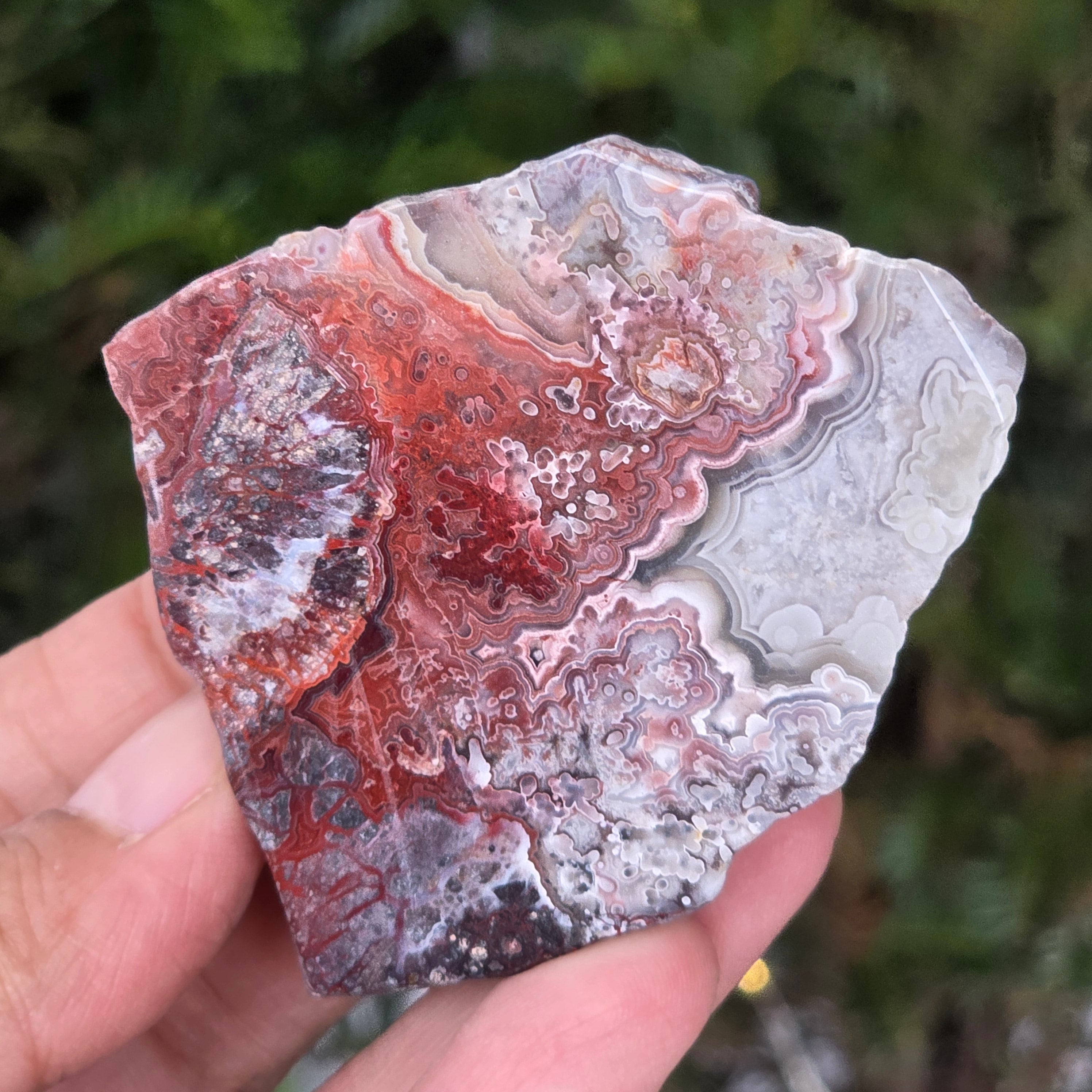 L'agate Crazy du Mexique est l'une des variétés d'agate les plus vibrantes et spectaculaires, célèbre pour ses lignes ondulées et ses jeux de couleurs folles qui semblent dessinés par une main libre, sans règles. Dans cette tranche naturelle, petite mais extrêmement expressive, se révèle toute l'histoire de la pierre : des couches terreuses, des nuances chaudes de caramel, rouge vif, orange, gris et crème, mélangées en motifs en spirale qui semblent pulser de vie.