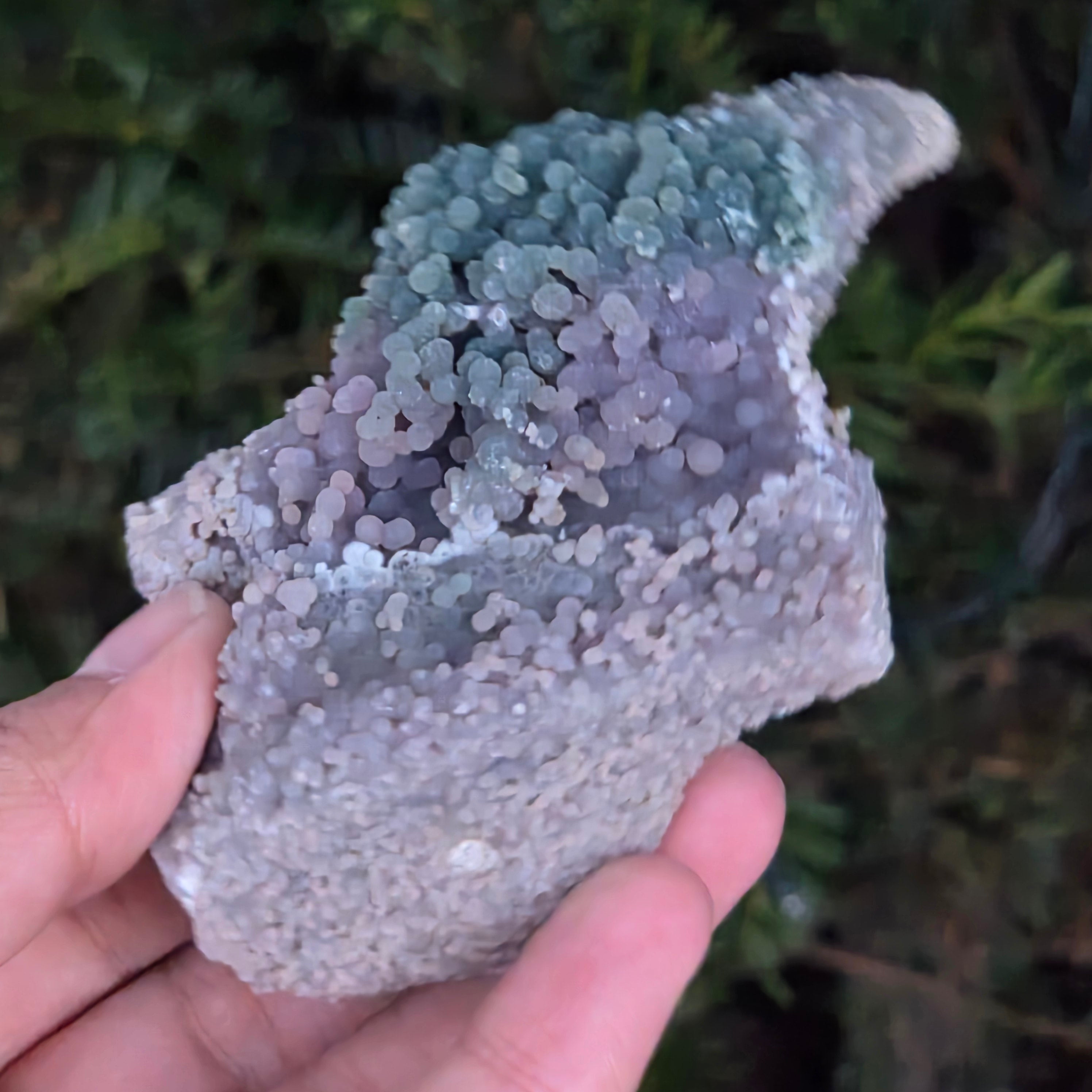 L’agate raisin se distingue par ses motifs uniques, rappelant les raisins. Ces motifs peuvent généralement avoir des formes sphériques ou elliptiques, disposées de manière régulière ou aléatoire à la surface de la pierre. La couleur de l’agate raisin peut varier des tons violet, rose, bleu, vert et marron à des nuances plus neutres, comme le gris et le blanc.