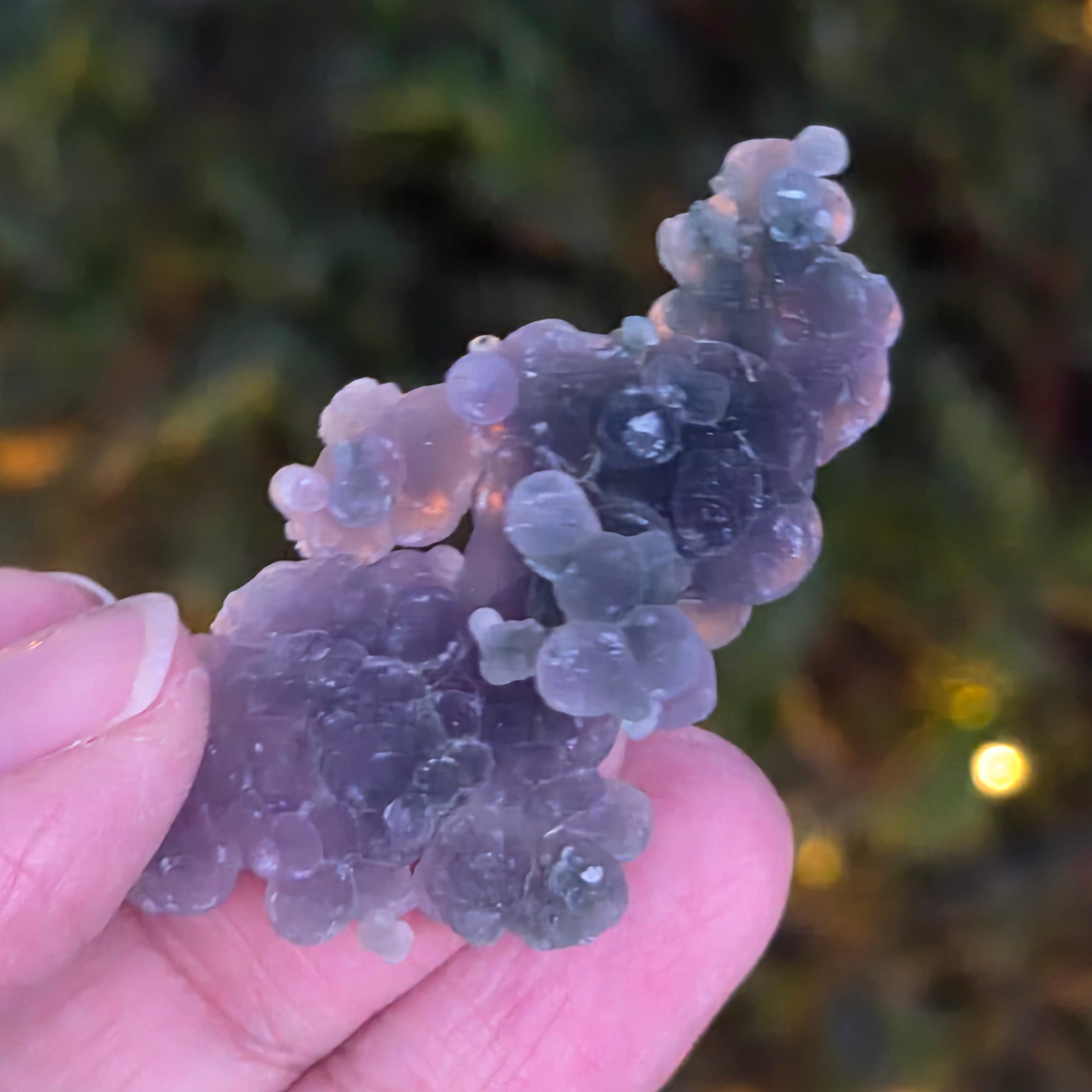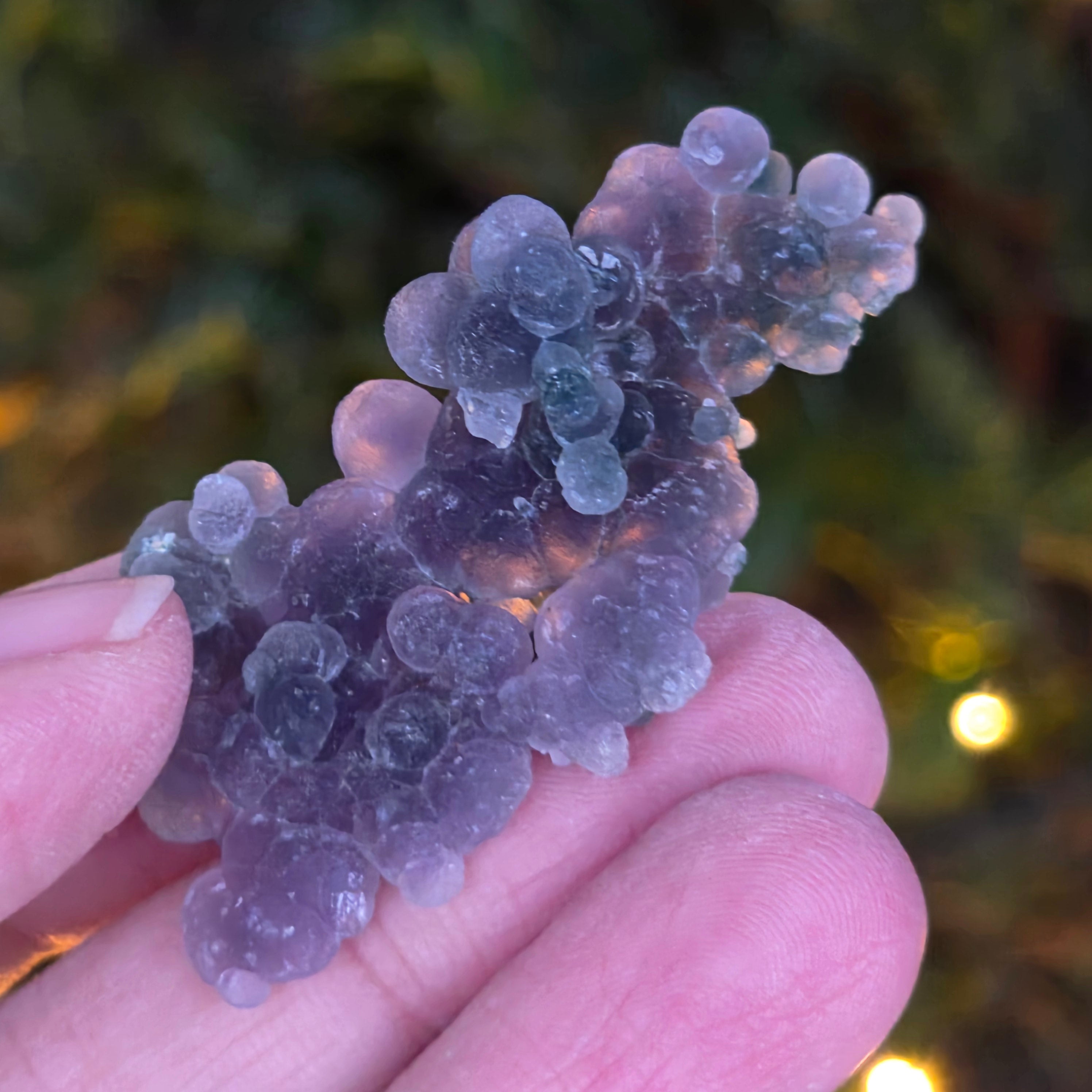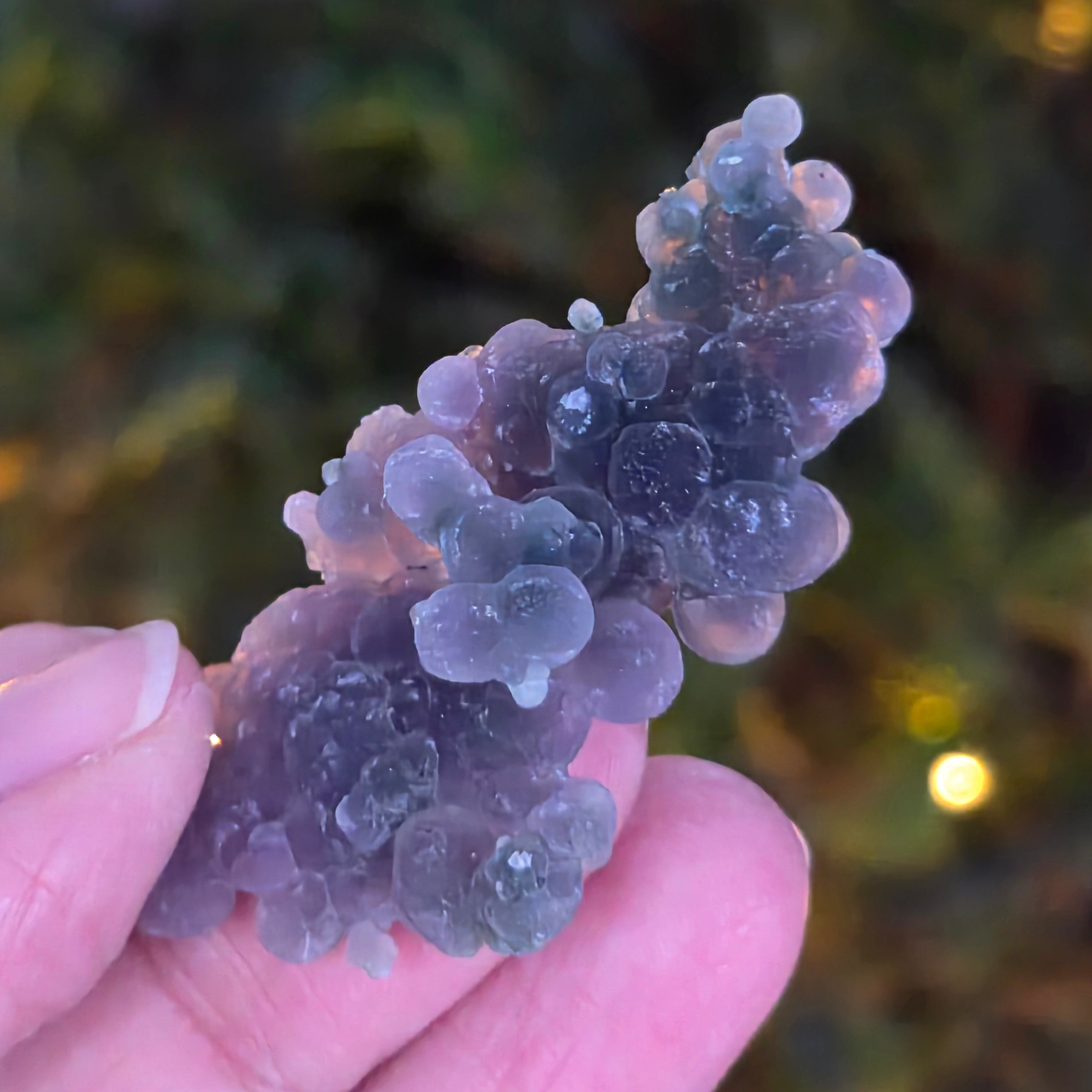 L'agate raisin se distingue par ses motifs uniques, qui ressemblent à des raisins. Ces motifs peuvent généralement être sphériques ou elliptiques, disposés de manière régulière ou aléatoire à la surface de la pierre. La couleur de l'agate raisin peut varier des tons violets, roses, bleus, verts et marron jusqu'à des nuances plus neutres telles que le gris et le blanc.