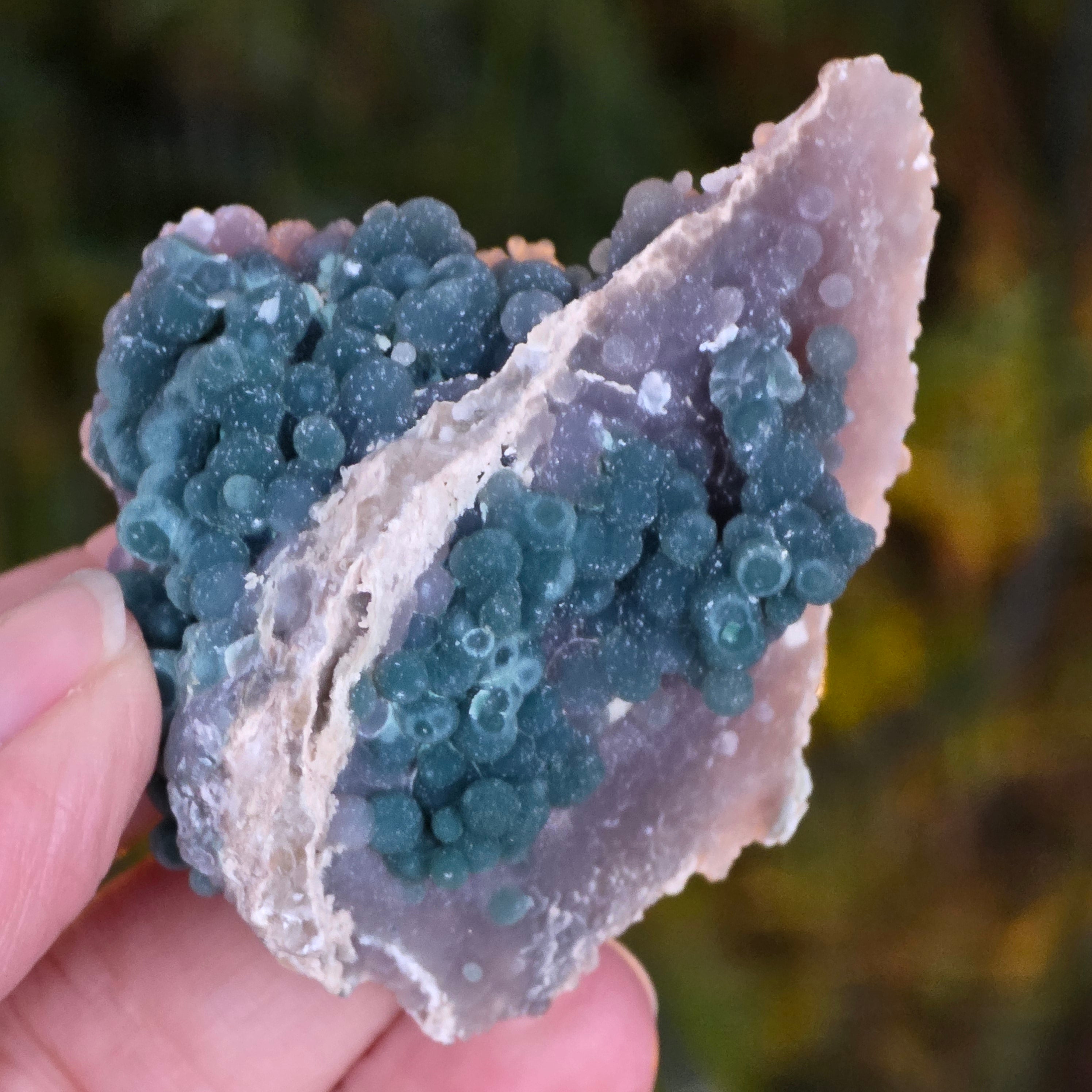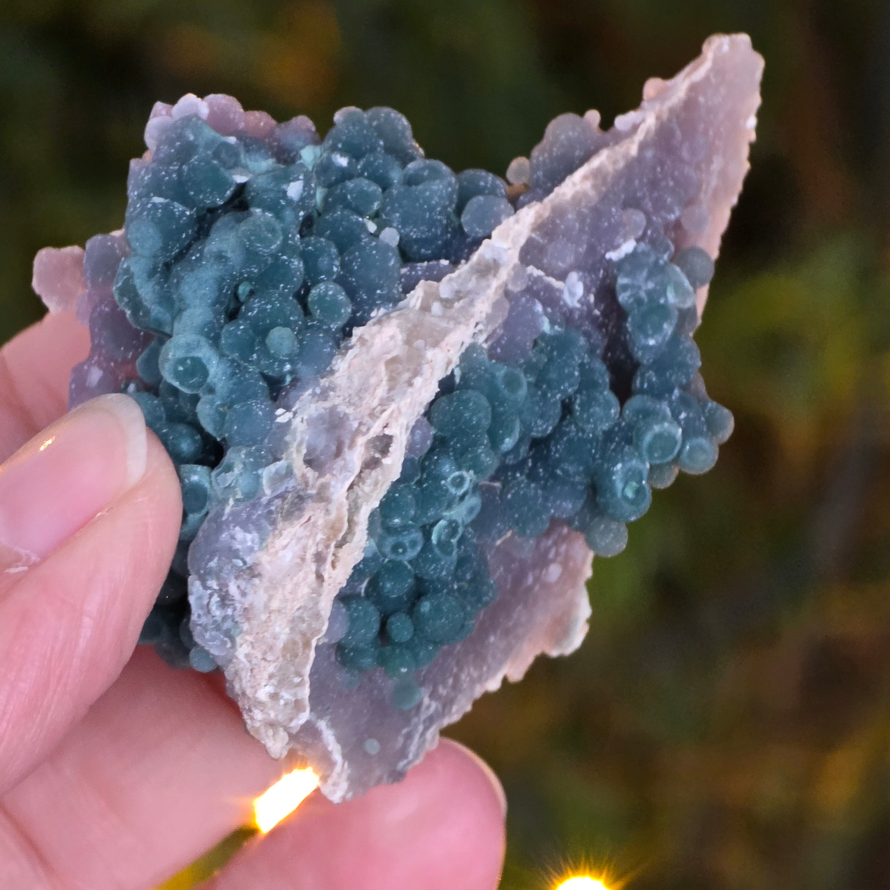 L'agate grappe se forme dans les cavités des roches volcaniques, où des solutions riches en silicium se refroidissent et cristallisent, créant le motif distinctif de la grappe de raisin.