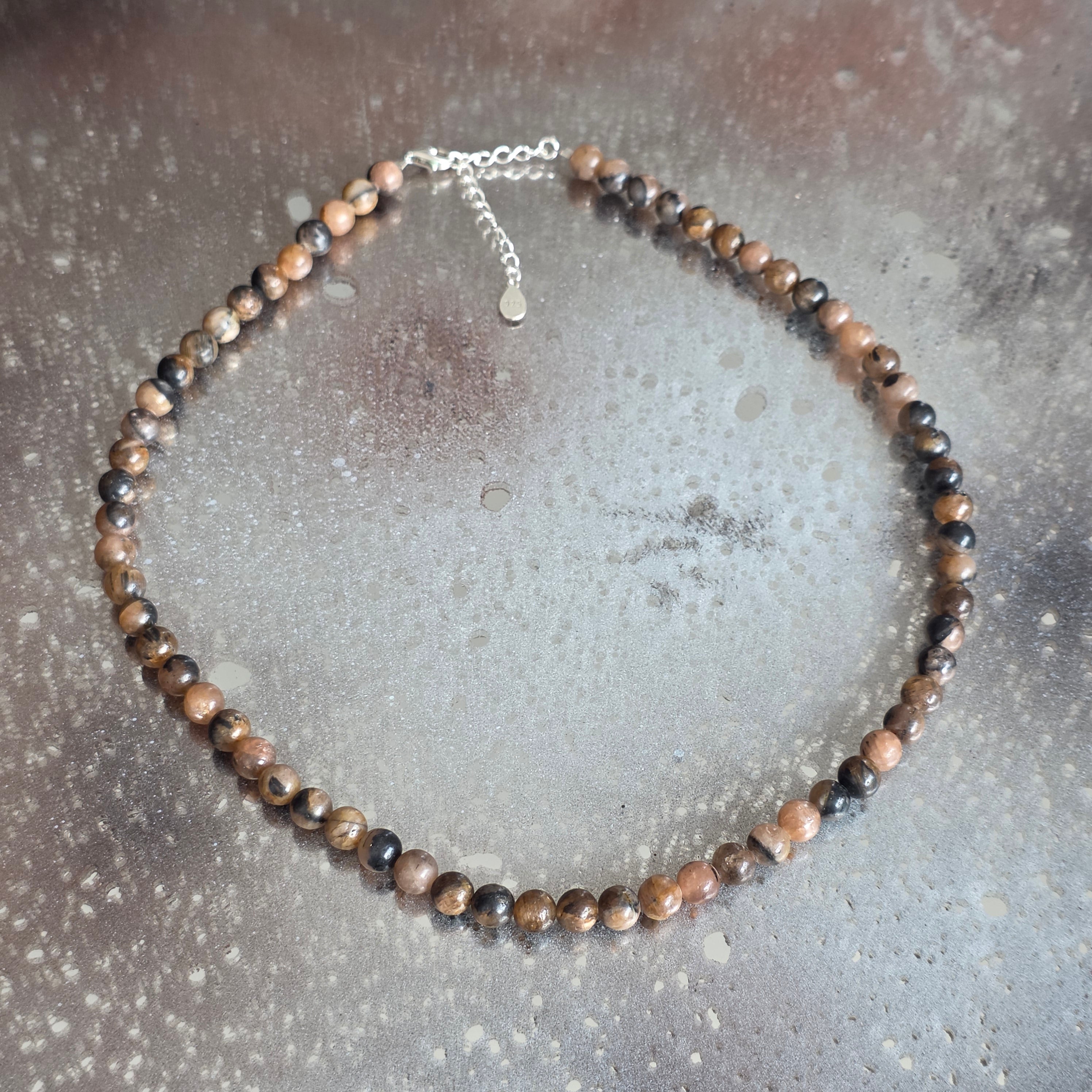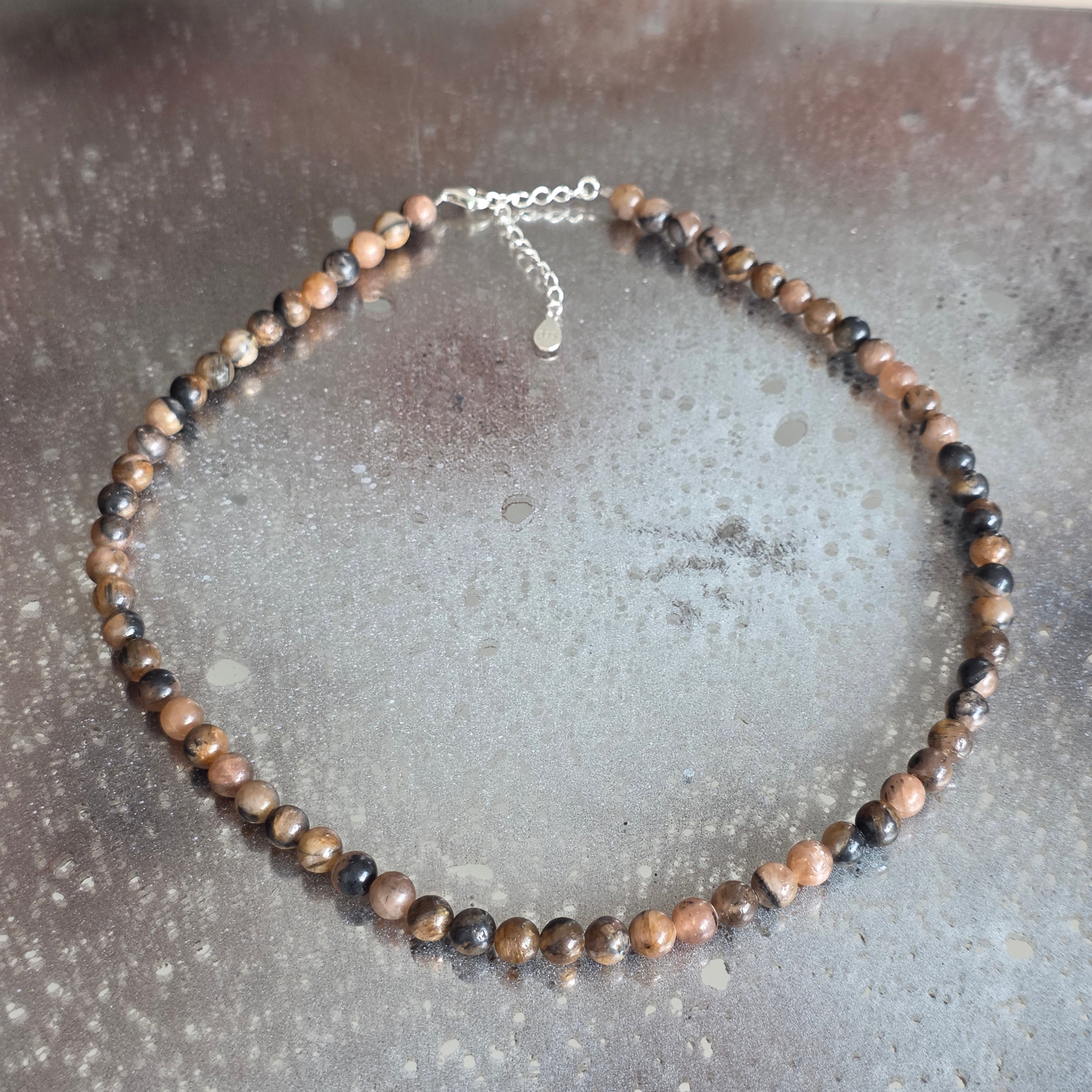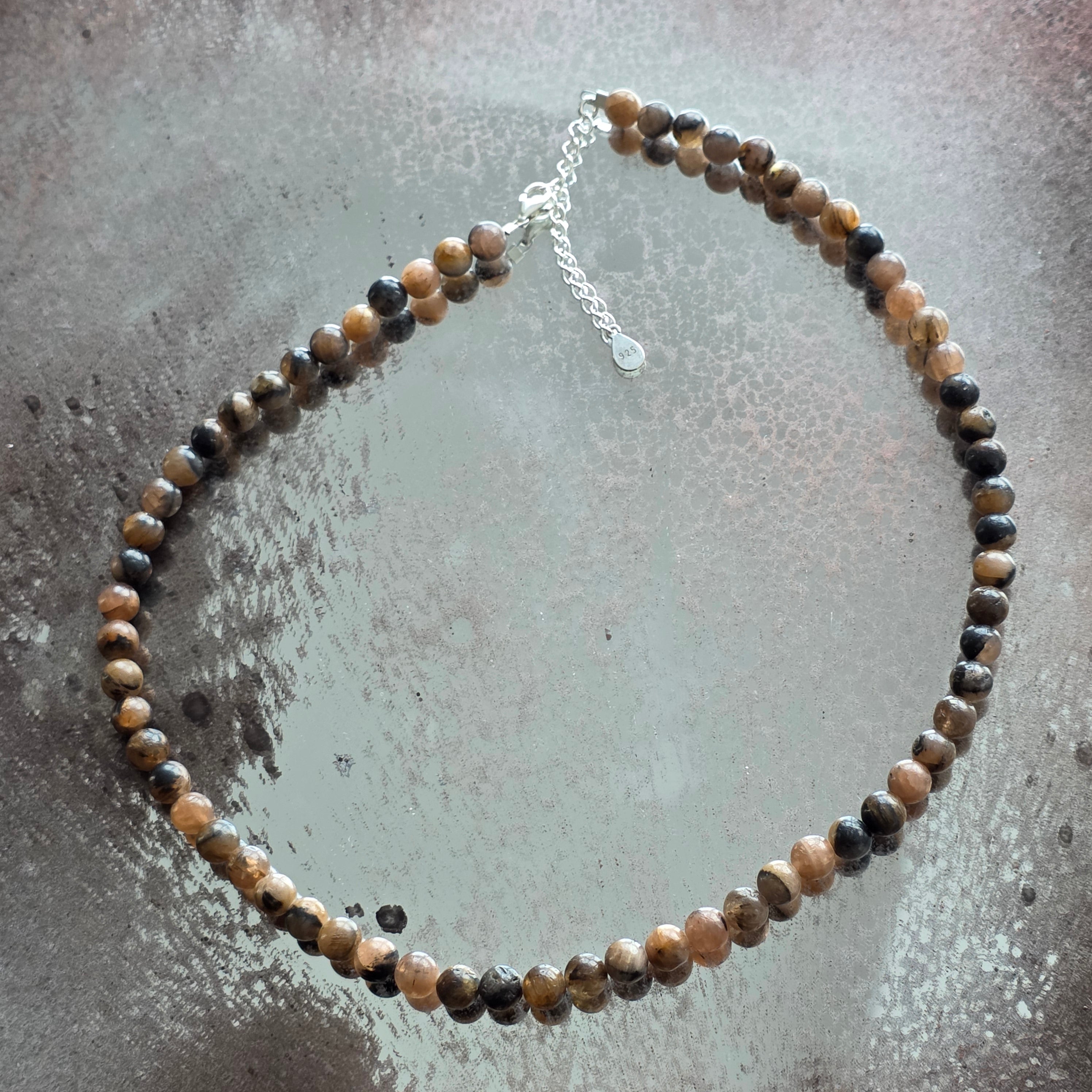 Un collier qui porte en lui l'empreinte du sacré et du mystère. La chiastolite, également connue sous le nom de « pierre de la croix », révèle dans sa structure naturelle un symbole ancestral de protection et de lien avec le divin. Les perles de 6 mm tissent des tons chauds de brun, gris et ocre, chacune portant la croix cachée au cœur de la pierre, comme un sceau de l'équilibre entre la lumière et l'obscurité.