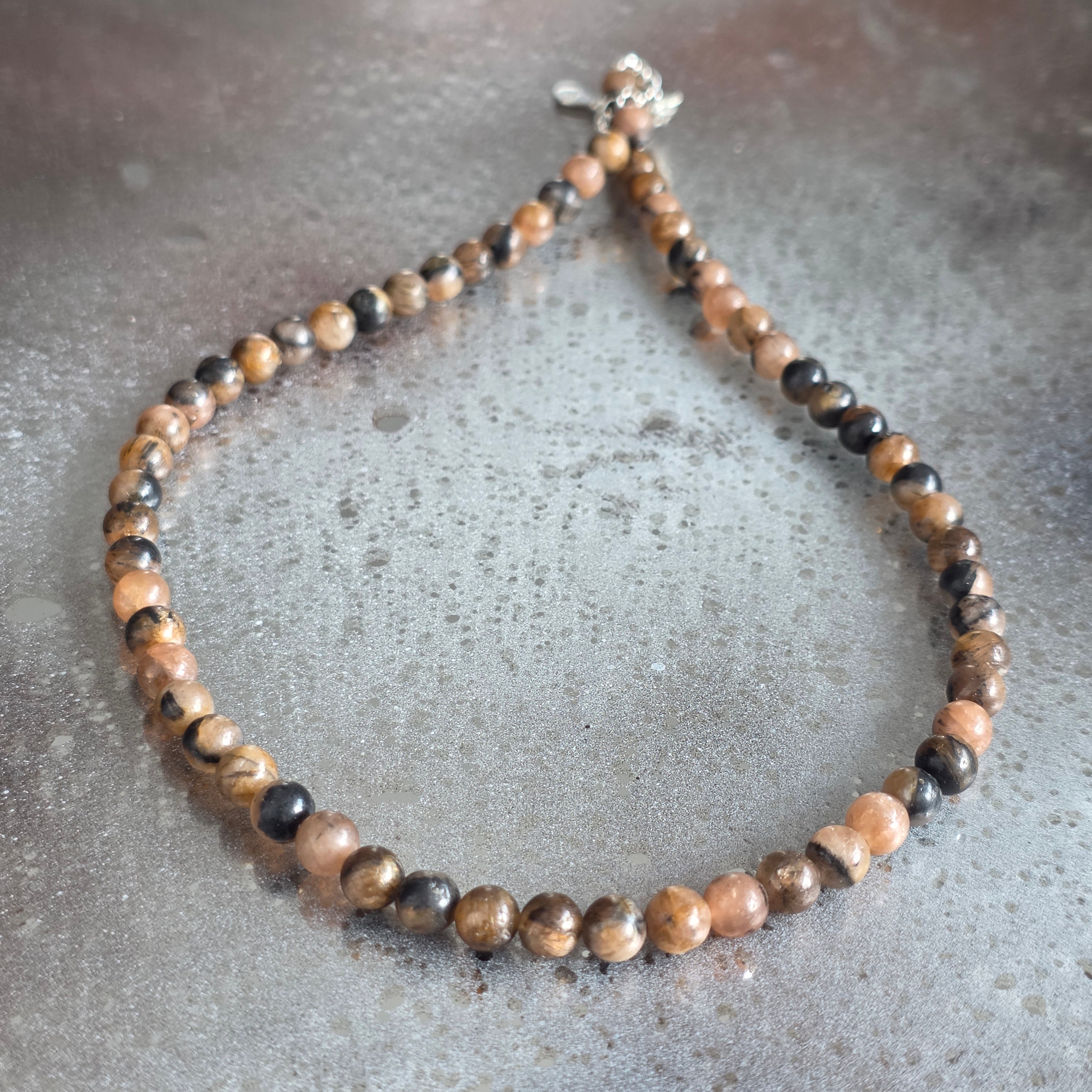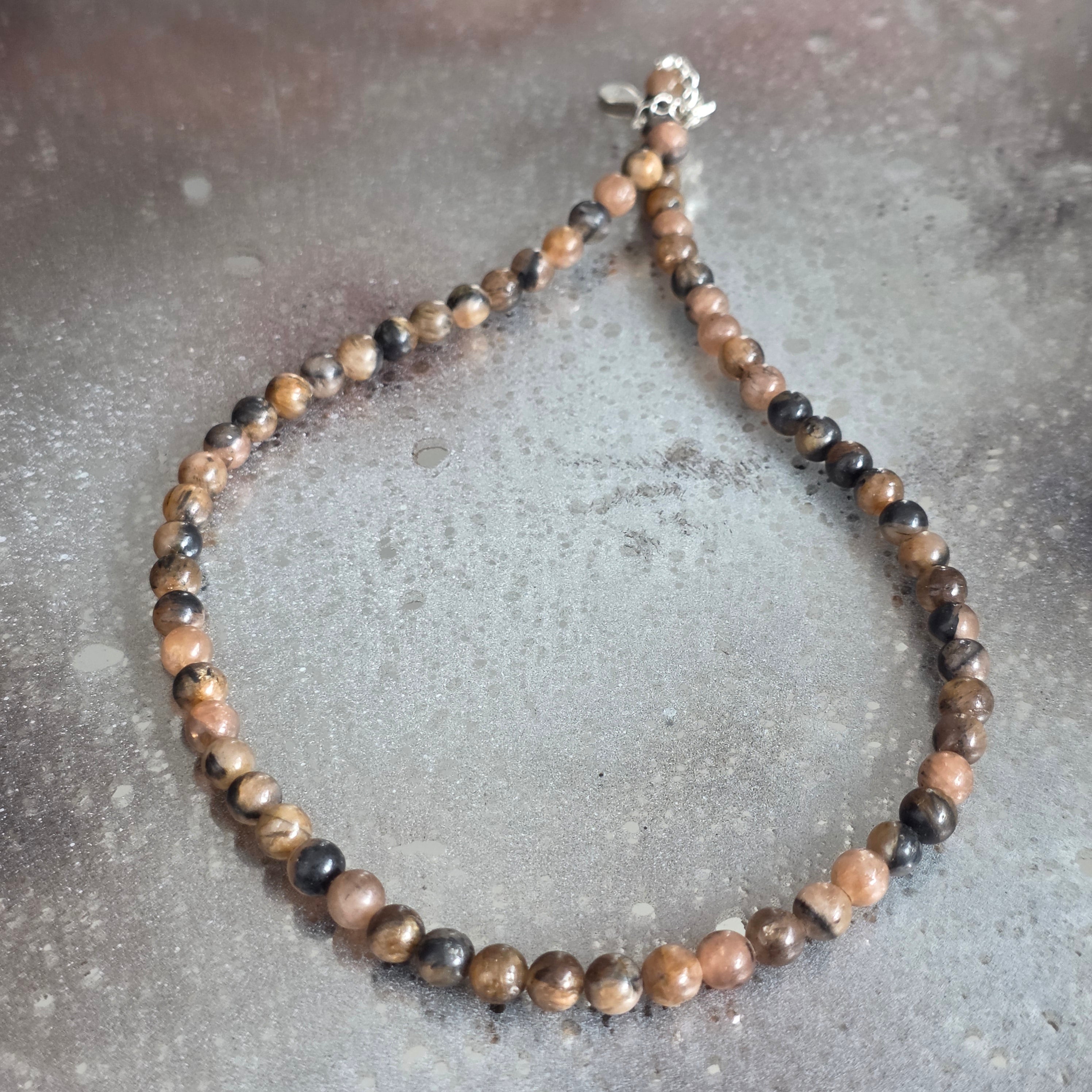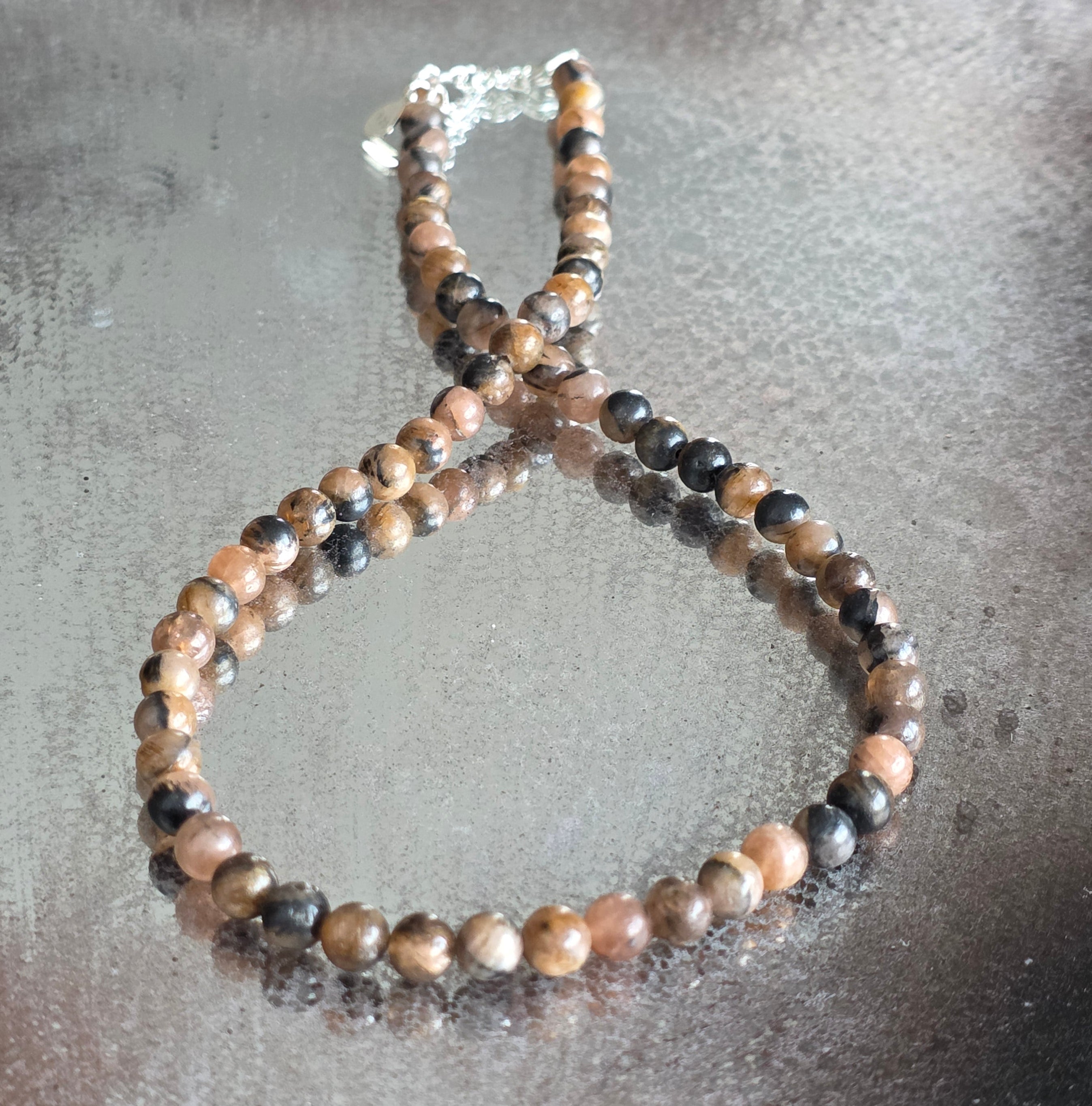 Un collier qui porte en lui l'empreinte du sacré et du mystère. La chiastolite, également connue sous le nom de « pierre de la croix », révèle dans sa structure naturelle un symbole ancestral de protection et de lien avec le divin. Les perles de 6 mm tissent des tons chauds de brun, gris et ocre, chacune portant la croix cachée au cœur de la pierre, comme un sceau de l'équilibre entre la lumière et l'obscurité.