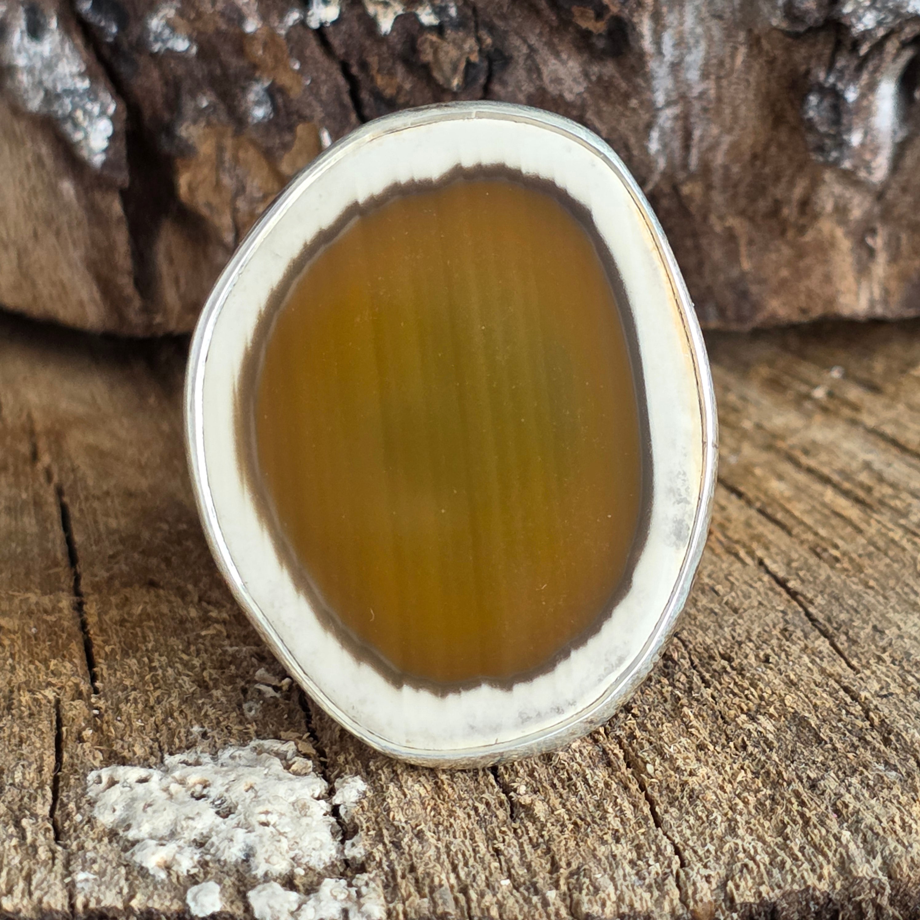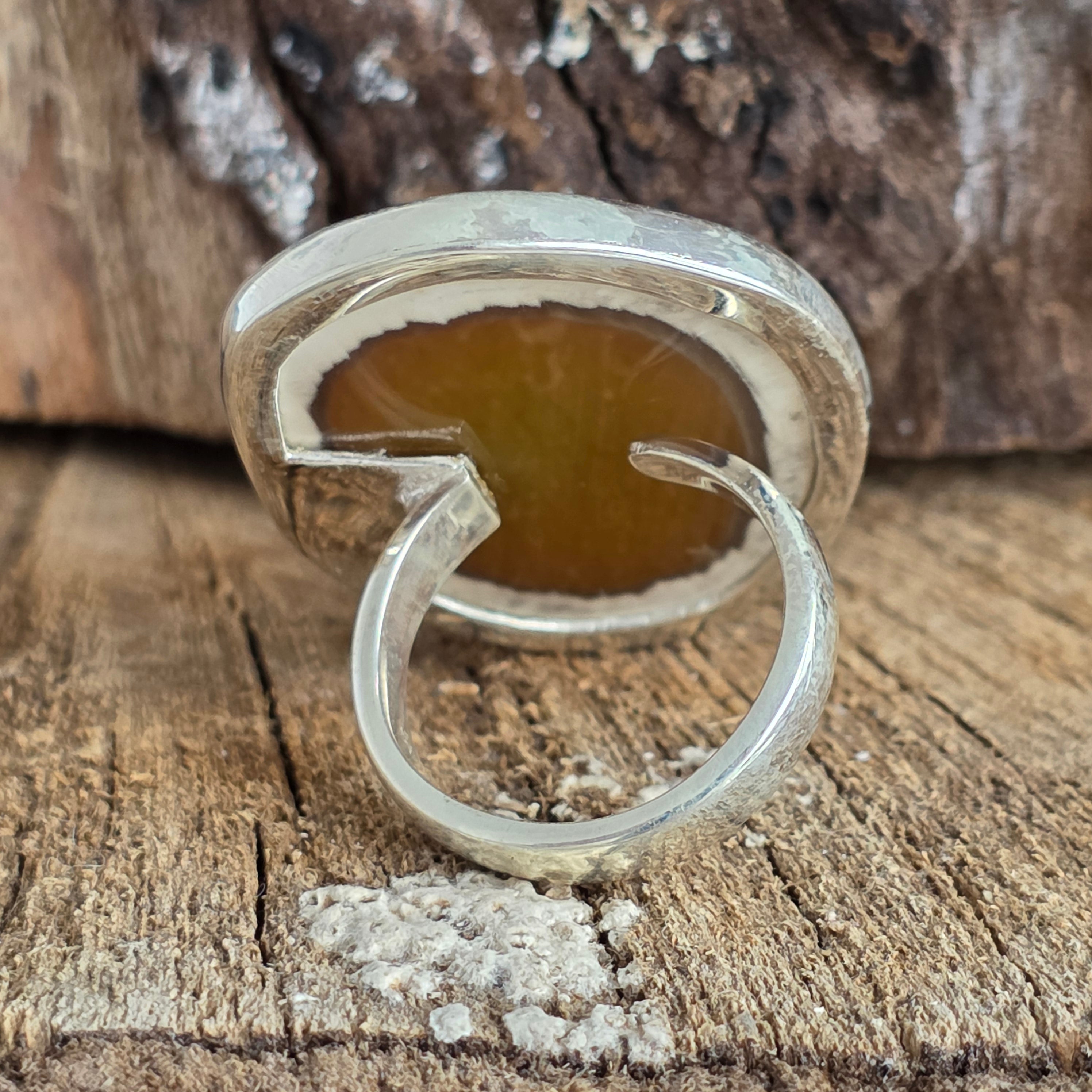 Cette bague en argent avec Jaspe Impérial naturel révèle la beauté authentique d’une pierre reconnue pour ses couleurs chaudes et ses motifs uniques. La teinte centrale vert-olive, encadrée d’un bord crème distinct, confère un aspect organique et raffiné, transformant chaque pièce en une création unique.