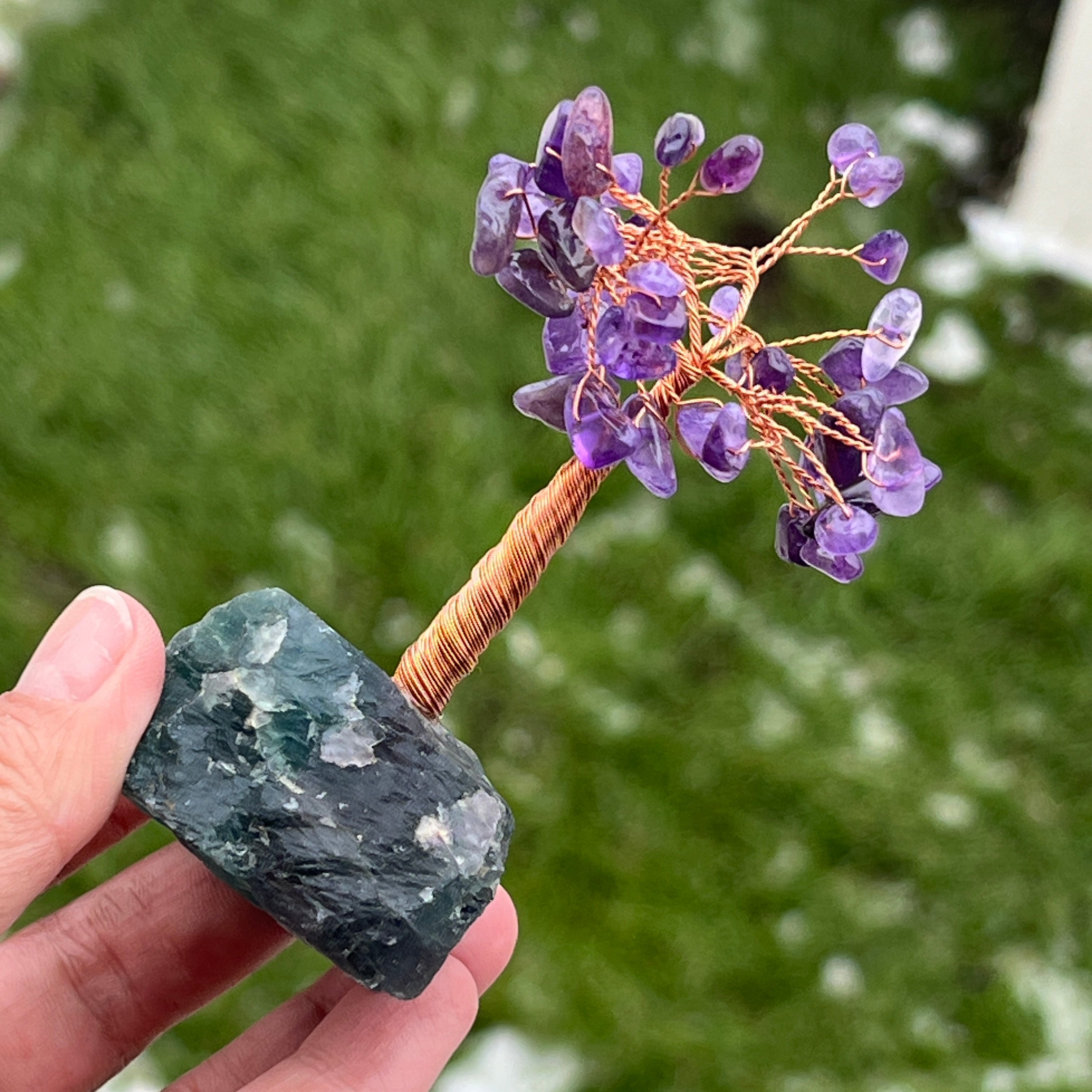 Cet arbre feng shui est fabriqué à la main à partir de cristaux naturels et de matériaux soigneusement sélectionnés pour soutenir le flux harmonieux d'énergie dans votre espace. Les feuilles sont en améthyste – une pierre reconnue en feng shui pour le calme et la clarté mentale qu'elle apporte –, tandis que la base est composée de quartz rose brut, symbole d'amour inconditionnel et de guérison émotionnelle.