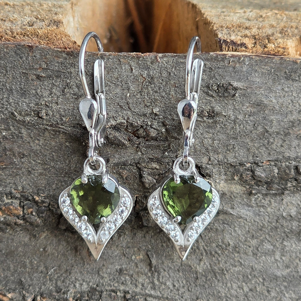 Ces élégants boucles d'oreilles en argent 925 combinent la beauté rare du Moldavit naturel, poncé sous la forme d'un cœur, avec l'éclat discrète des zircons transparents qui l'entourent. Le design "Drop Drop" ajoute la féminité et la grâce, les transformant en une pièce polyvalente, adaptée aux événements quotidiens et spéciaux.