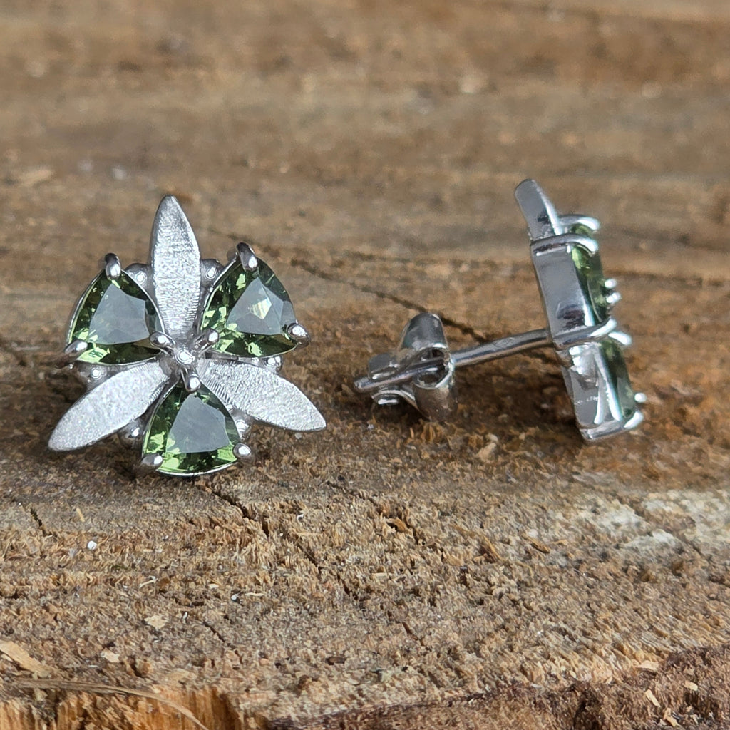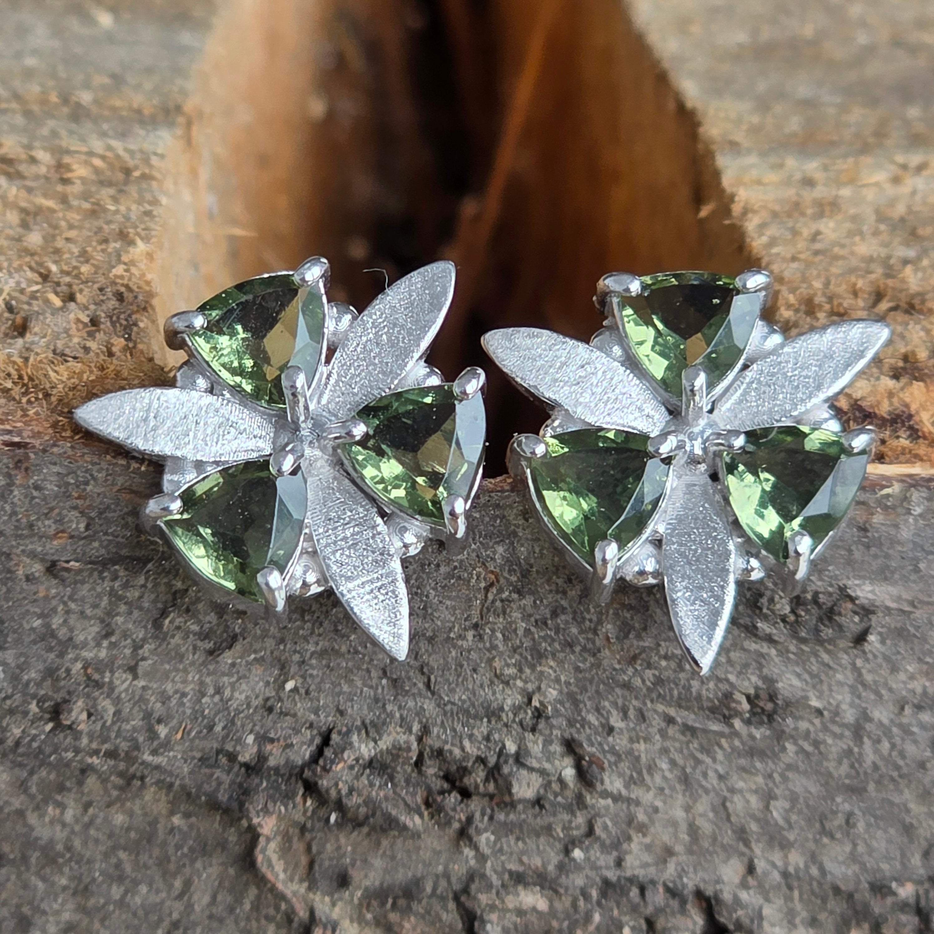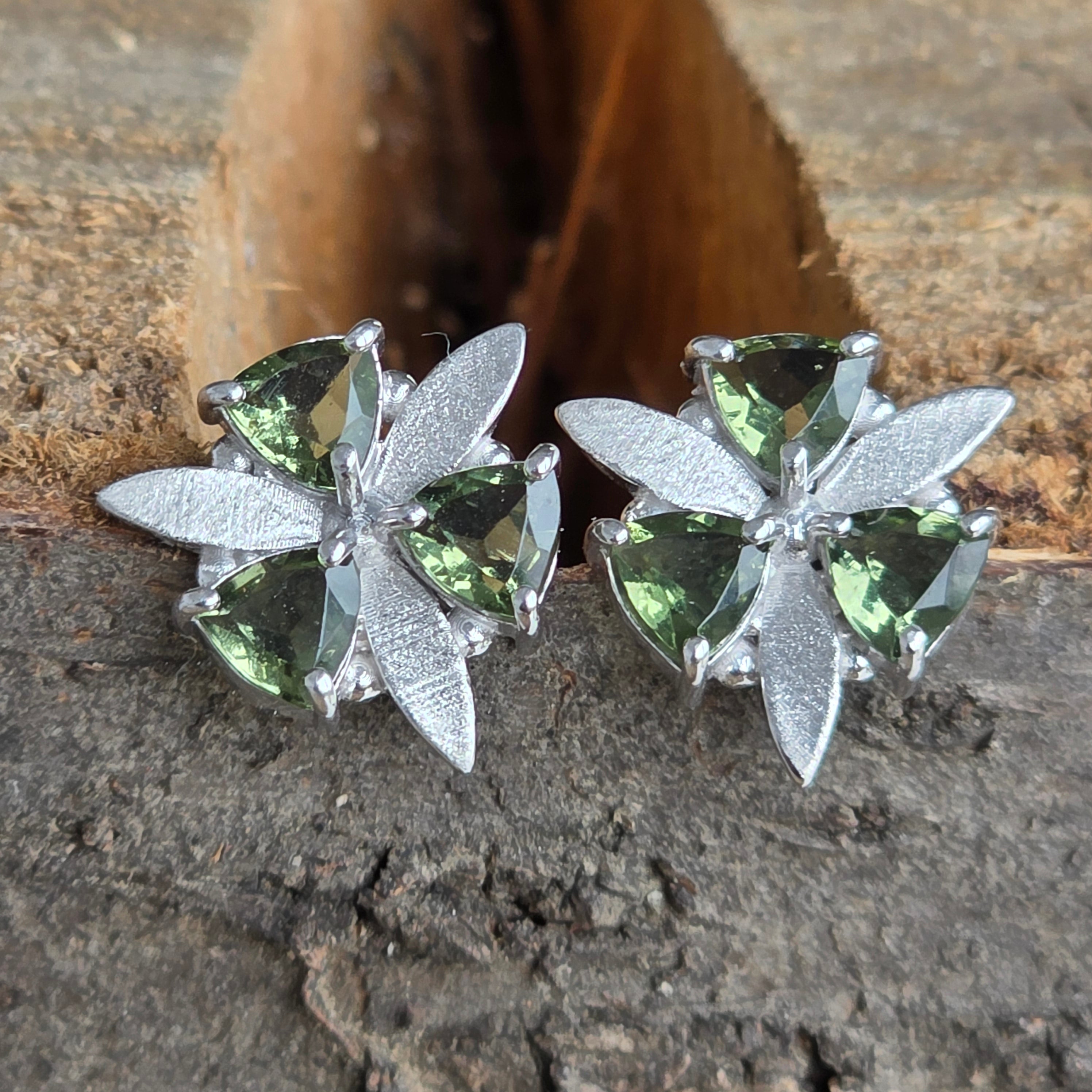 Ces élégants boucles d'oreilles en argent 925 apportent la beauté naturelle de Moldavit à une inspiration florale. Chaque boucle d'oreille est constituée de pierres de moldivit à trois facettes, disposées harmonieusement comme les pétales d'une fleur rare, qui combine la délicatesse de la conception avec la vibration de pierre unique.