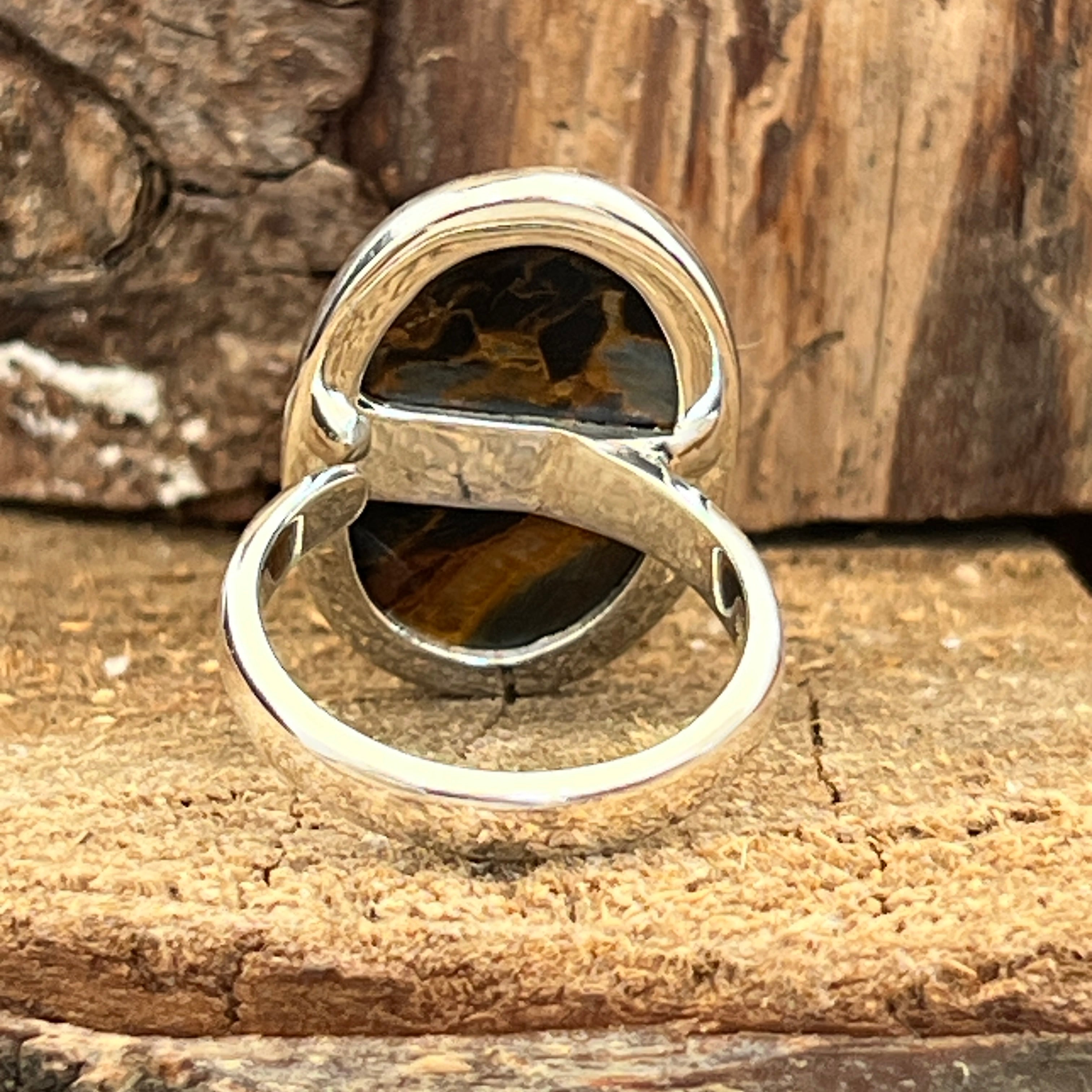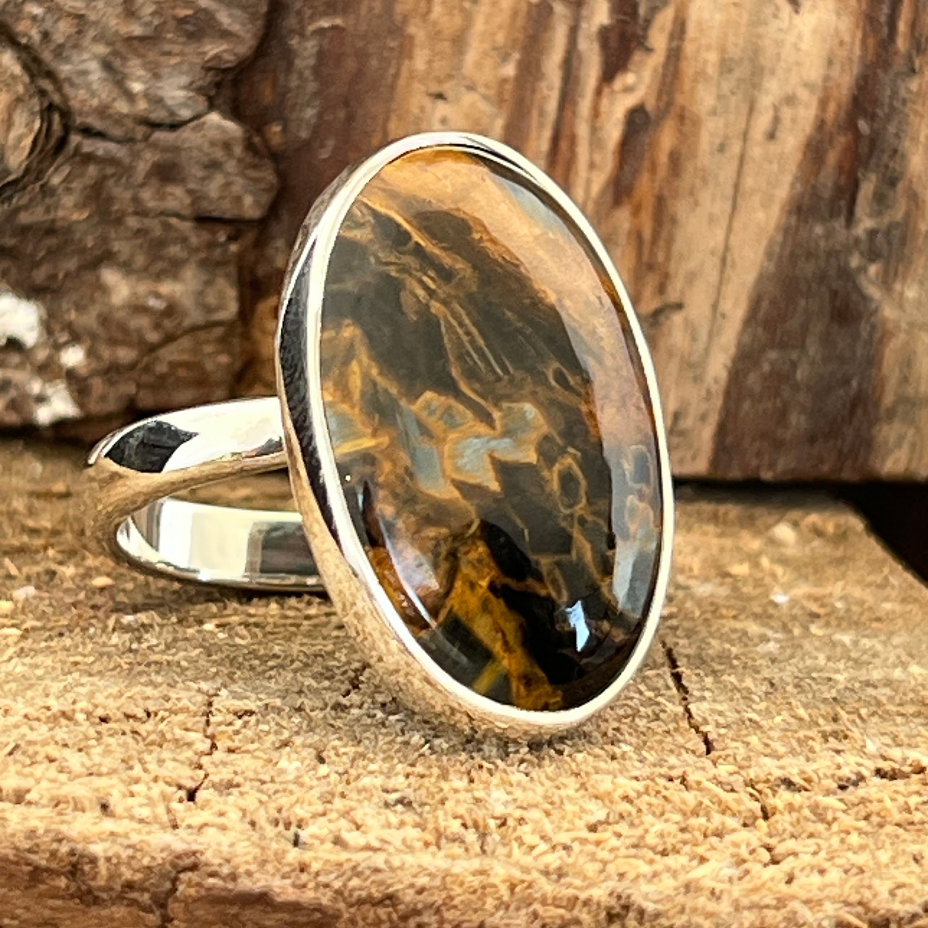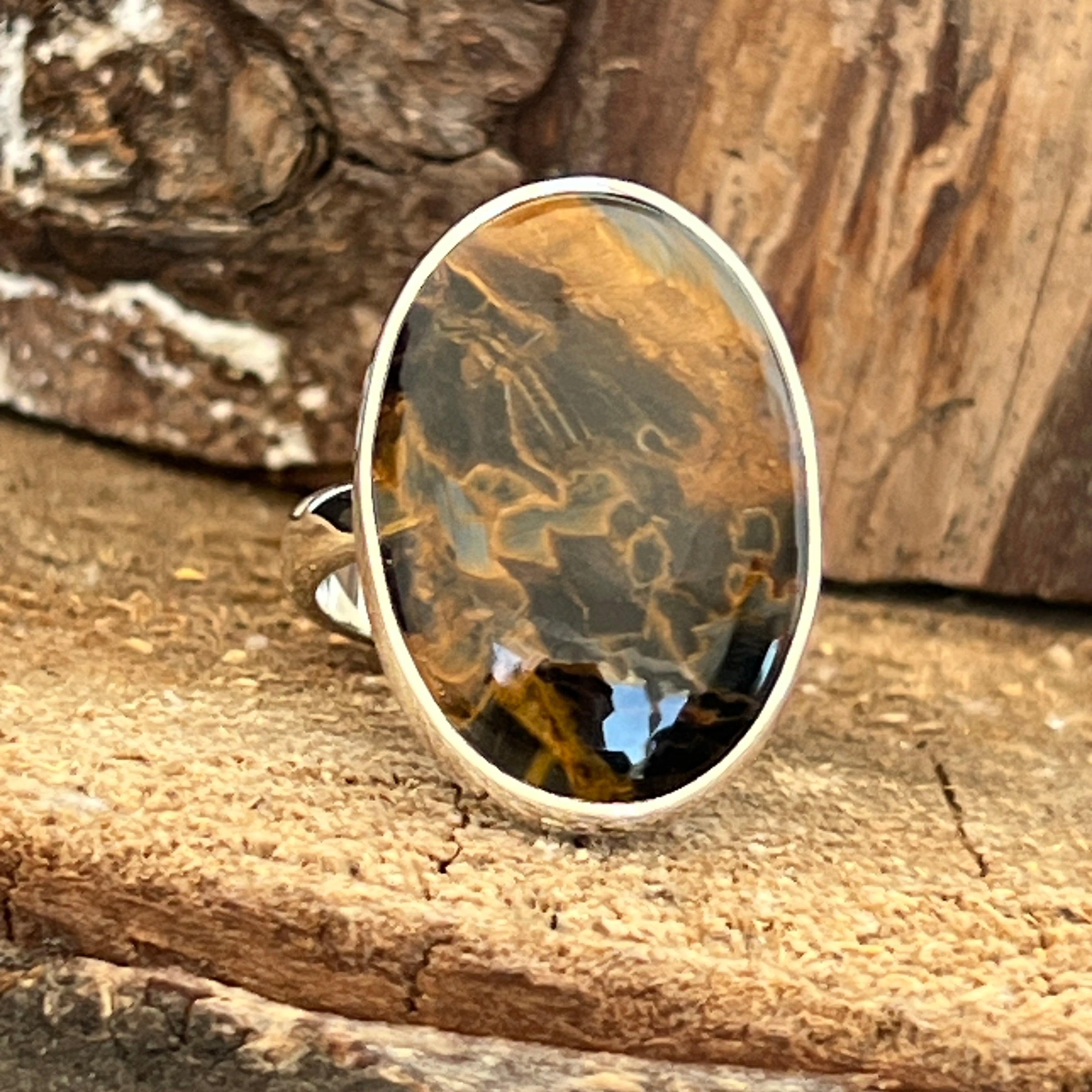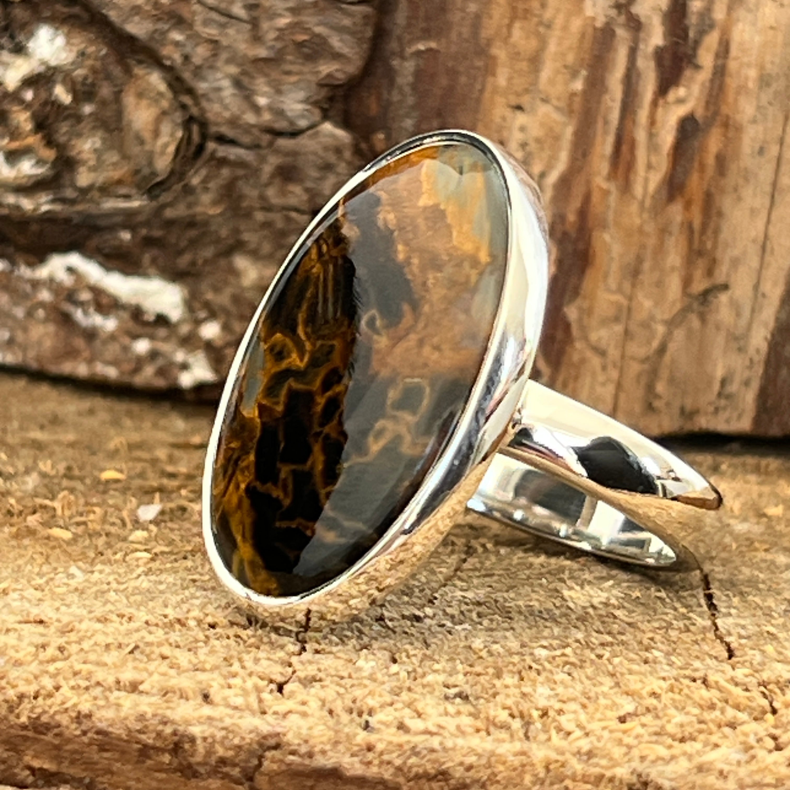Cet anneau élégant est fait de 925 Silver et orné d'un cabochon de marché naturel, également connu sous le nom de "Storm Stone" en raison des jeux de couleur et de luminosité spectaculaires dans sa structure.