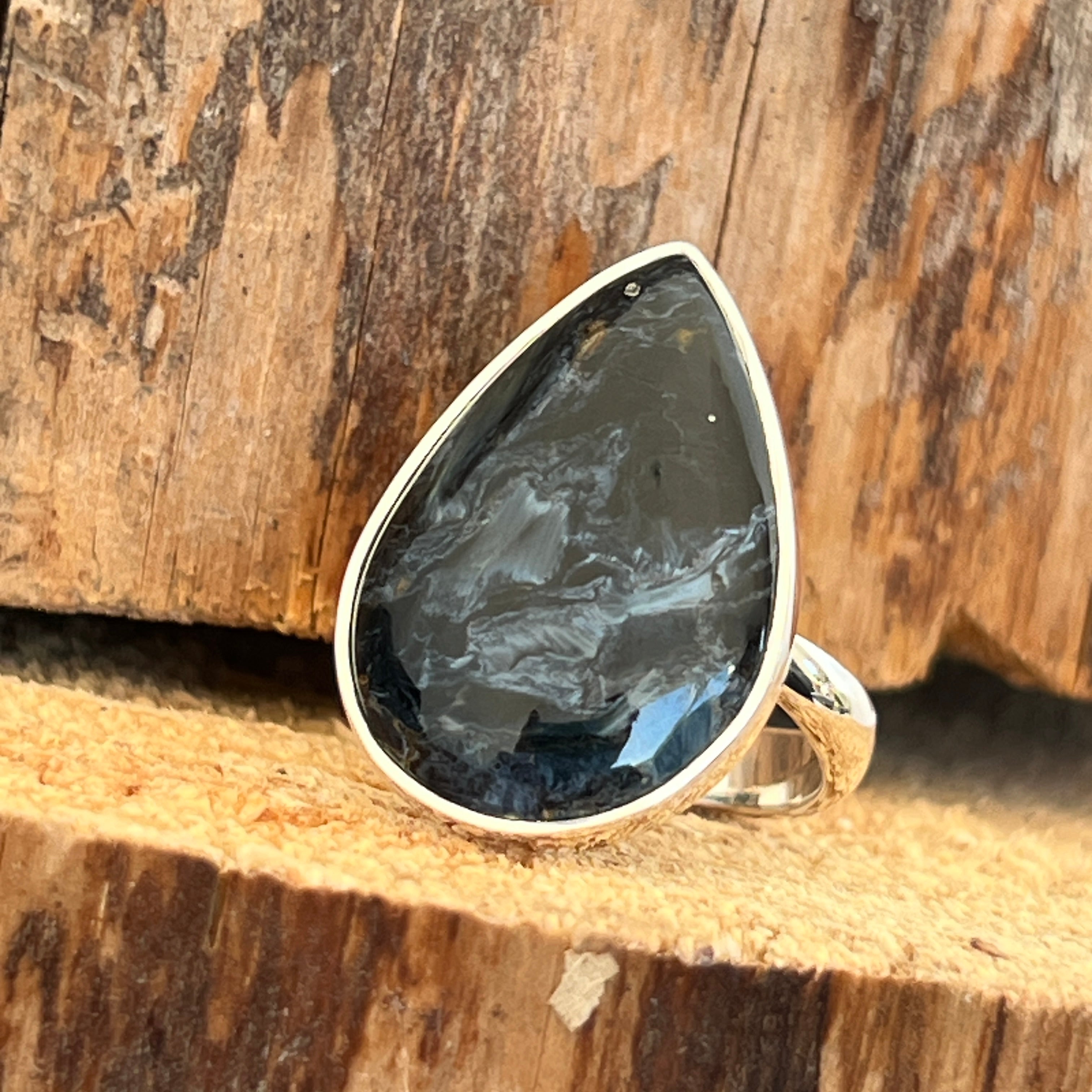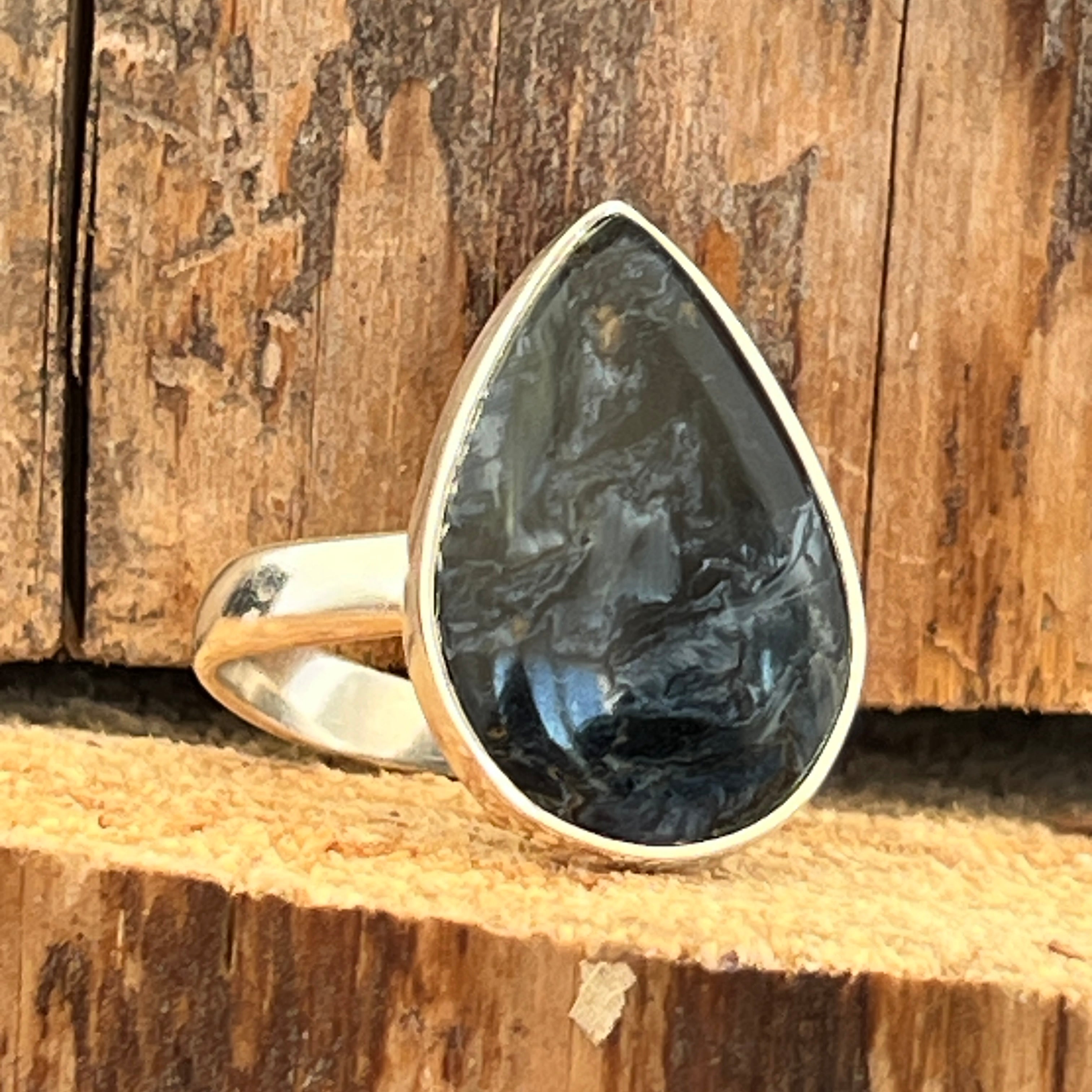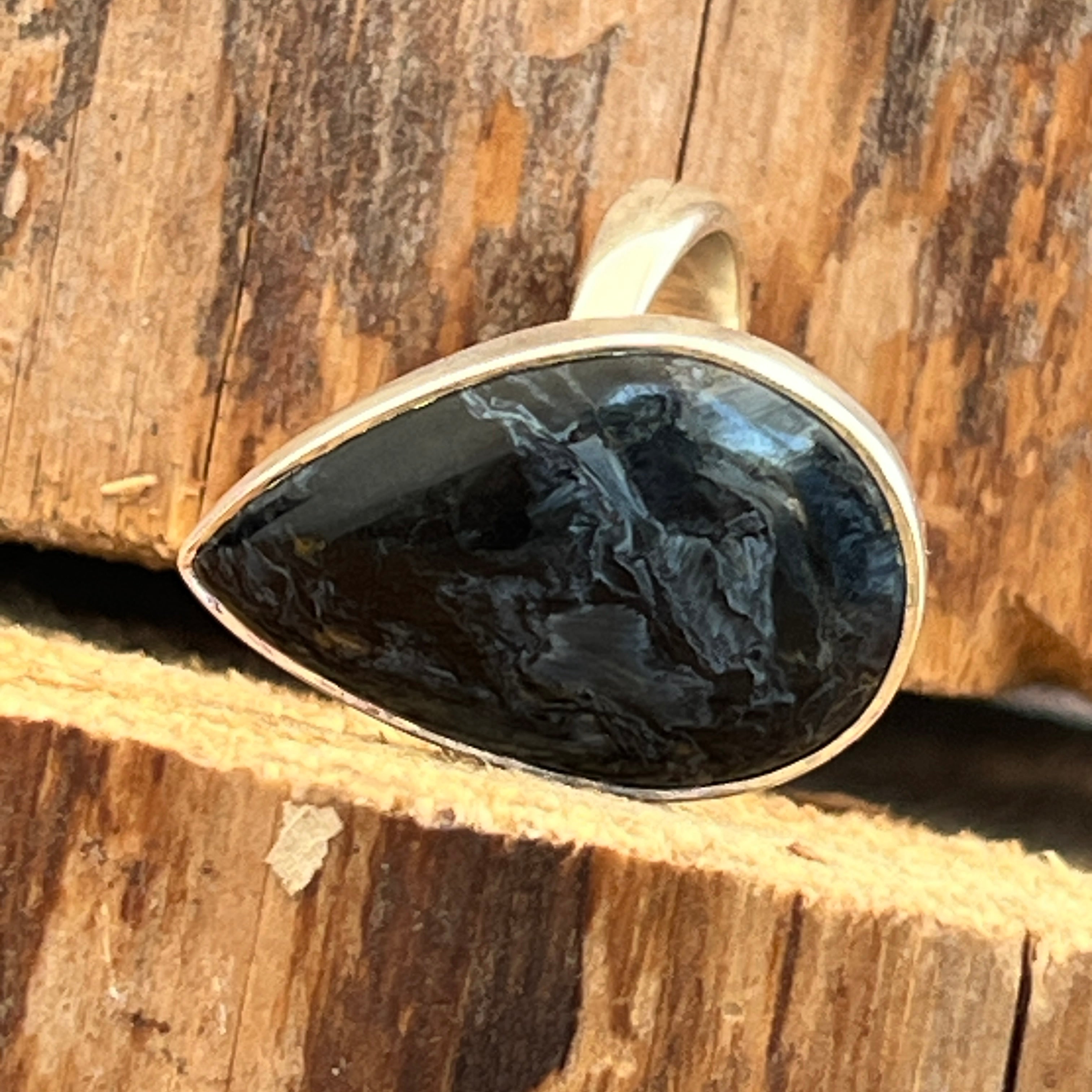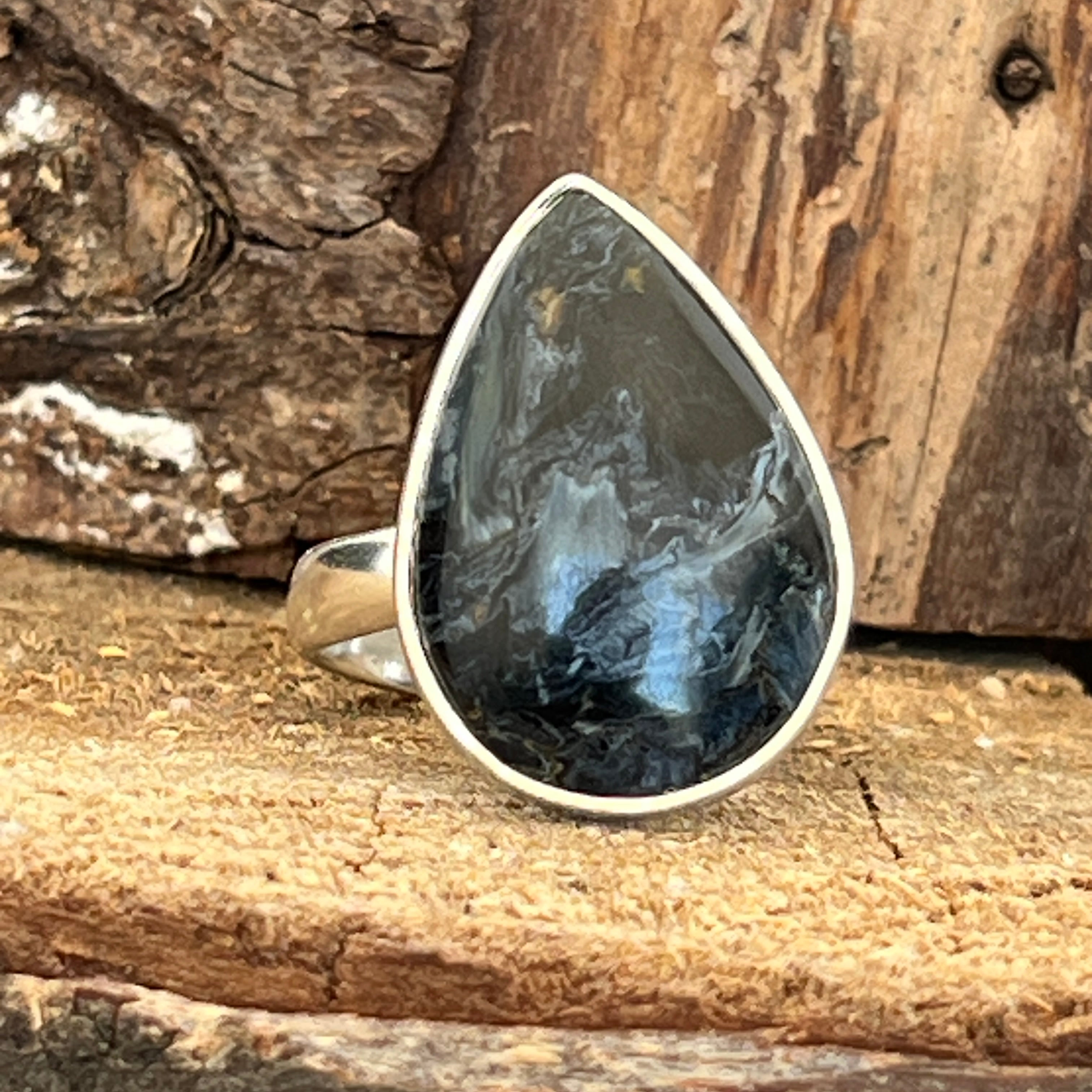Cette bague impressionnante faite de 925 Silver, est orné d'un cabochon de marché naturel sous forme de goutte. La texture de la pierre révèle des nuances profondes de réflexes bleus, noirs et or, rappelant le tourbillon vu sur le ciel nocturne.