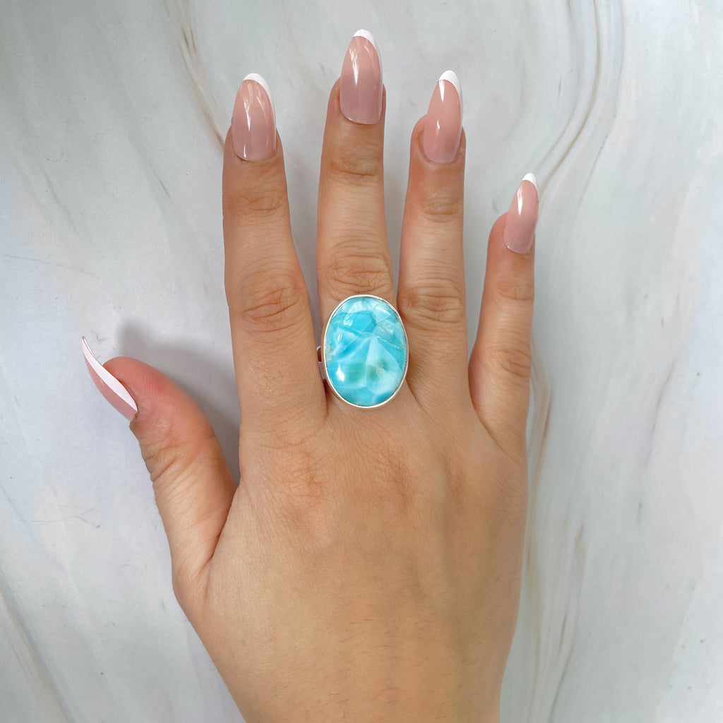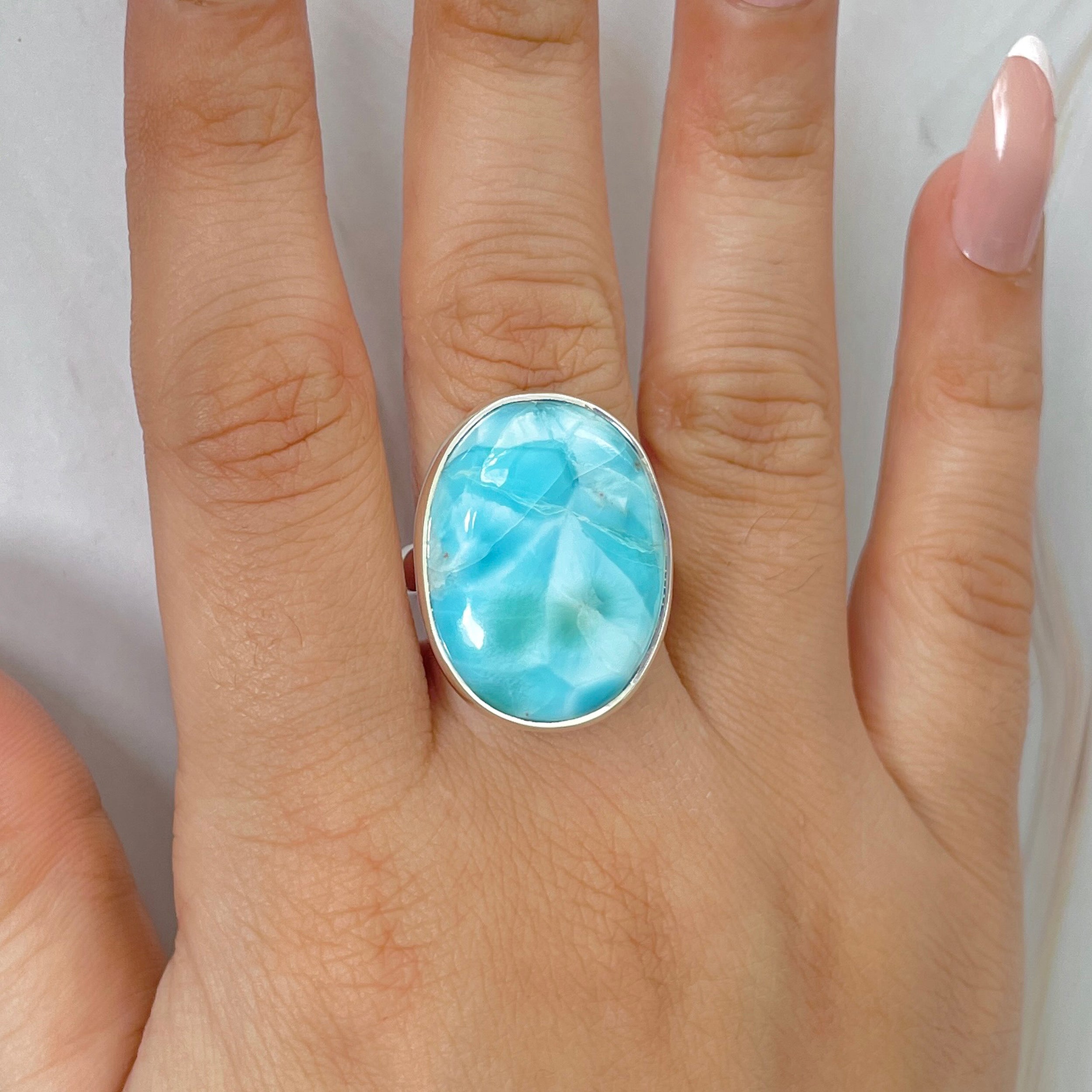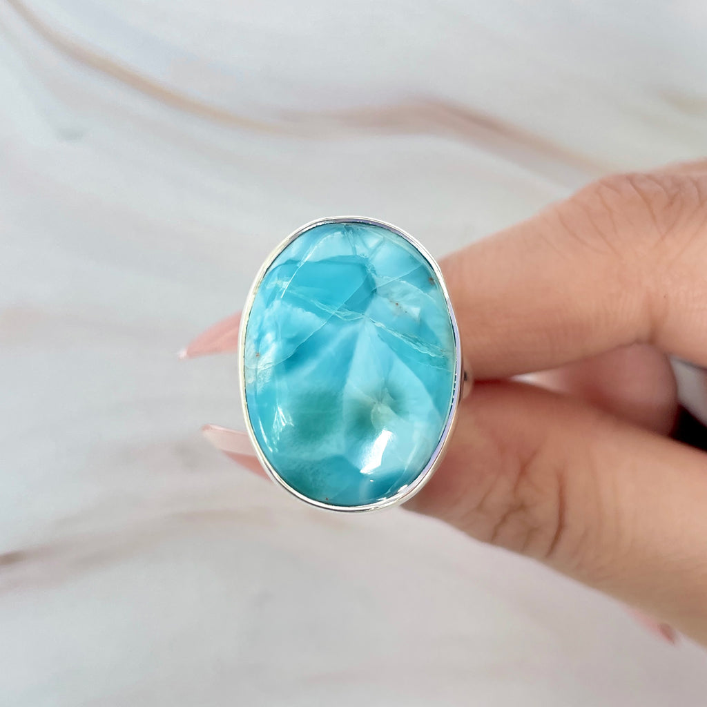 Une bague unique en larimar naturel, dite droite pierre du ciel et de l'océan. Ses nuances de bleu aqua, aux reflets blancs comme les vagues de la mer, apportent une paix intérieure et une sensation de liberté infinie.
