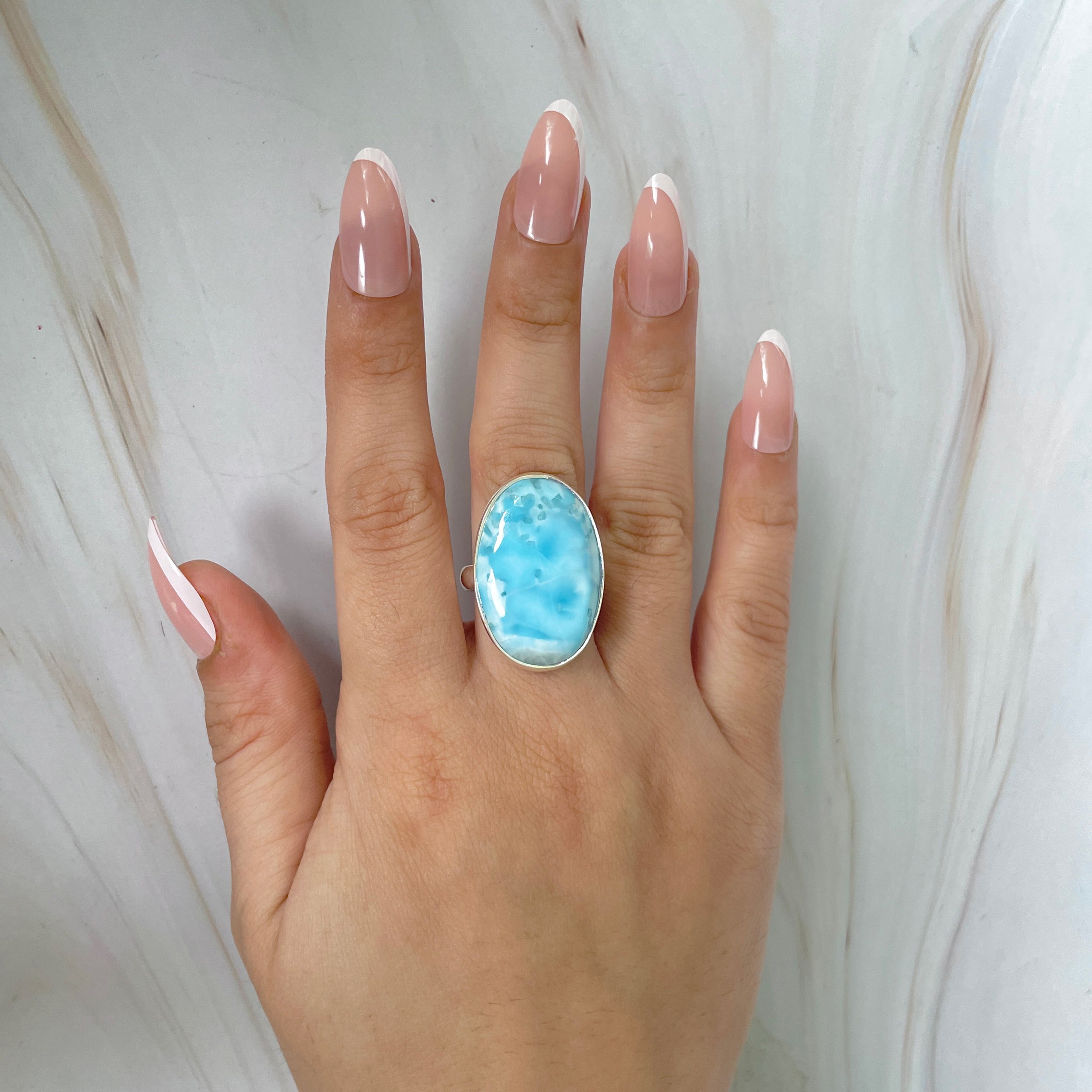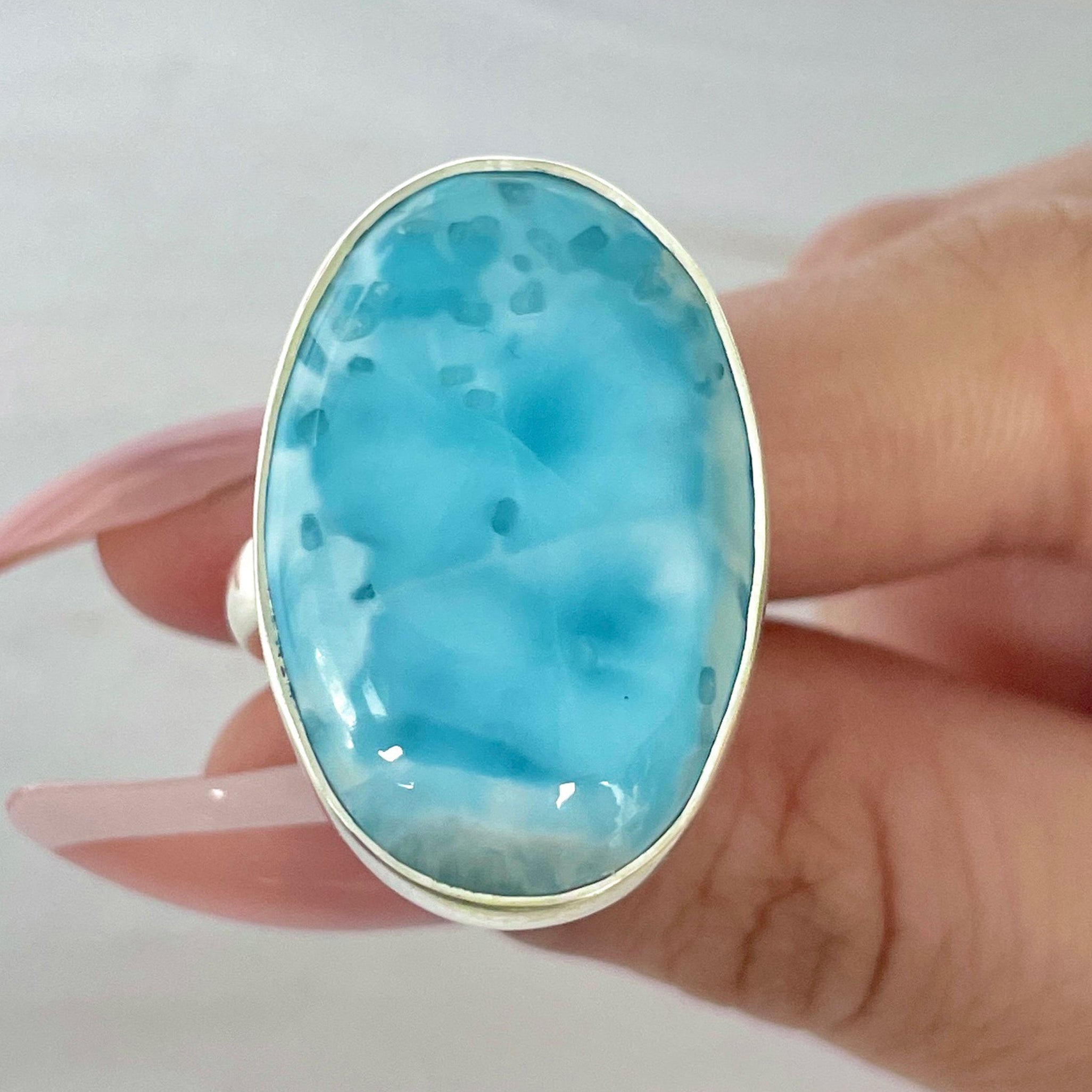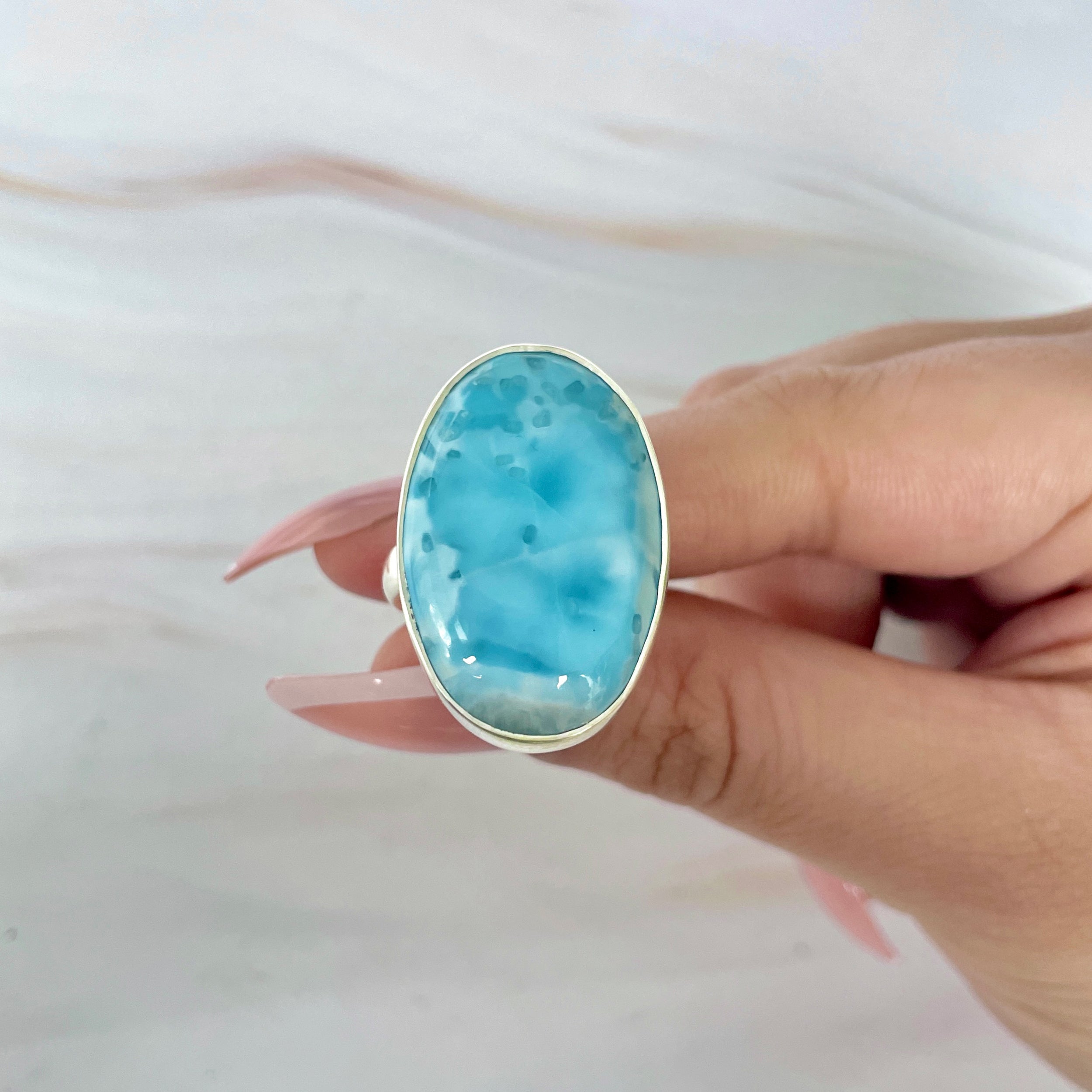 Une bague unique en larimar naturel, dite droite pierre du ciel et de l'océan. Ses nuances de bleu aqua, aux reflets blancs comme les vagues de la mer, apportent une paix intérieure et une sensation de liberté infinie.