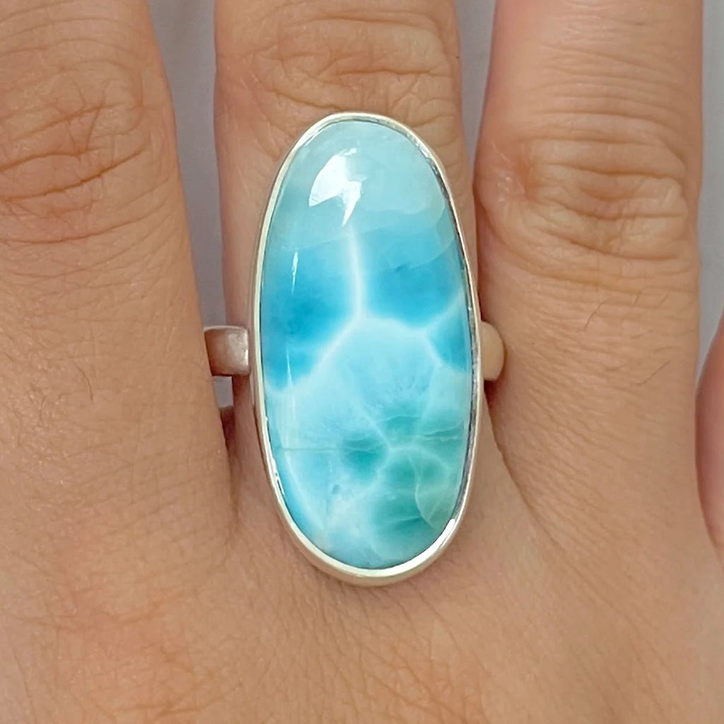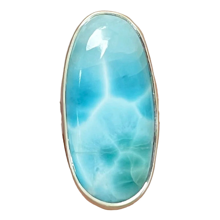 Un anneau unique avec Larimar se portant la profondeur et la tranquillité de l'océan. Son bleu translucide, saupoudré de réflexes ouverts, rappelle les vagues tropicales qui se brisent en douceur sur le rivage.