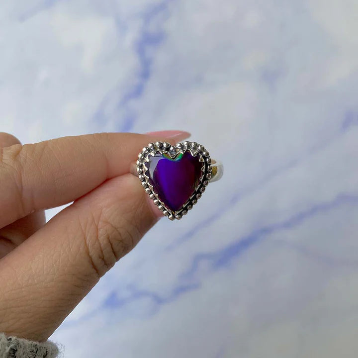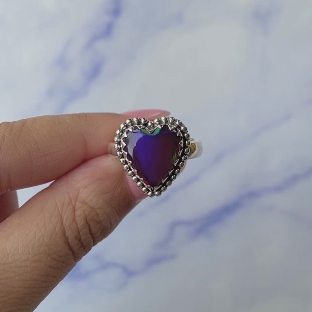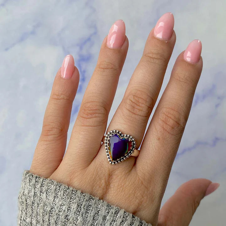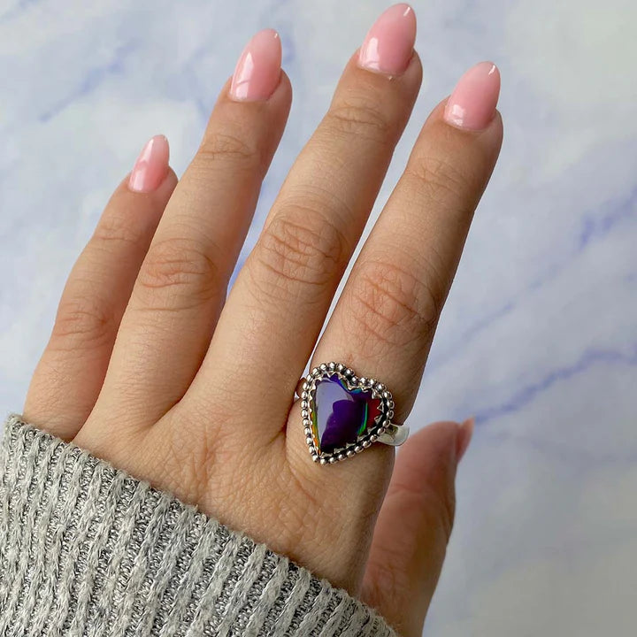 Cette bague en opale éthiopienne en forme de cœur attire le regard par ses reflets intenses dans des teintes de rouge, orange et bleu, qui dansent différemment selon la lumière. Chaque pièce est unique, et les variations naturelles de l'opale transforment cette bague en un bijou vraiment spécial.
