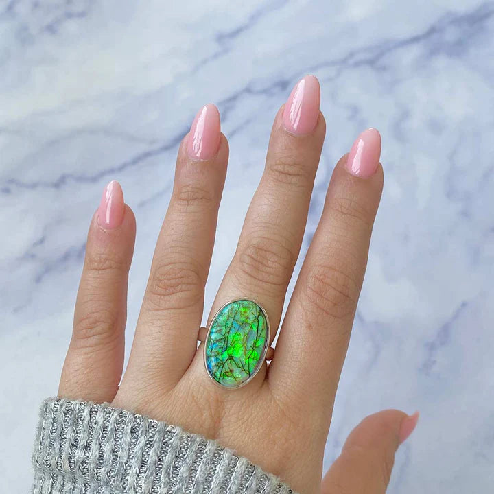 Une bague élégante et raffinée, réalisée en argent 925, avec une pierre naturelle d' opale éthiopienne, reconnue pour ses reflets irisés dans les tons vert, rouge et bleu. Le design minimaliste permet à la pierre d’être au centre de l’attention, captant la lumière sous tous les angles.