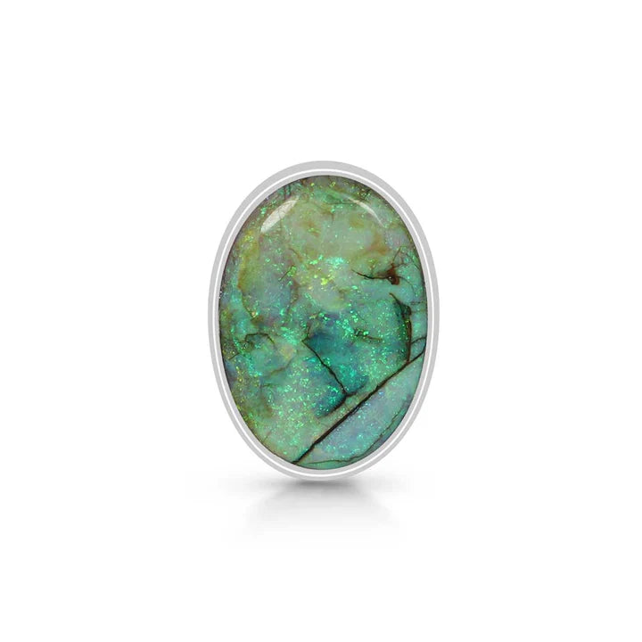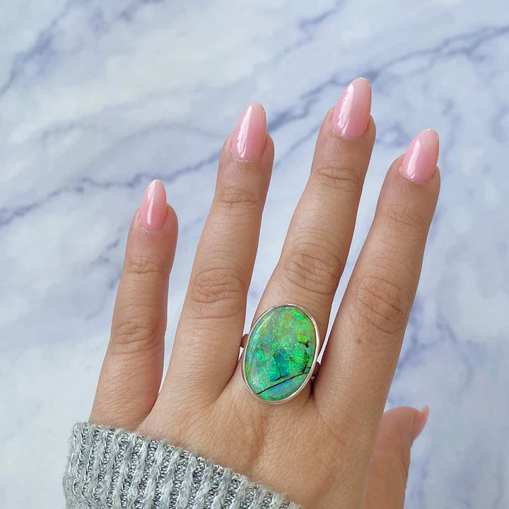 Une bague élégante et raffinée, réalisée en argent 925, avec une pierre naturelle d' opale éthiopienne, connue pour ses reflets irisés dans des nuances de vert, rouge et bleu. Le design minimaliste permet à la pierre d'être au centre de l'attention, captant la lumière sous tous les angles.
