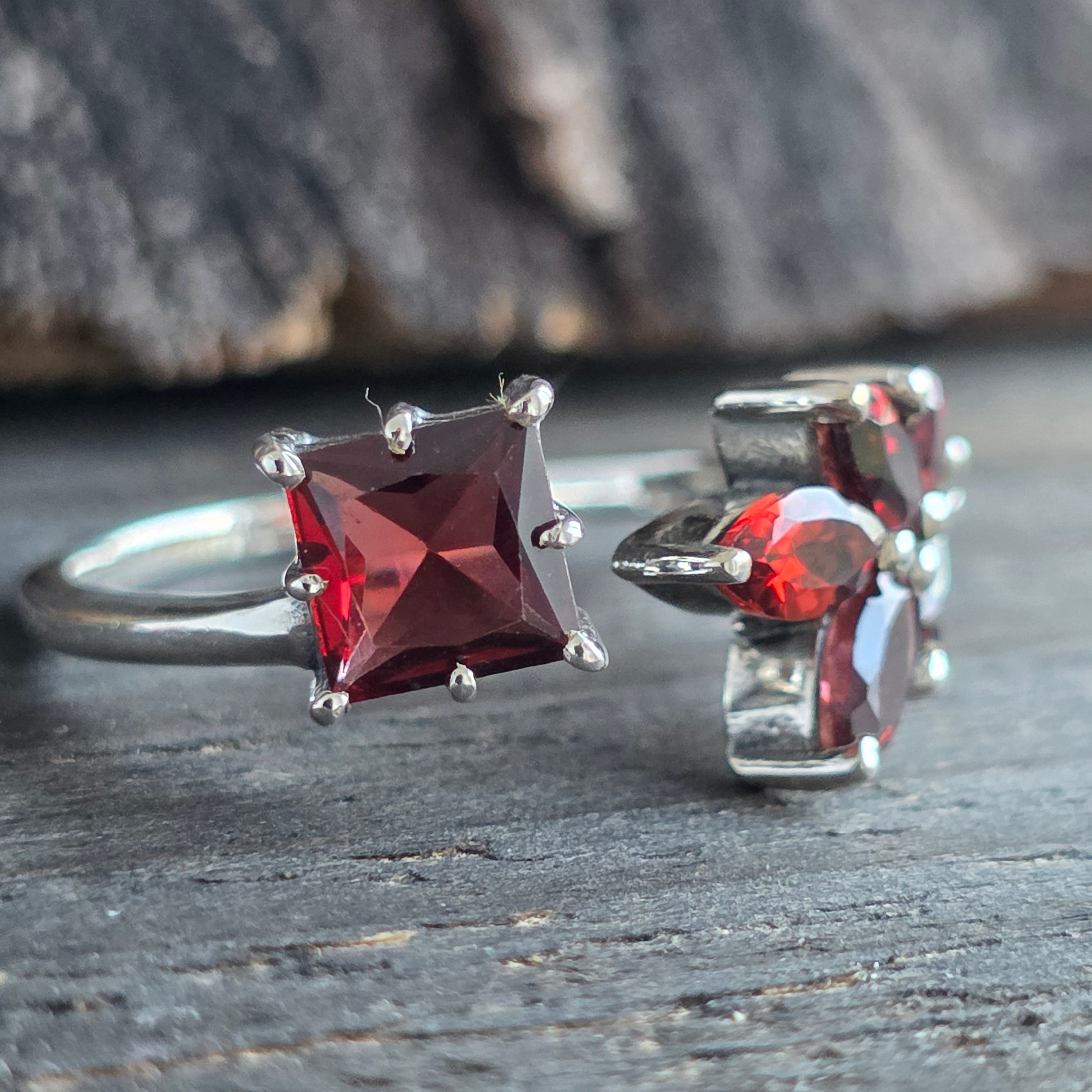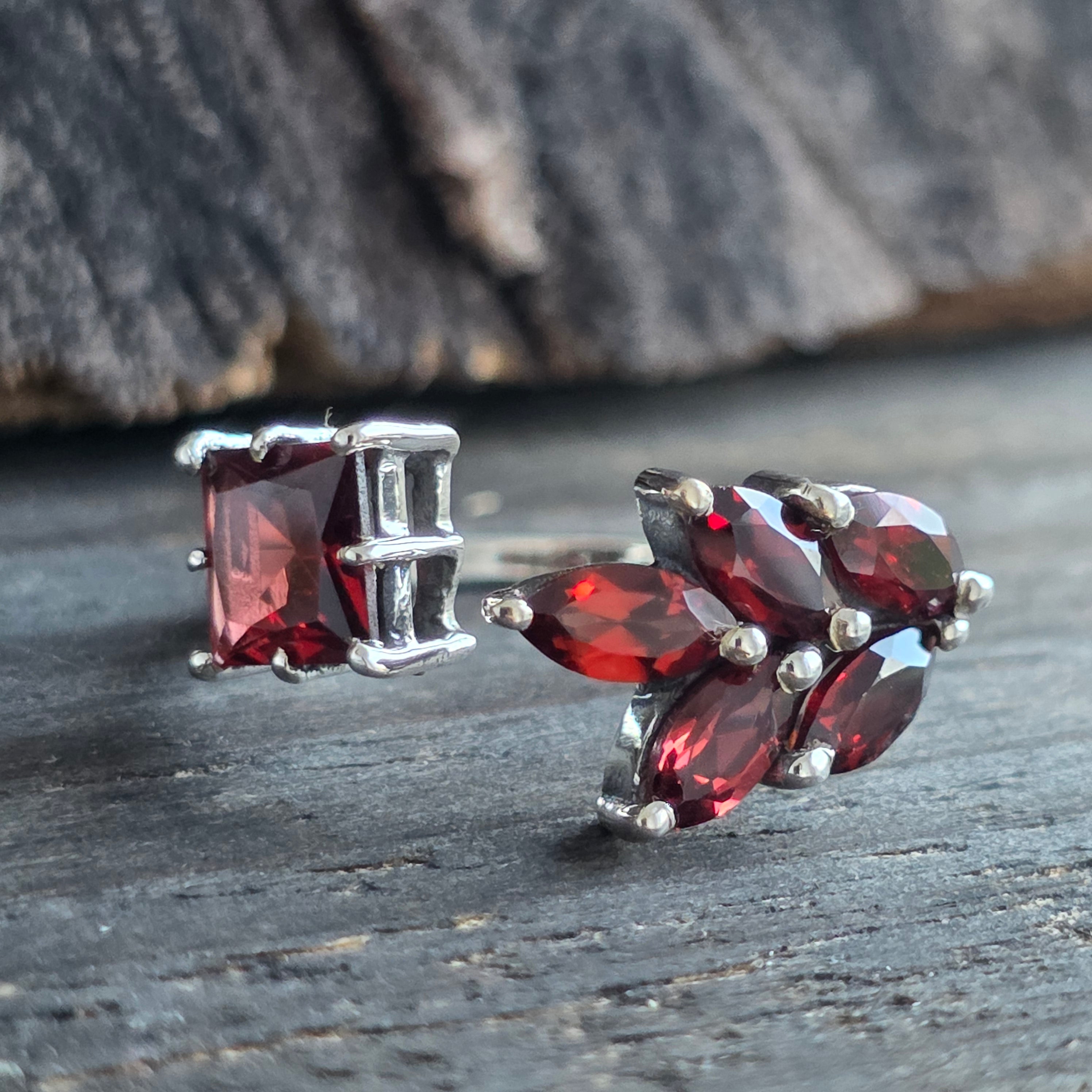 Une bague élégante et de caractère, réalisée en argent 925 et ornée d'une pierre naturelle de grenat, avec des teintes rouge rubis profond qui prennent vie dans la lumière.