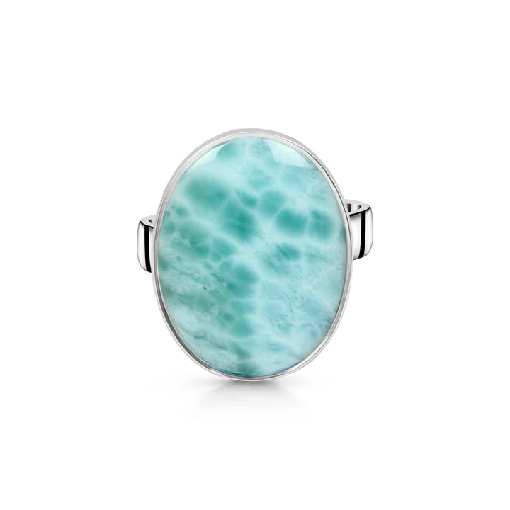 Une bague unique en larimar naturel, connue comme la pierre du ciel et de l'océan. Ses nuances de bleu aquatique, avec des reflets blancs comme les vagues de la mer, apportent paix intérieure et une sensation de liberté infinie.
