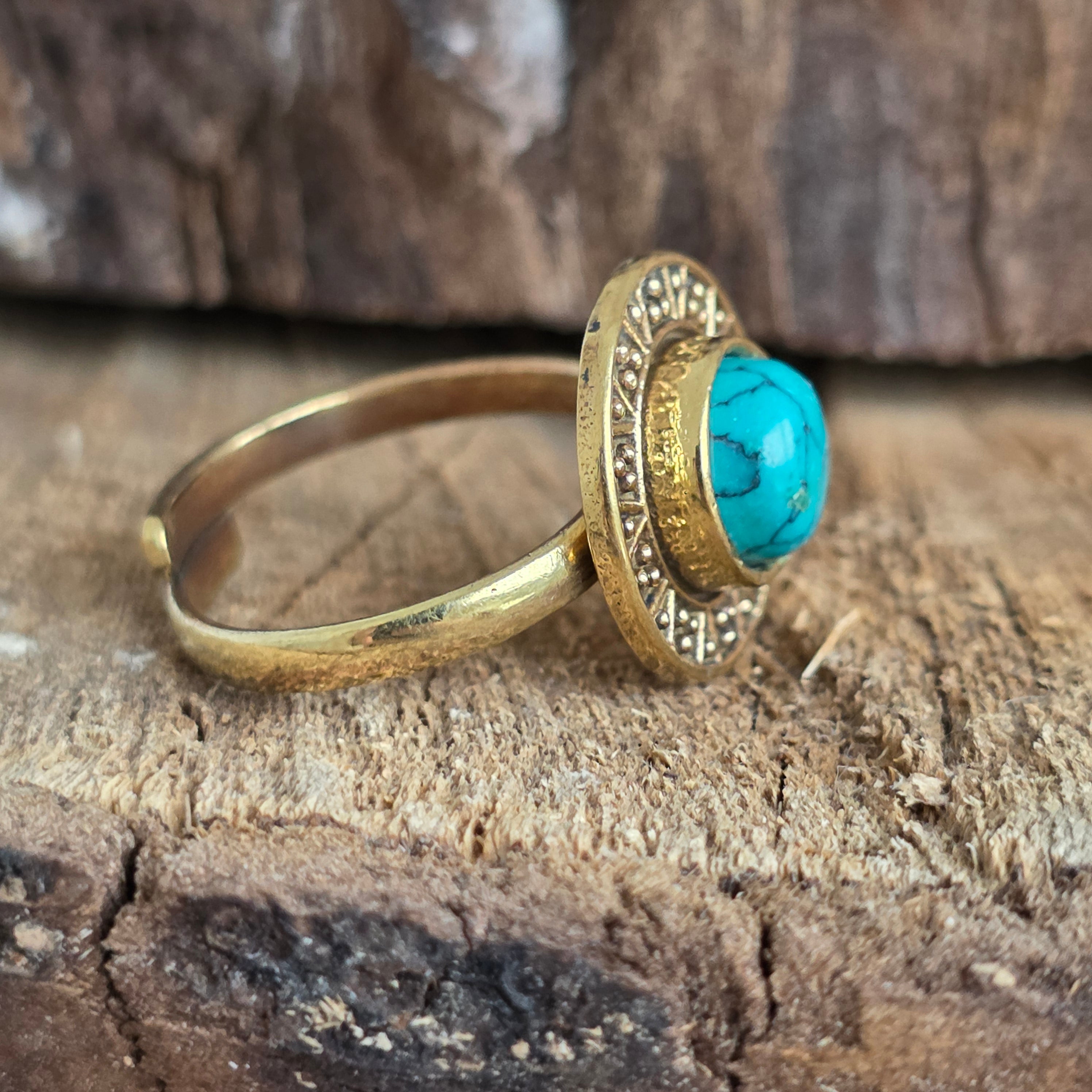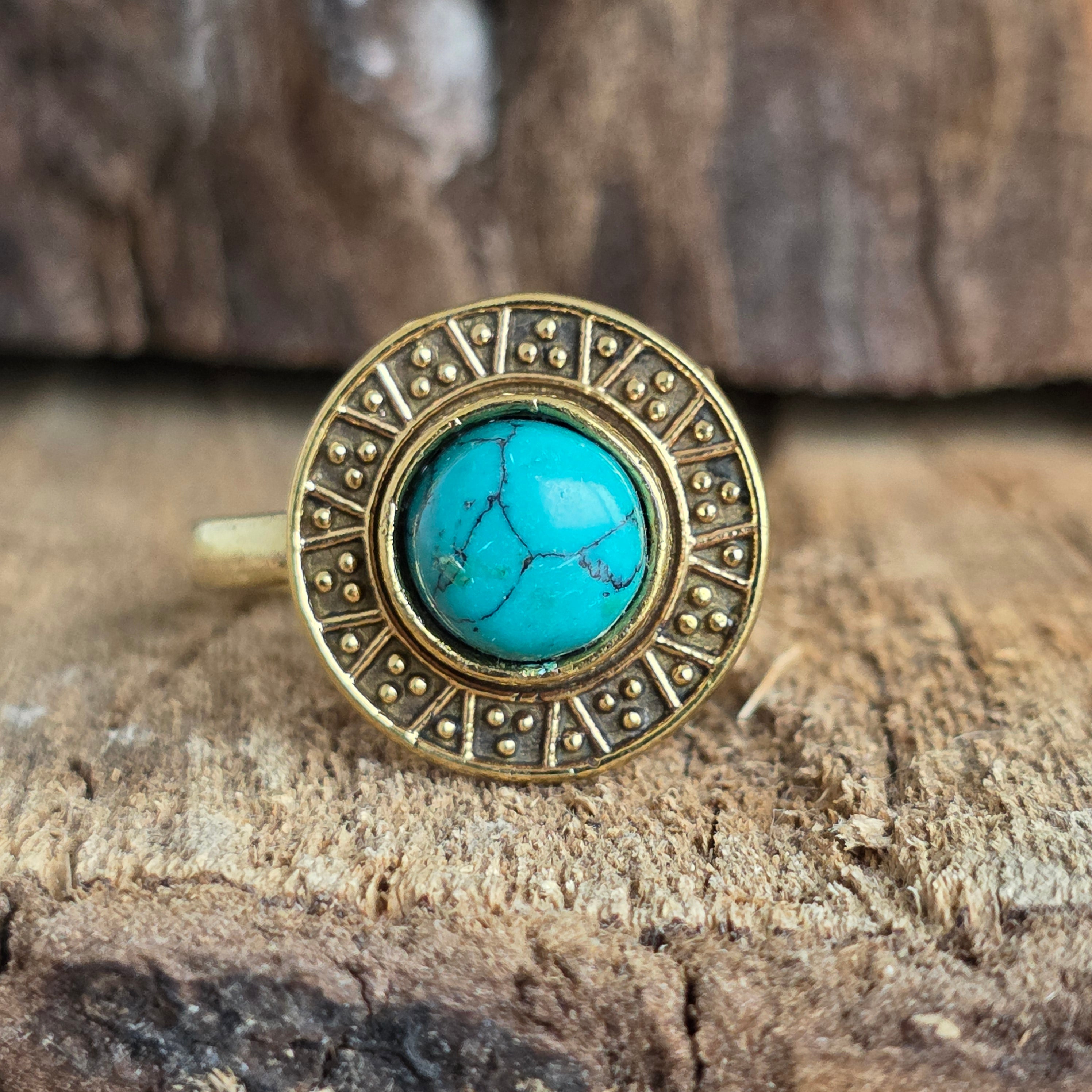 Une bague de personnalité, inspirée de l'artisanat traditionnel indien Travail de Rawa, fabriqué à partir de alliage métallique avec finition bronze brillant et anobli d'un pierre turquoise naturelle.