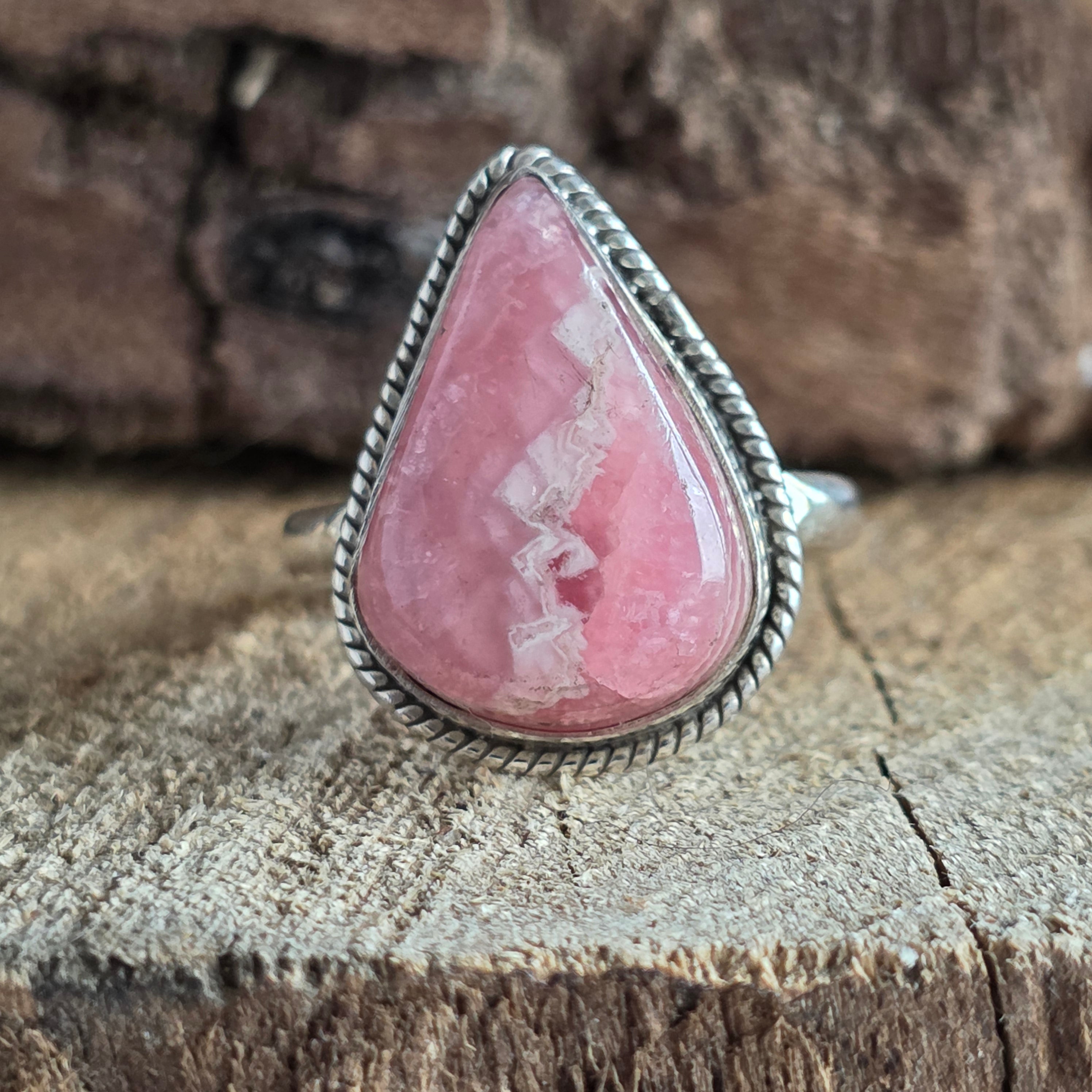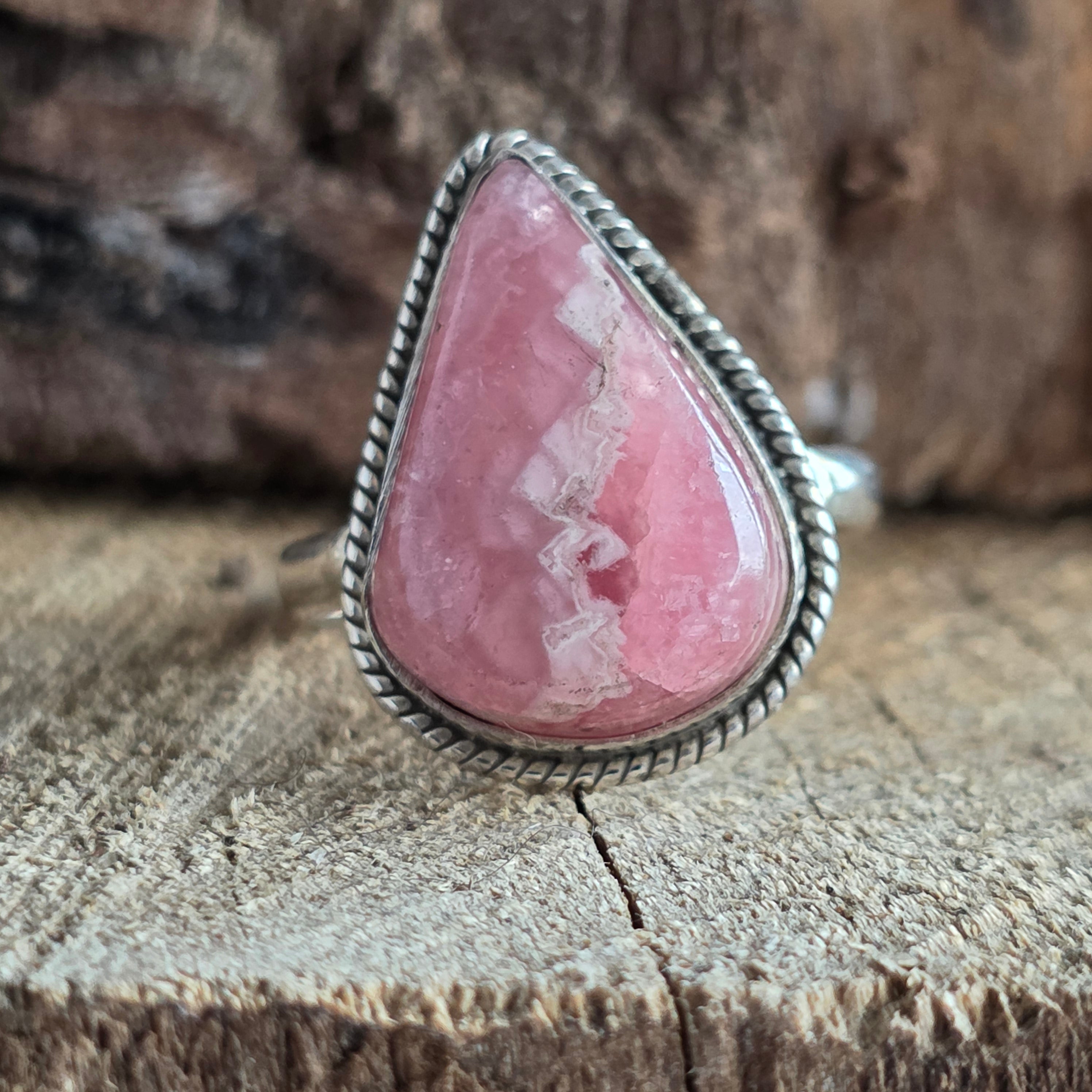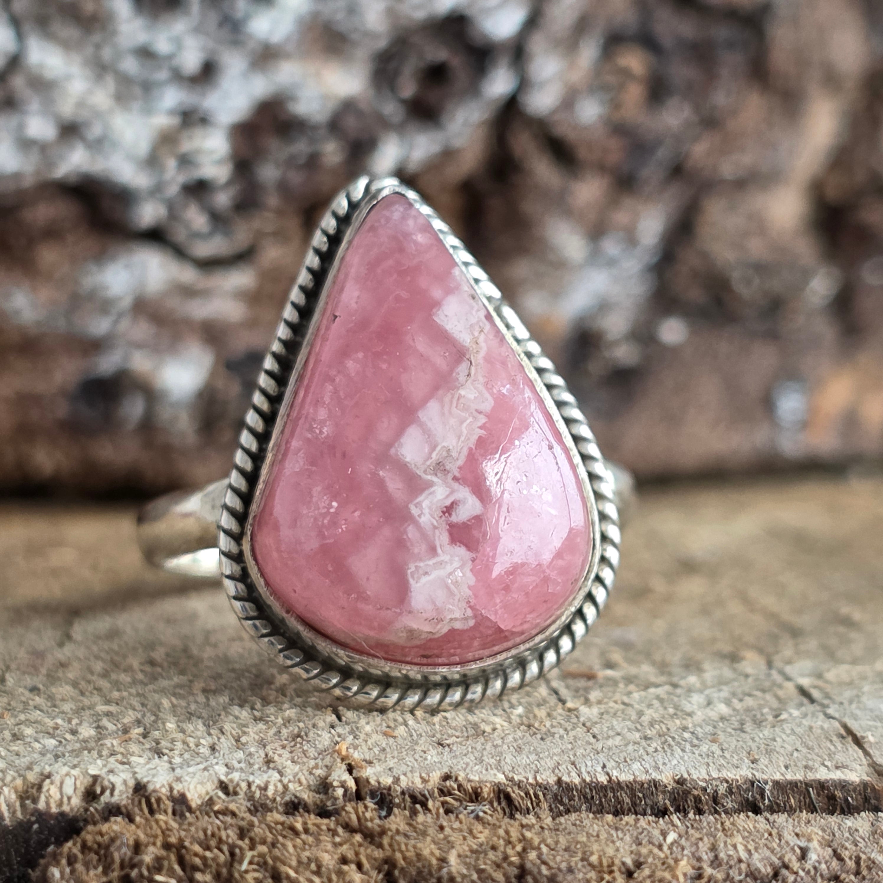 Une spectaculaire bague en argent 925 avec rhodochrosite naturelle dans des tons rose chaud et blanc nacré. Monture faite à la main travail au fil torsadé il accentue le charme naturel de la pierre, transformant le bijou en une pièce élégante pleine de personnalité.