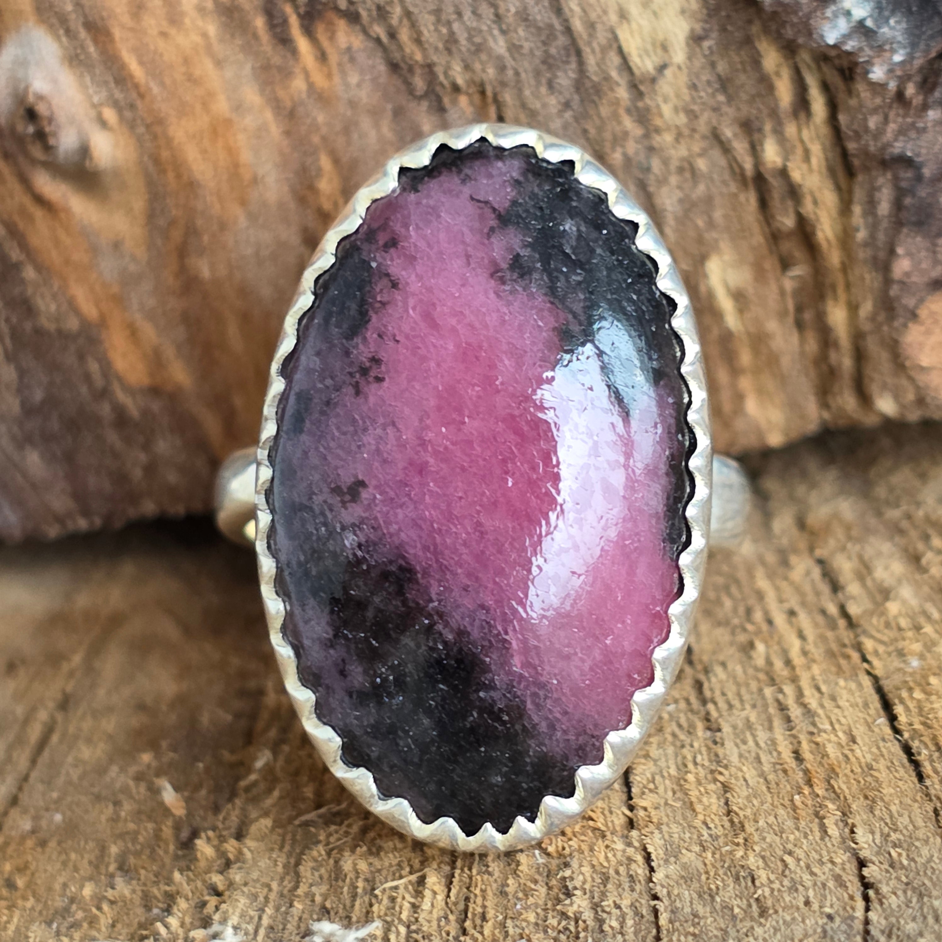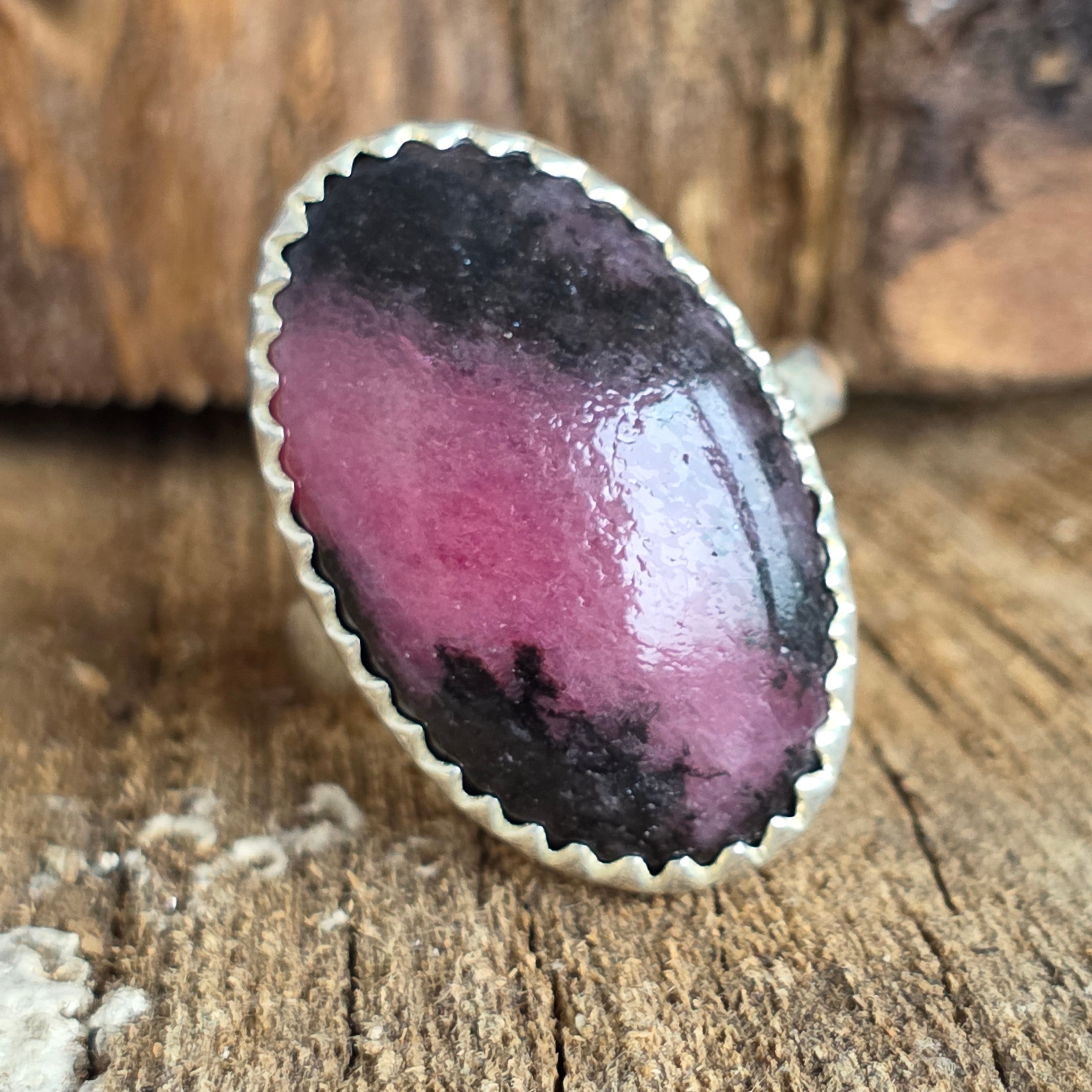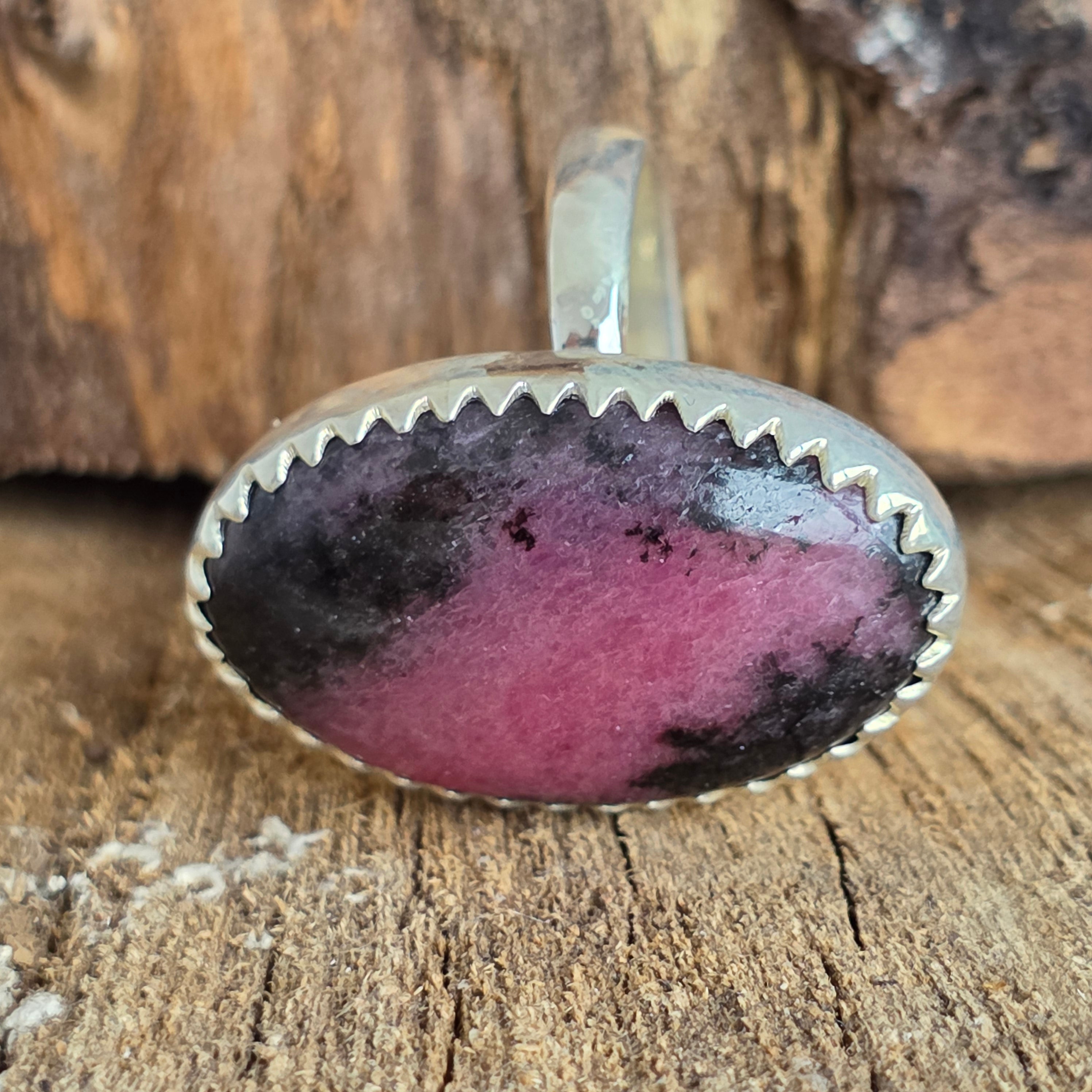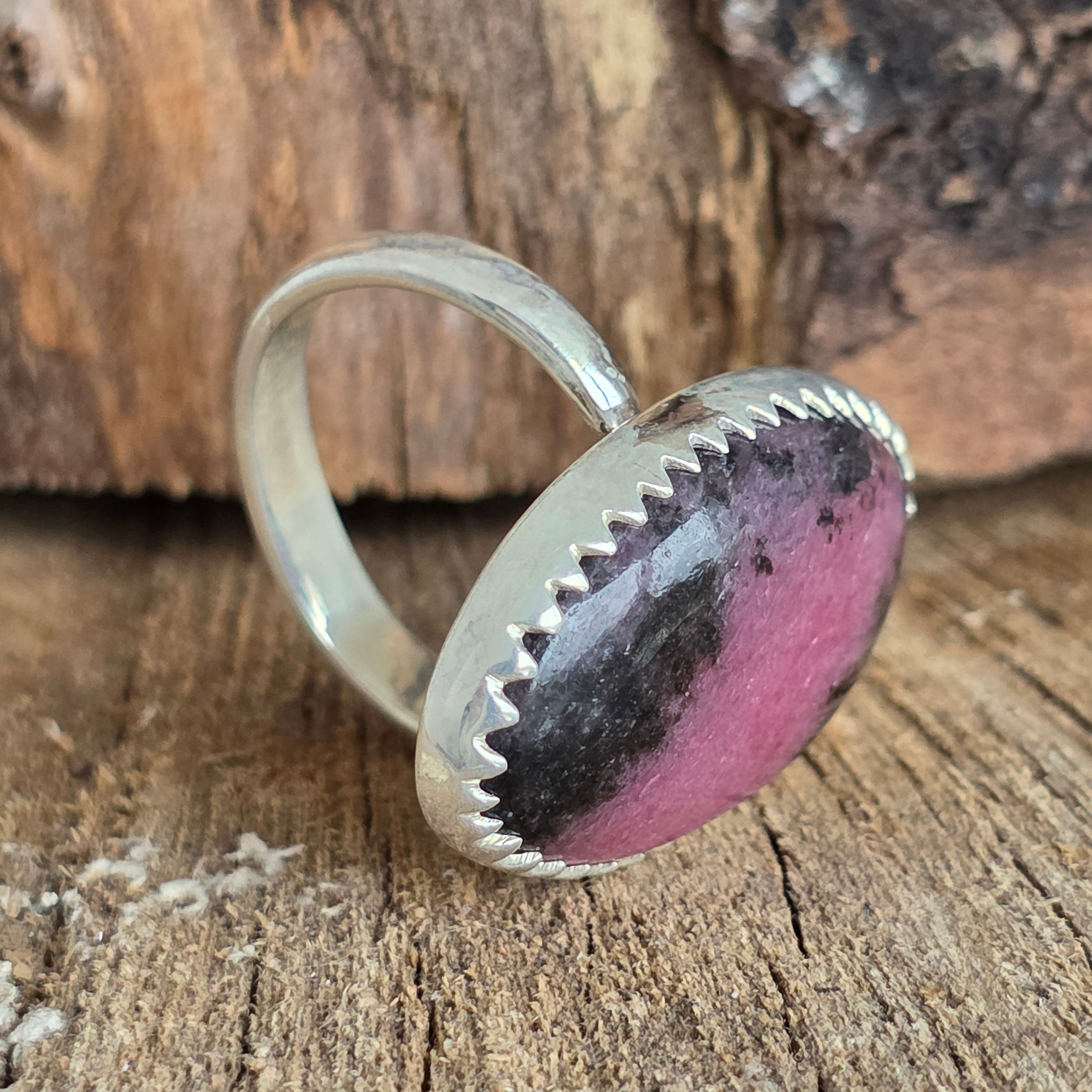 Cette bague en rhodonite en argent 925 est une gemme raffinée et expressive, où le rose vibrant de la pierre s'entremêle aux tons noirs naturels, créant un motif minéral spectaculaire. Chaque bague est unique, grâce aux variations de couleur et de texture de la pierre, ce qui lui confère un caractère unique.