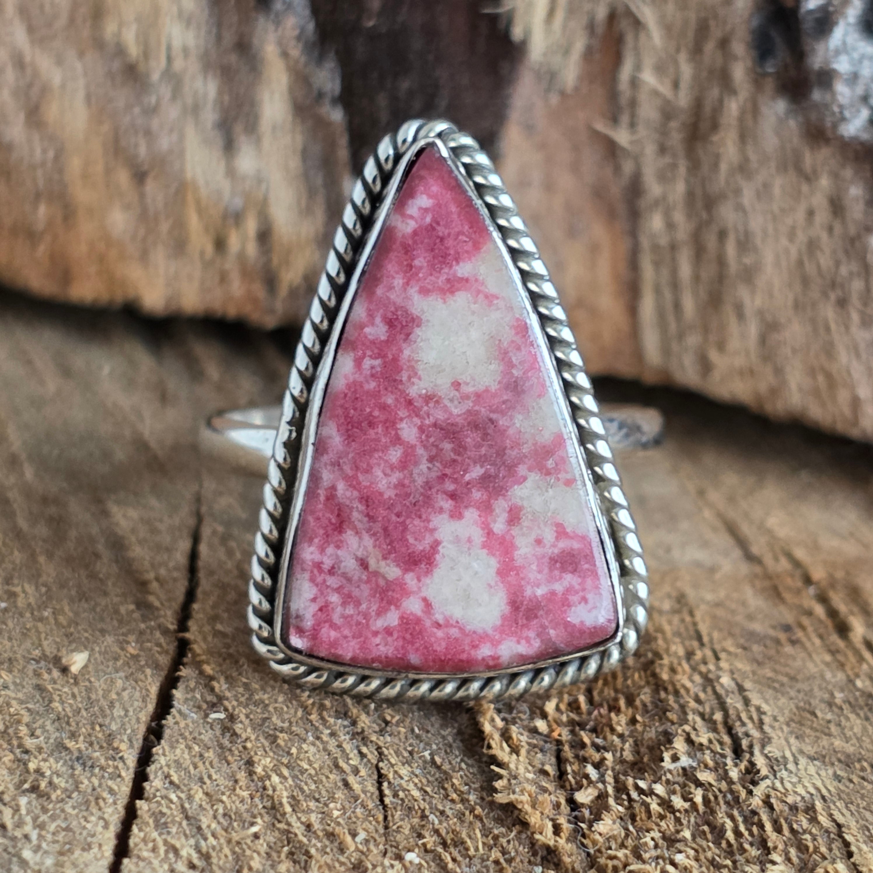 Une bague en argent 925 qui porte en elle l'énergie de la terre nordique – Tulite, une variété rose de zoïsite, à texture naturelle et avec de fines variations de couleur allant du rose saumon au fuchsia en passant par le blanc calcaire.