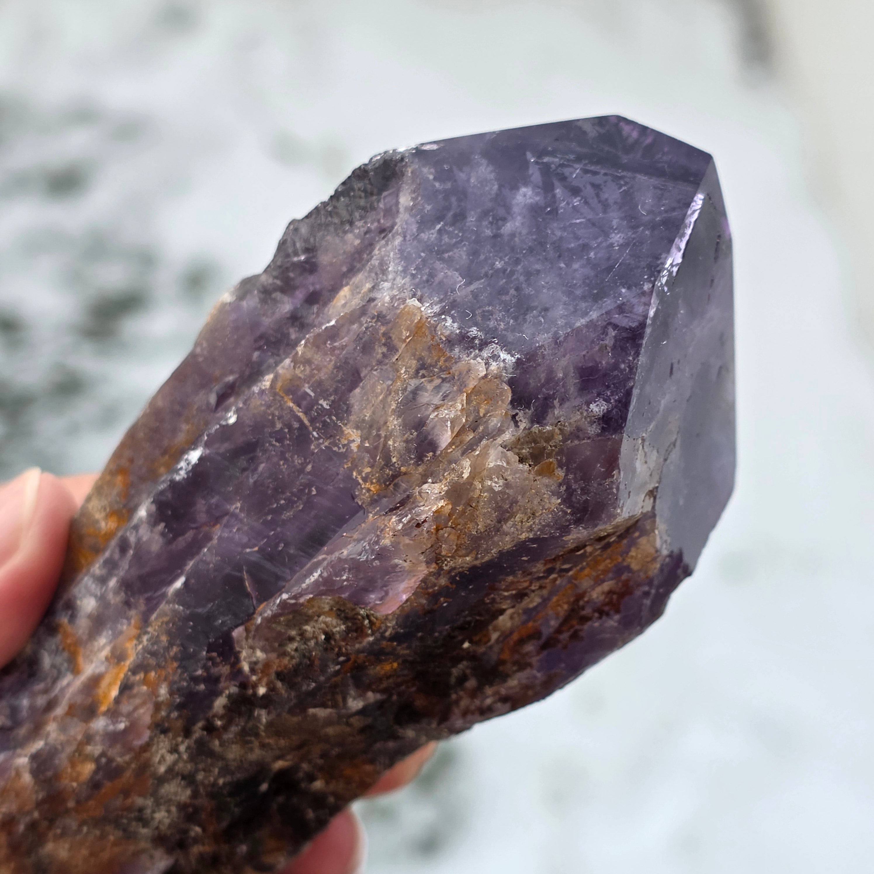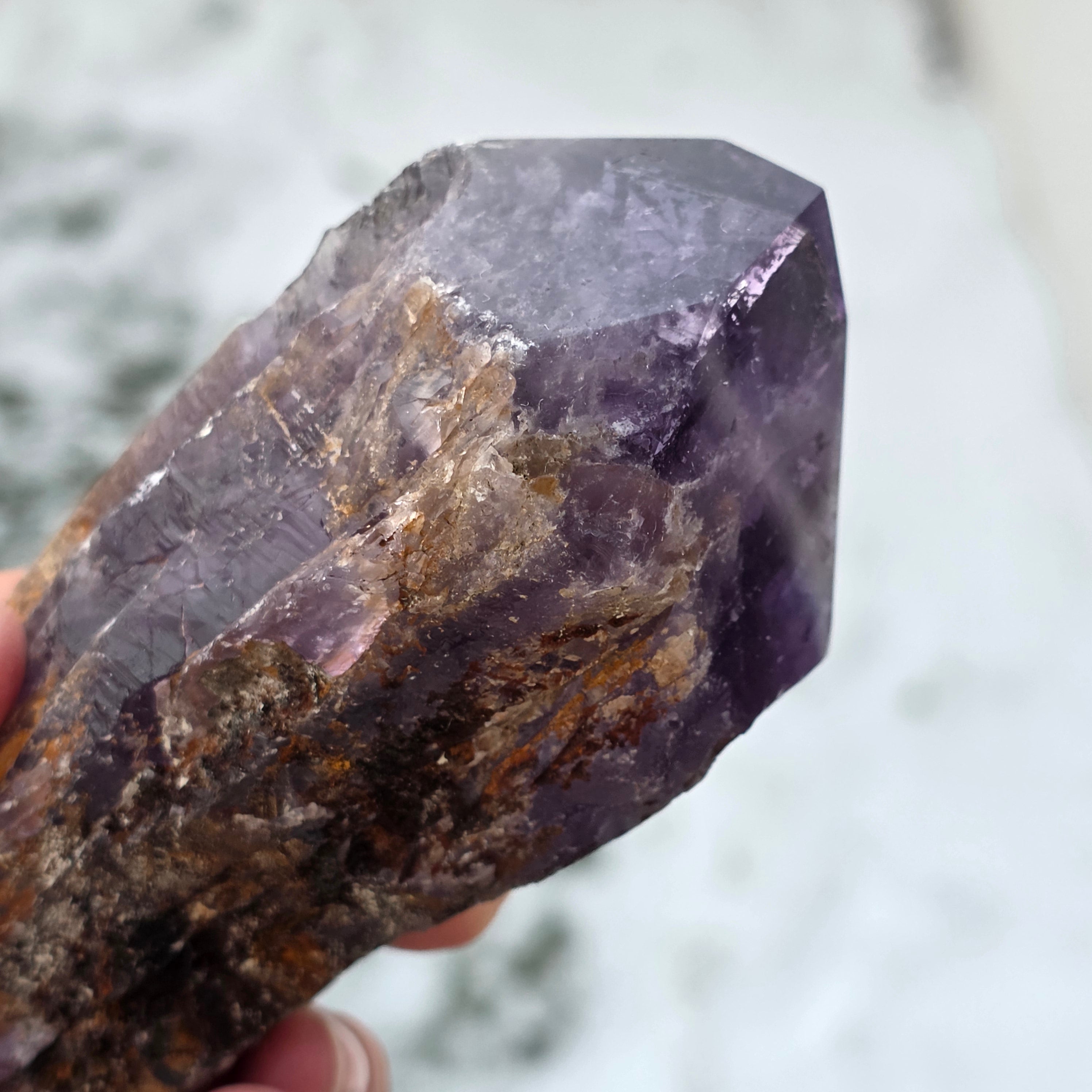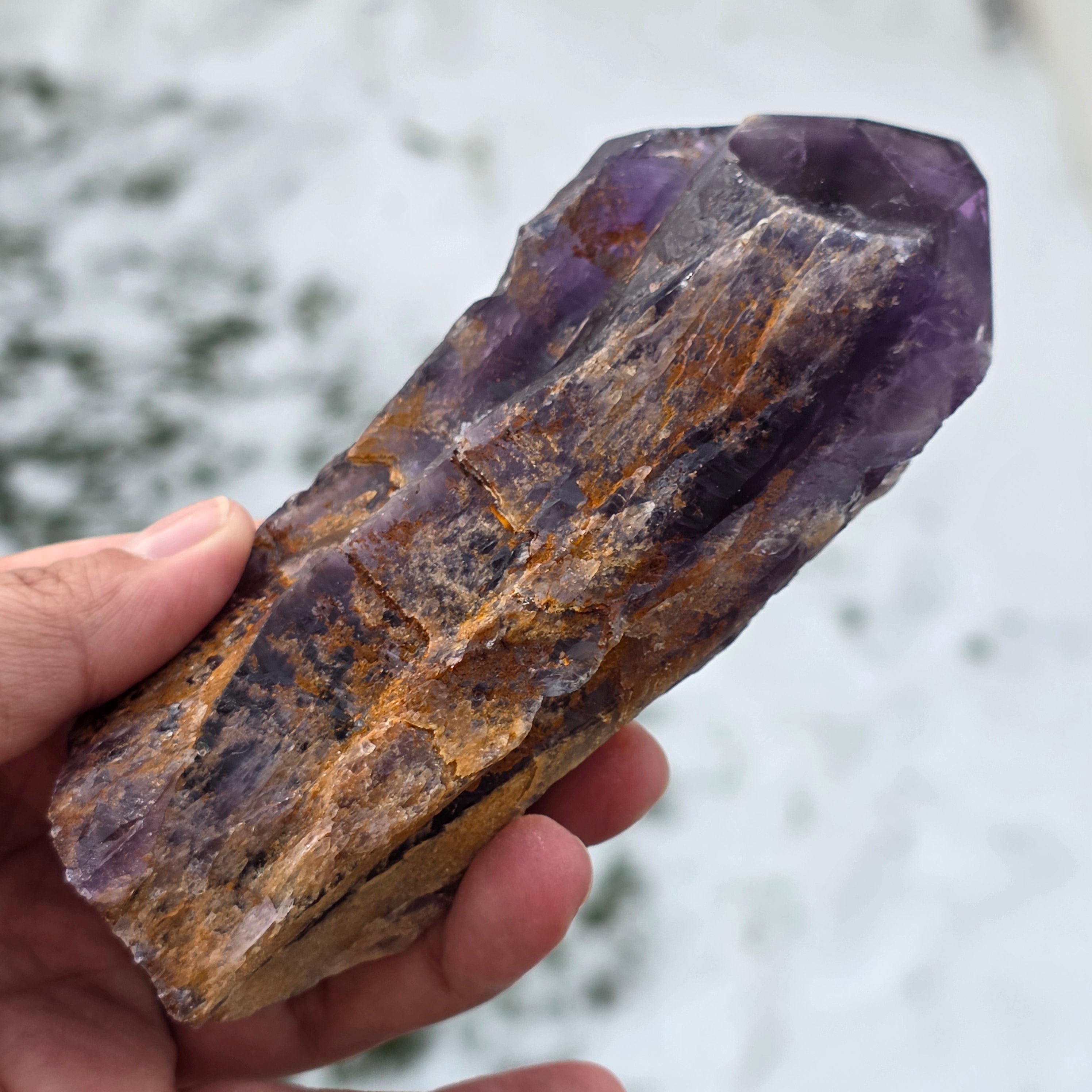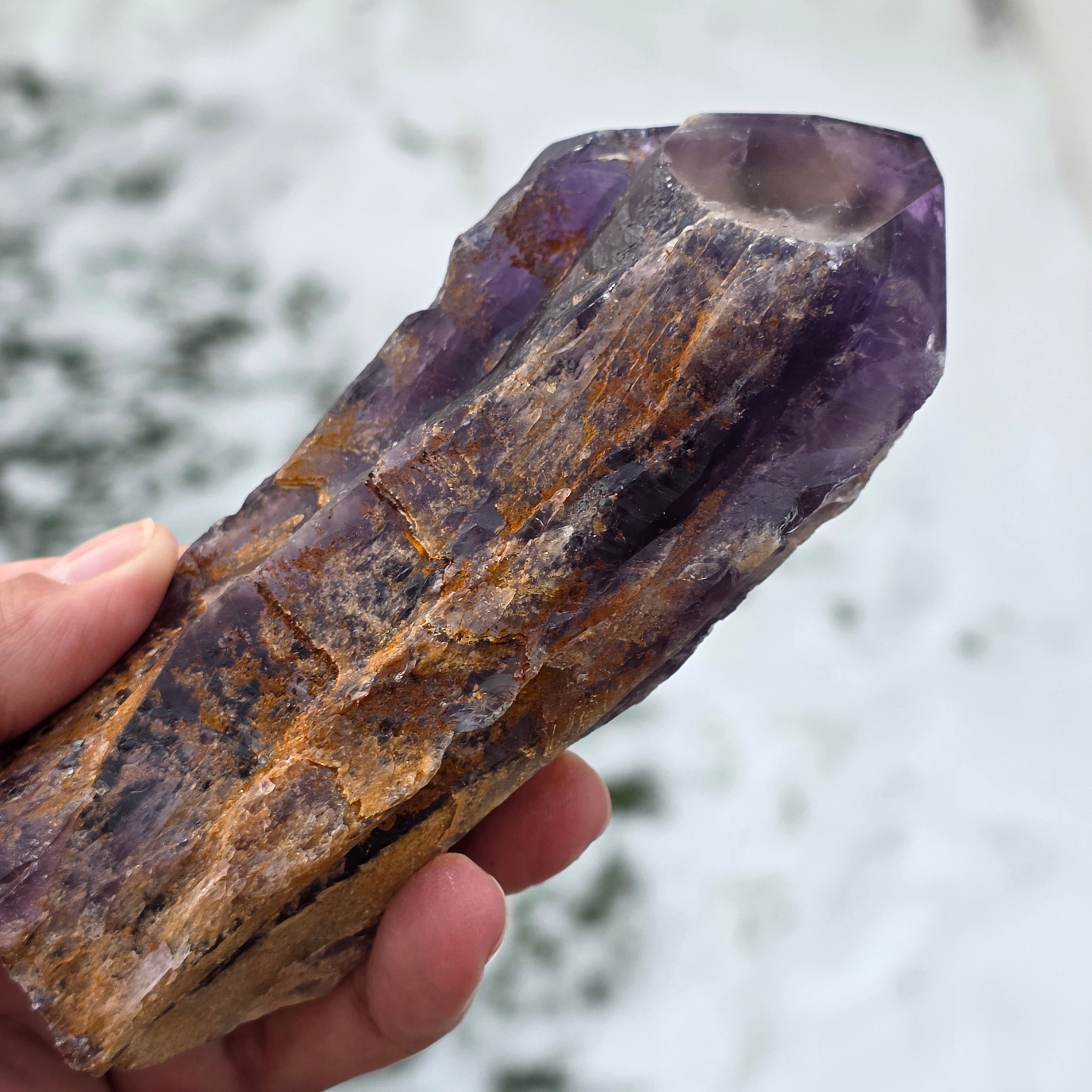 L'améthyste de Bahia, parfois appelée "Coin du Dragon", est extraite de la région de Bahia, au Brésil. Chaque cristal est un spécimen naturel unique, avec une forme cristalline bien définie et présente des cloisons ou des protubérances sur toute sa longueur. Ces cristaux ne sont pas détachés d'un groupe plus grand, mais se forment individuellement, un par un.