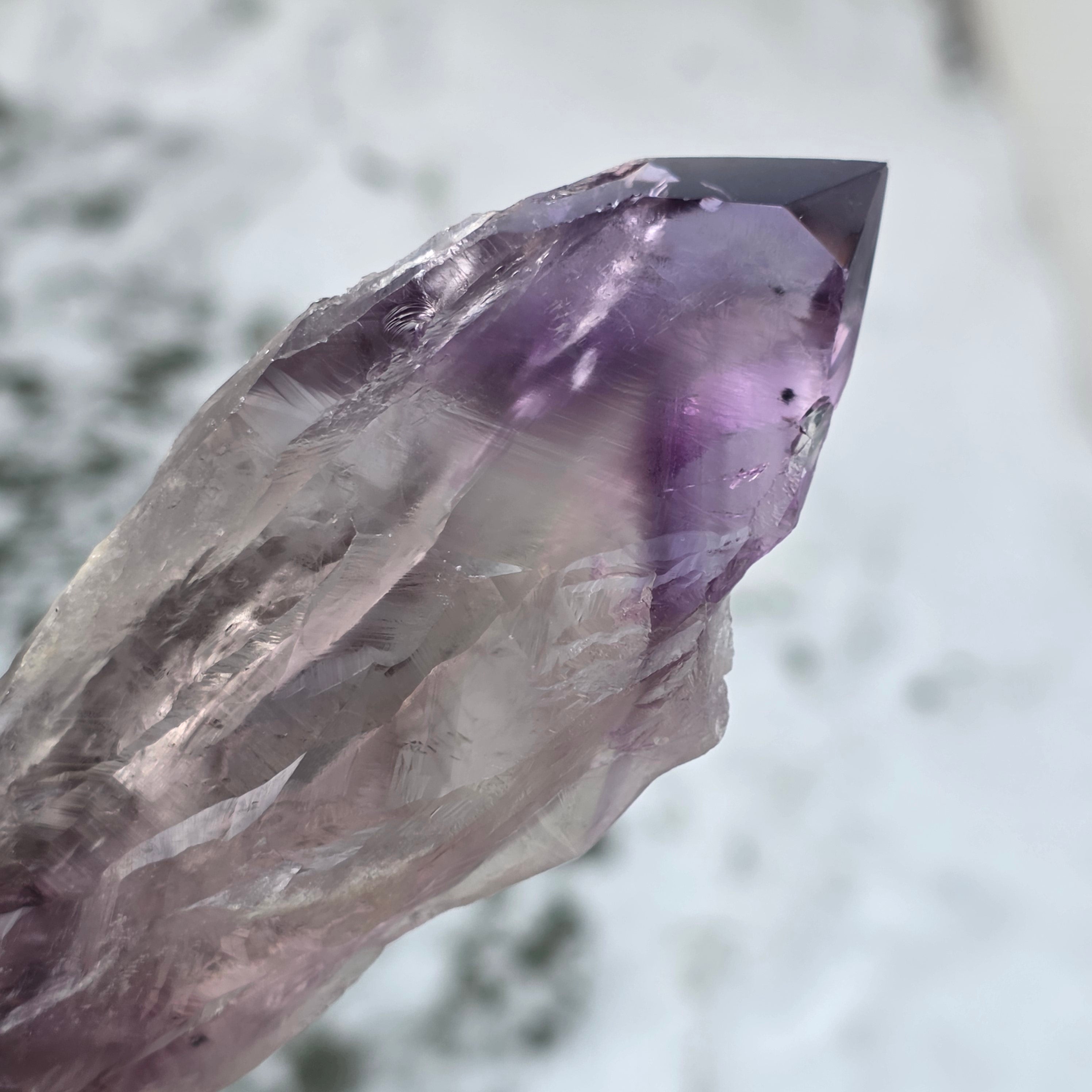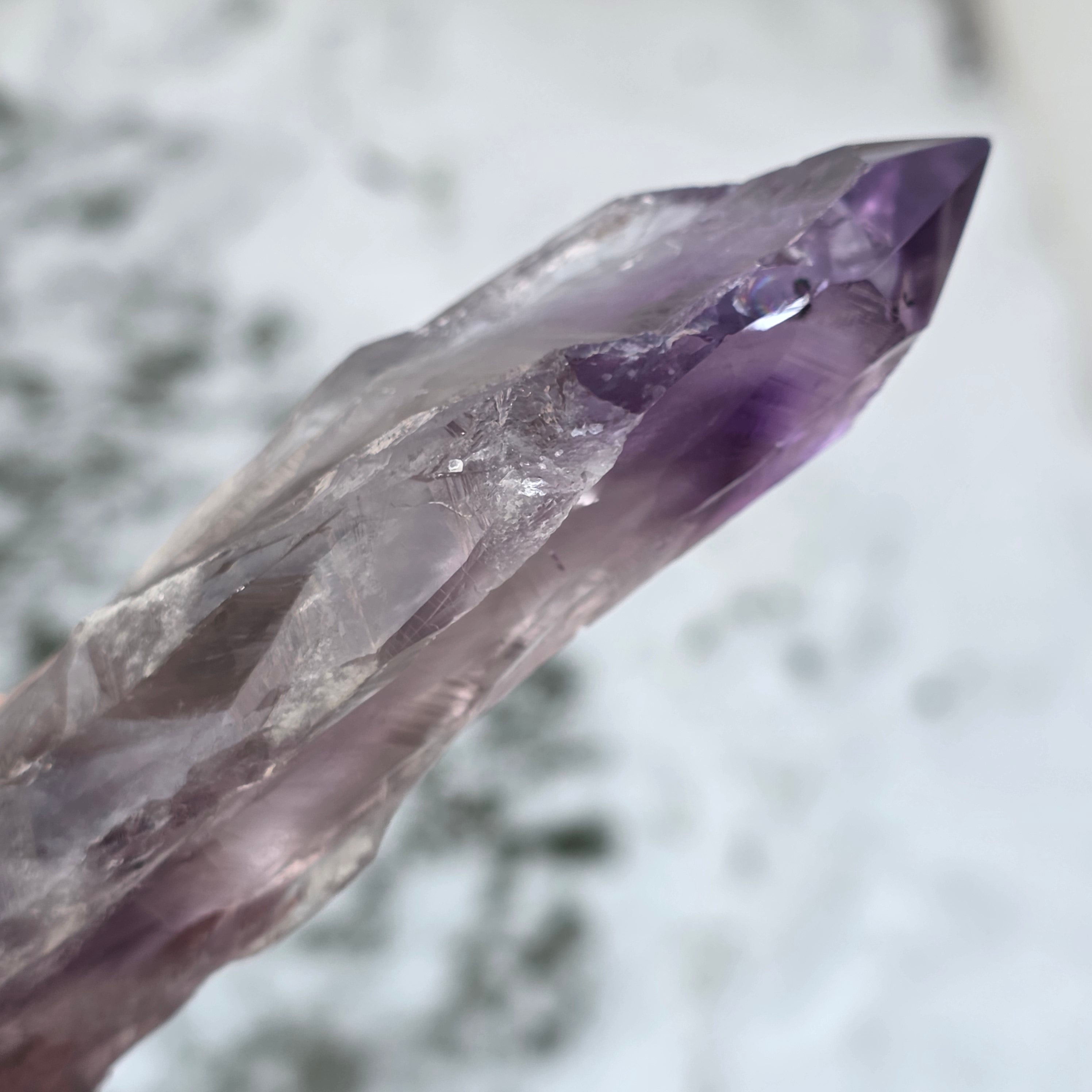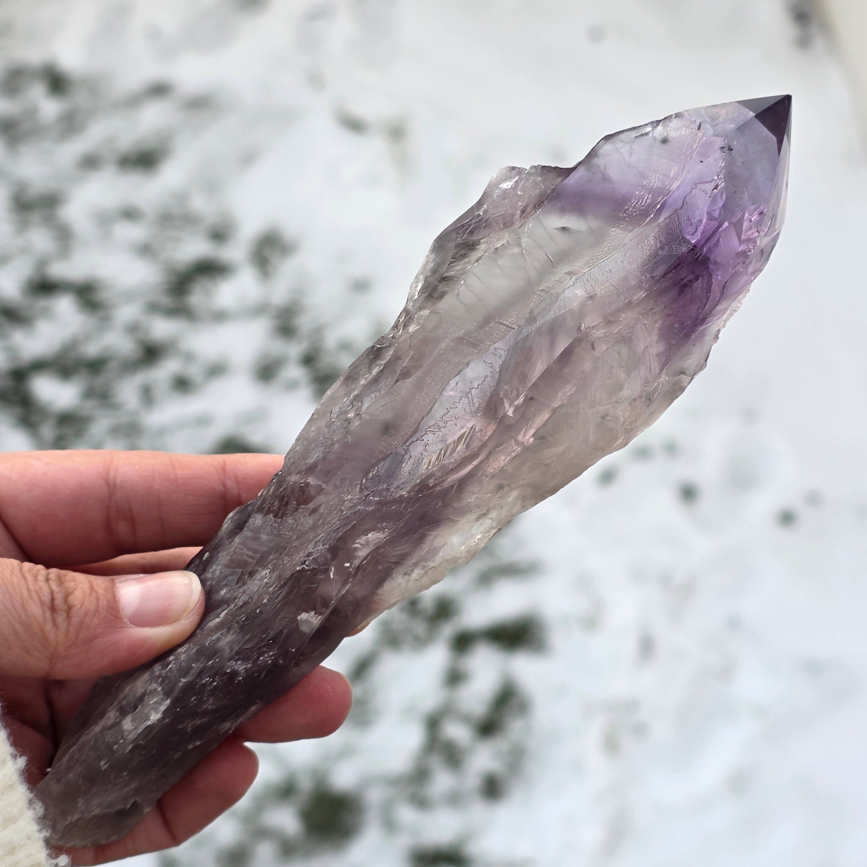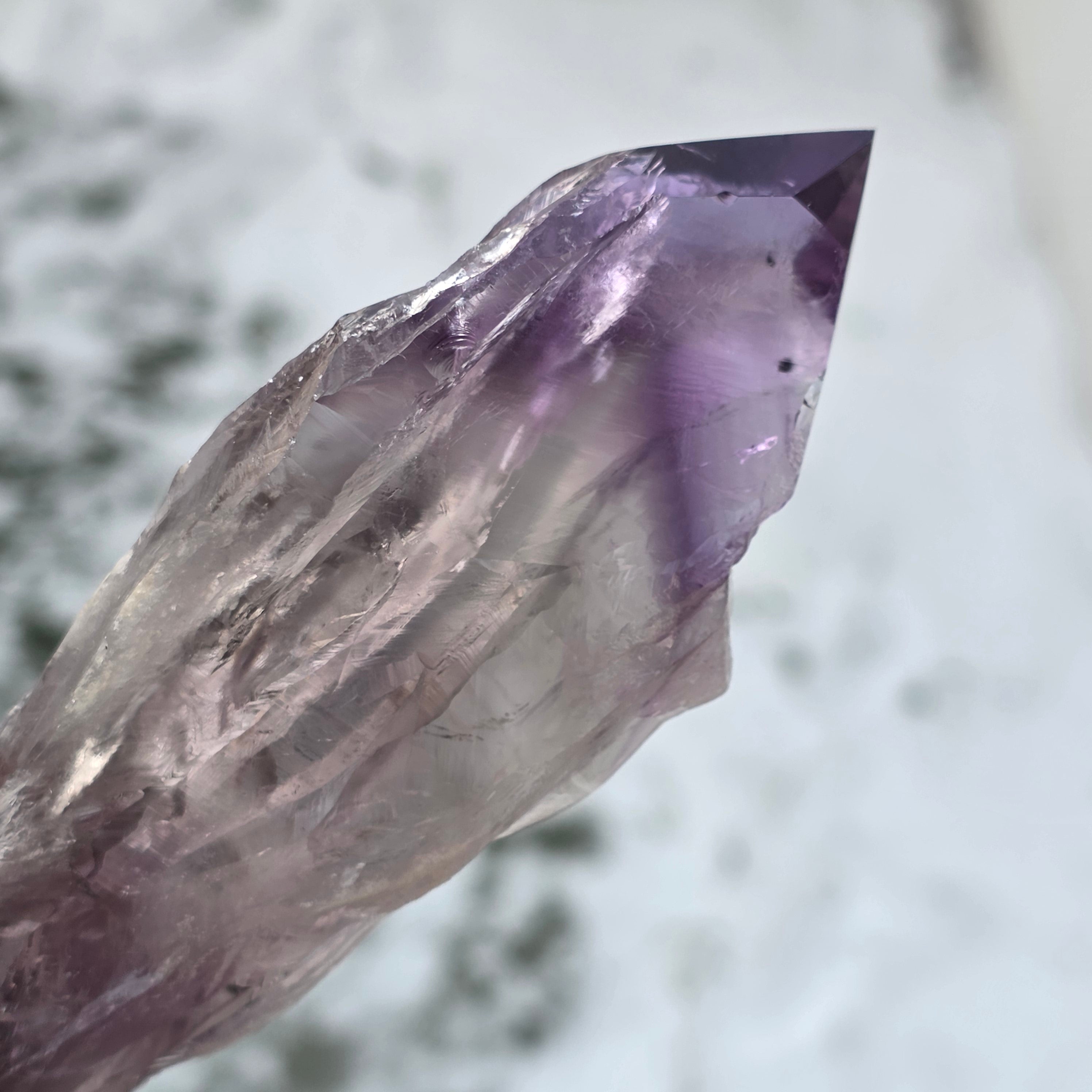 L’améthyste de Bahia, parfois appelée « Coin du Dragon », est extraite de la région de Bahia, au Brésil. Chaque cristal est un spécimen naturel unique, avec une forme cristalline bien définie, et présente des arêtes ou des bosses sur toute sa longueur. Ces cristaux ne sont pas détachés d’un groupe plus large, mais se forment individuellement, un par un.