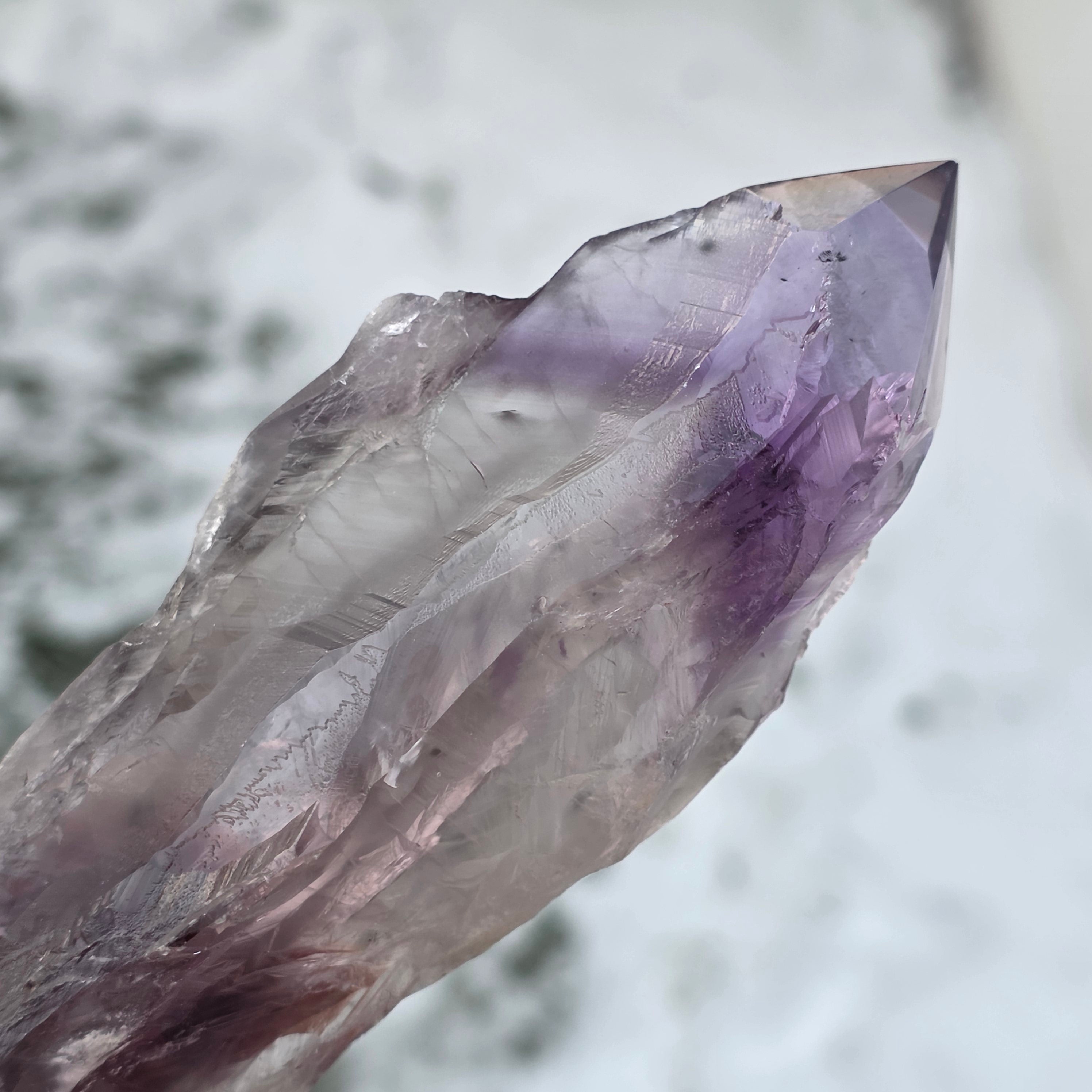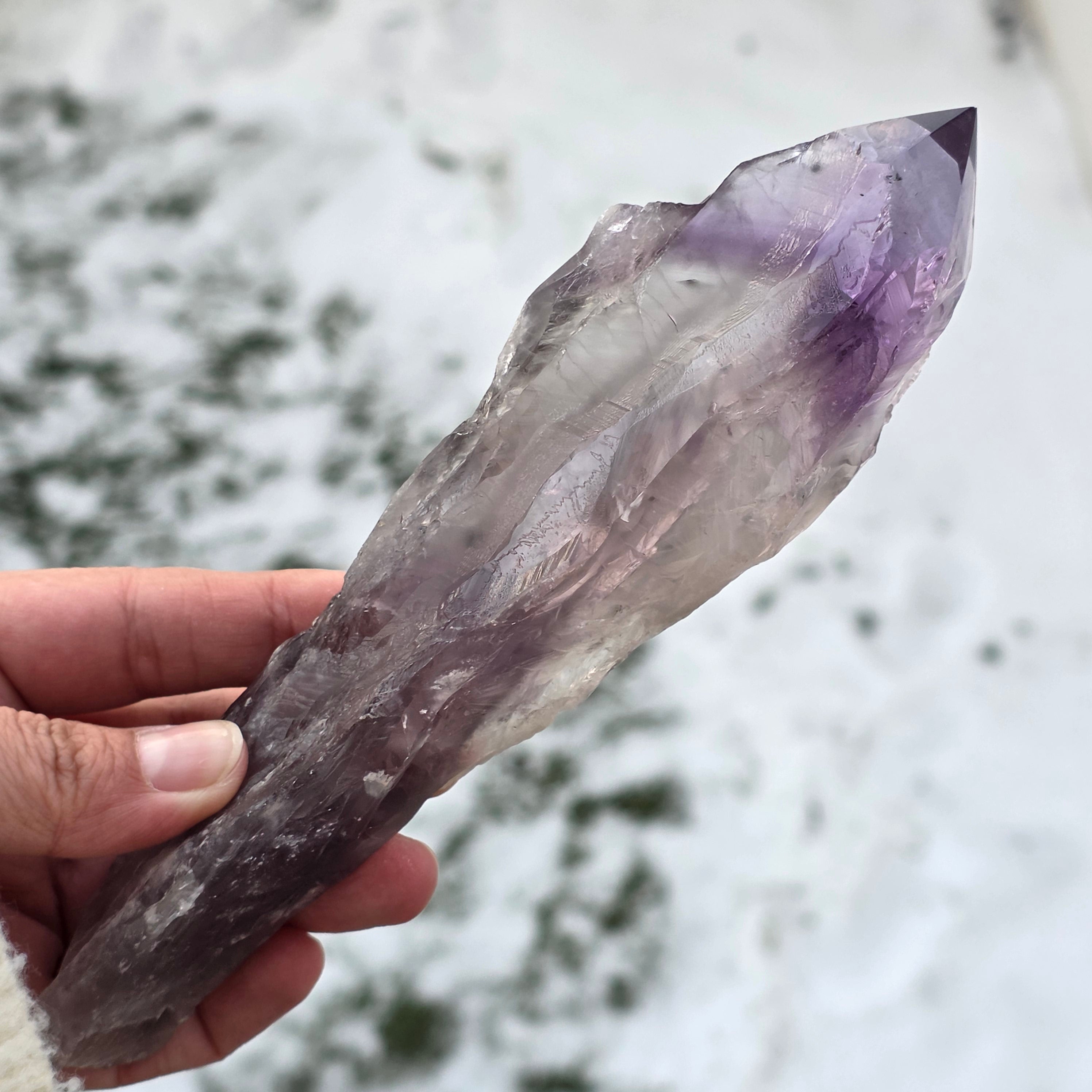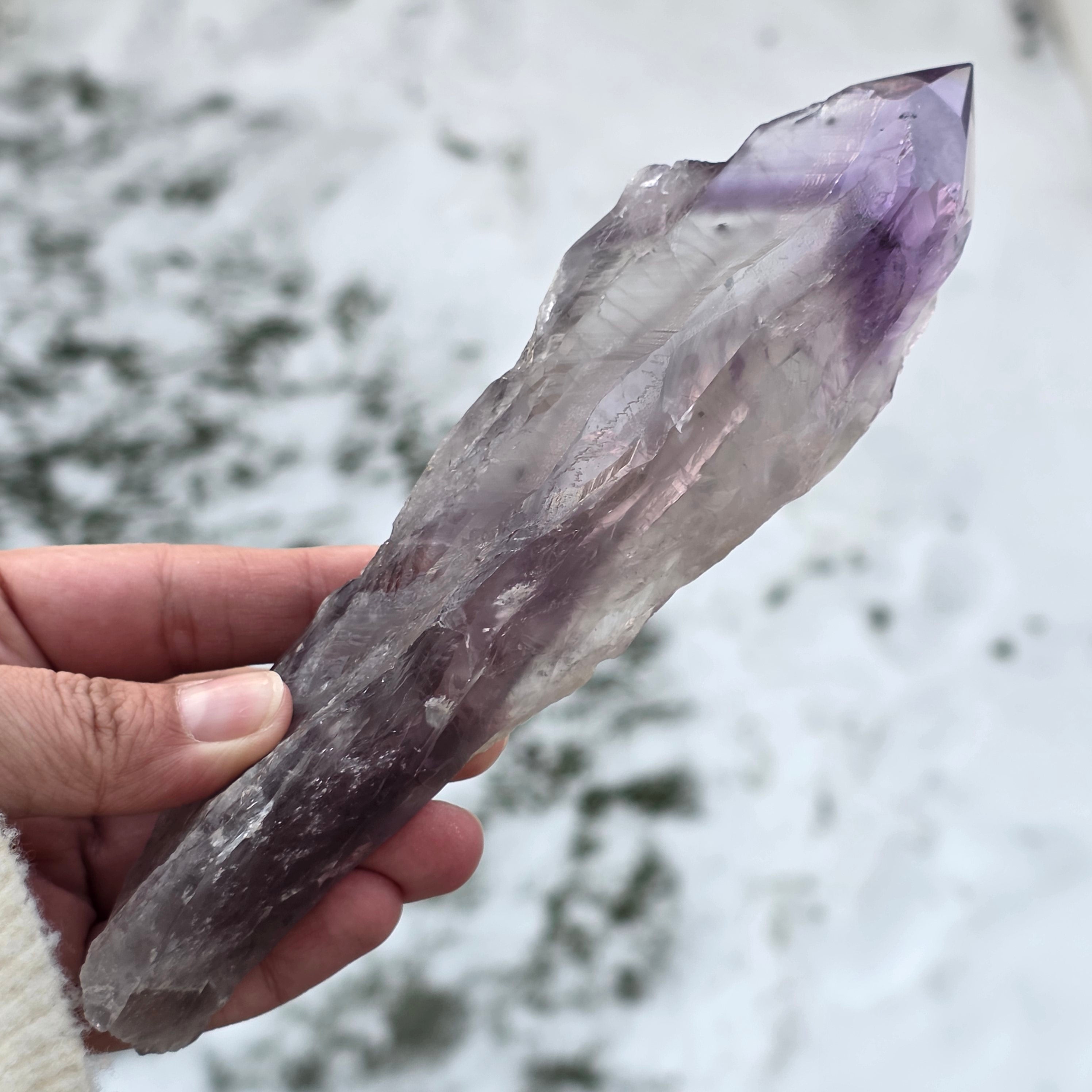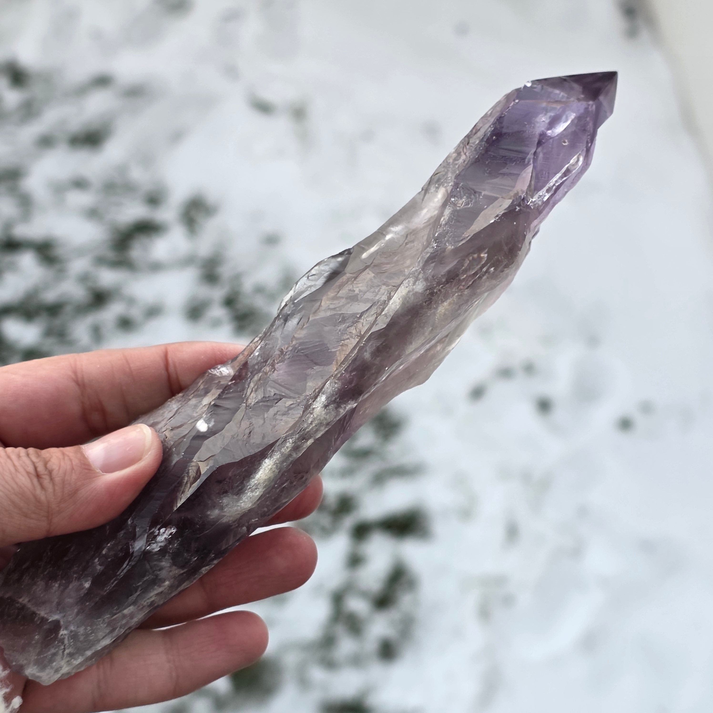 L’améthyste de Bahia, parfois appelée « Coin du Dragon », est extraite de la région de Bahia, au Brésil. Chaque cristal est un spécimen naturel unique, avec une forme cristalline bien définie, et présente des arêtes ou des bosses sur toute sa longueur. Ces cristaux ne sont pas détachés d’un groupe plus large, mais se forment individuellement, un par un.
