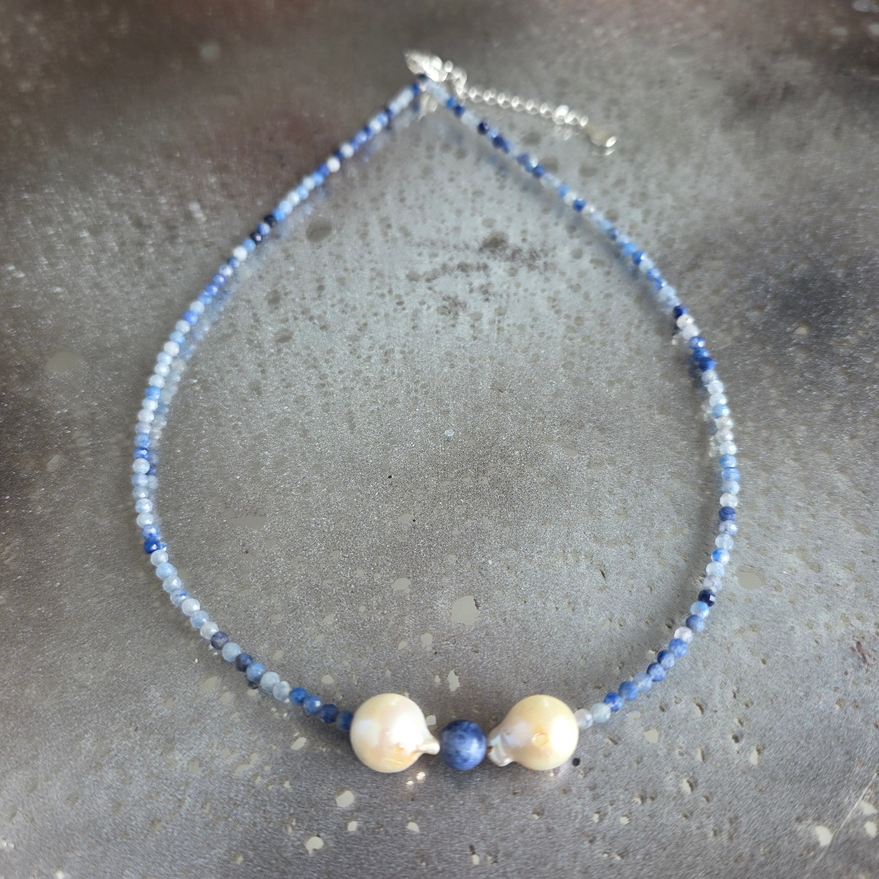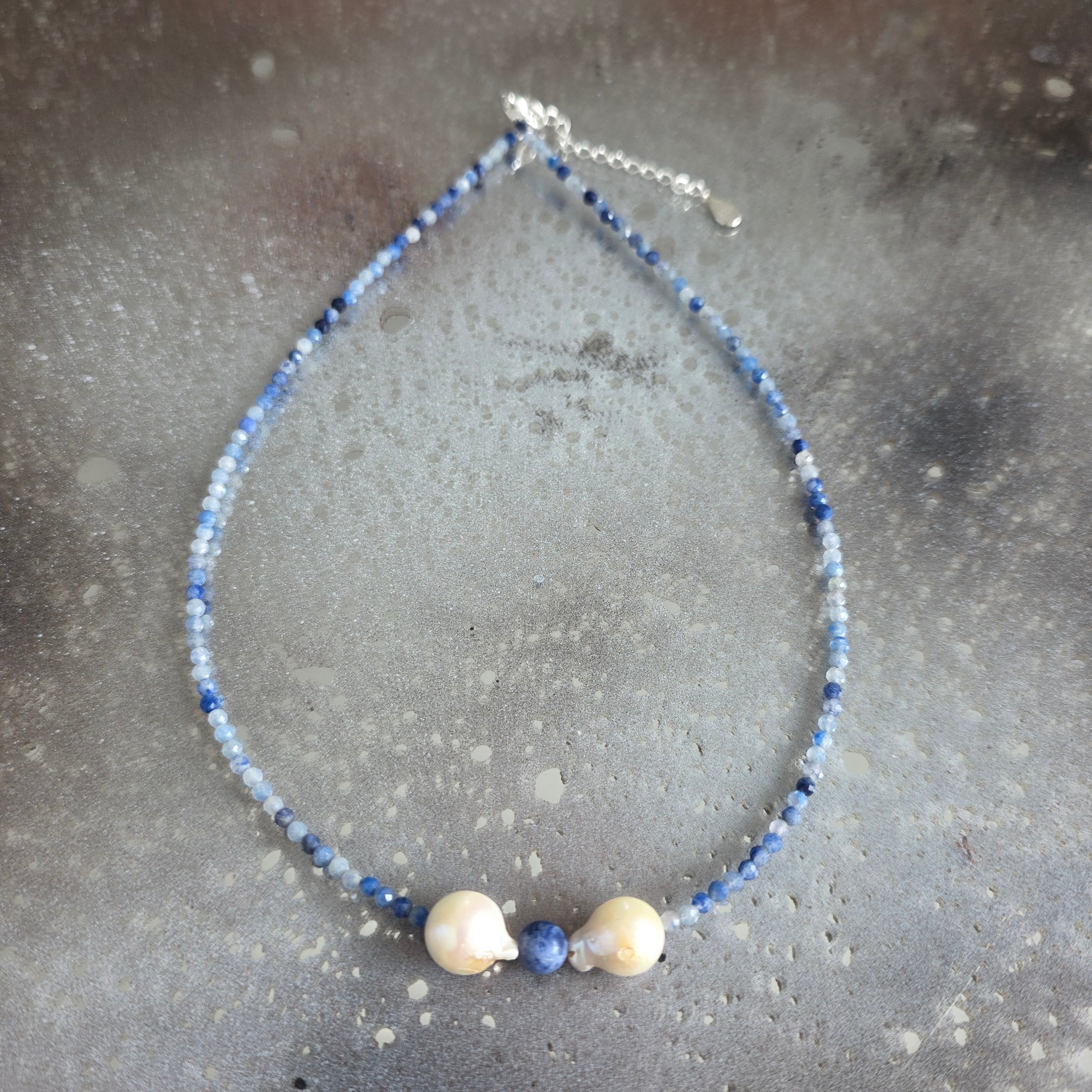 Matériaux : aventurine bleue facettée 2,5 mm, sodalite 6 mm, perles irrégulières ~1 cm, argent 925