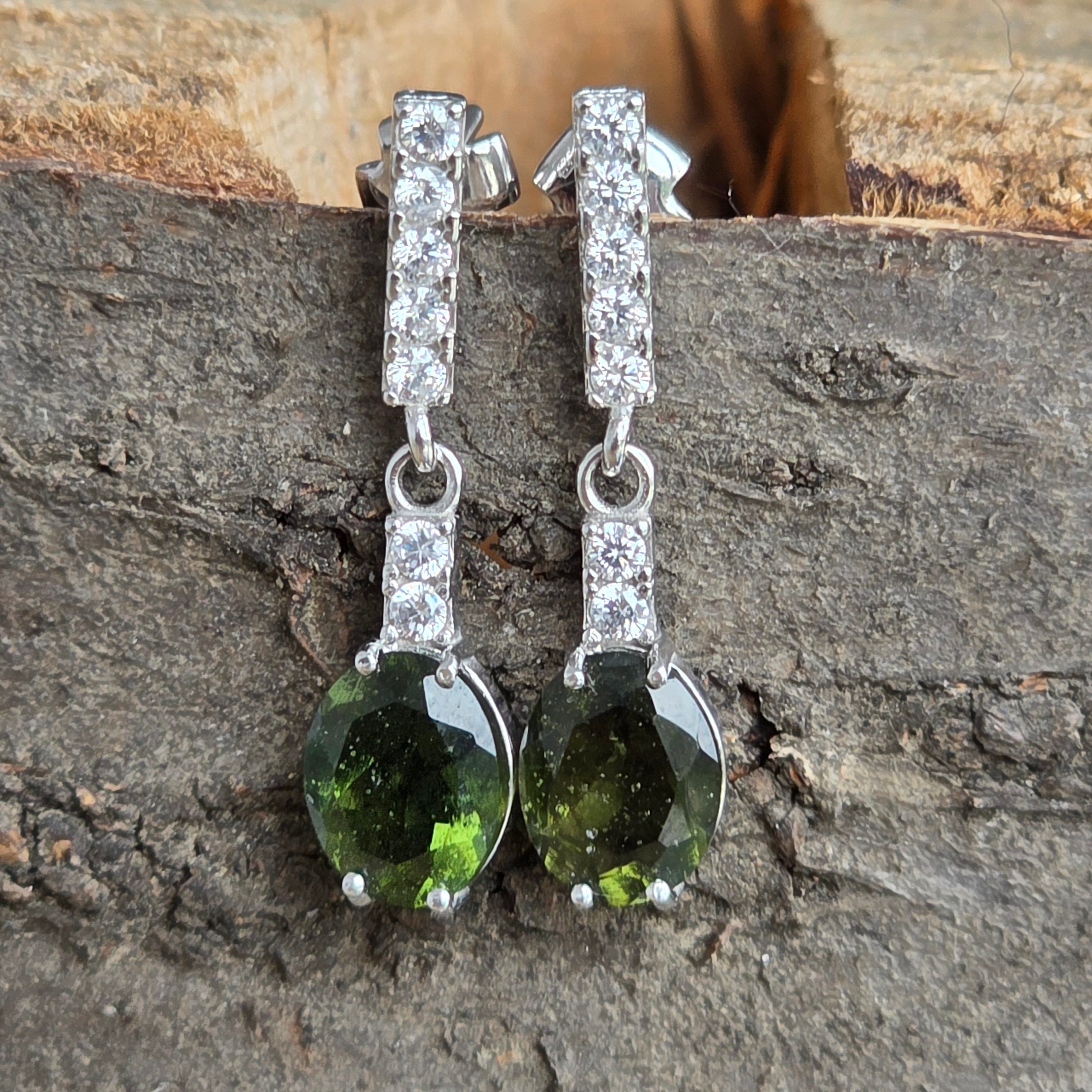 Ces boucles d'oreilles élégantes combinent la beauté unique du Moldavit naturel avec la brillance discrète de la zircone cubique, montée dans un design argenté 925 sophistiqué. Les verts intenses de Moldavit, avec des réflexions profondes et mystérieuses, sont soulignées par la clarté des pierres blanches, créant un contraste raffiné.