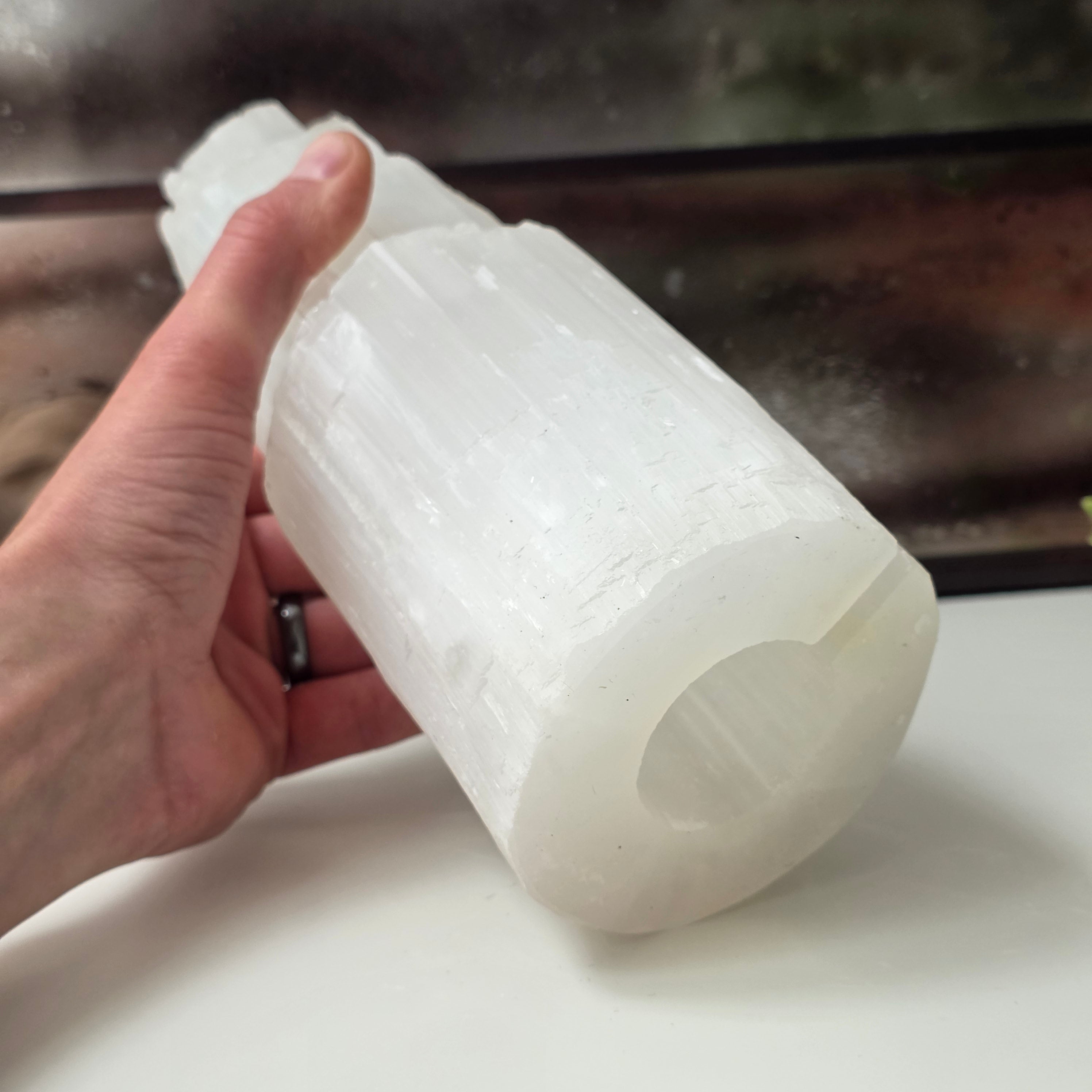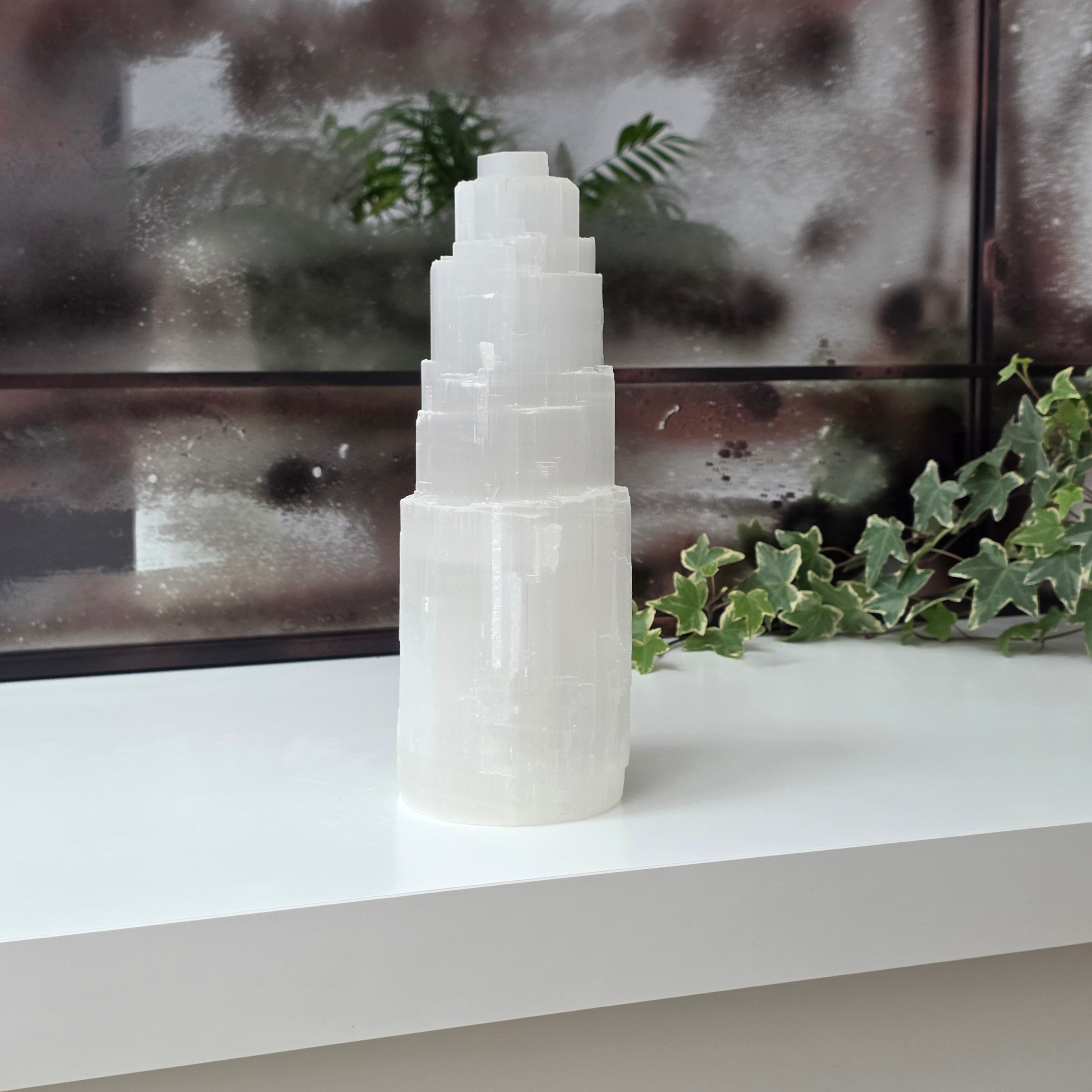 Ce bougeoir tour, fabriqué à partir de sélénite naturelle, apporte une touche de magie et de lumière à n'importe quel espace. La sélénite est considérée comme la pierre de pureté et de paix intérieure.