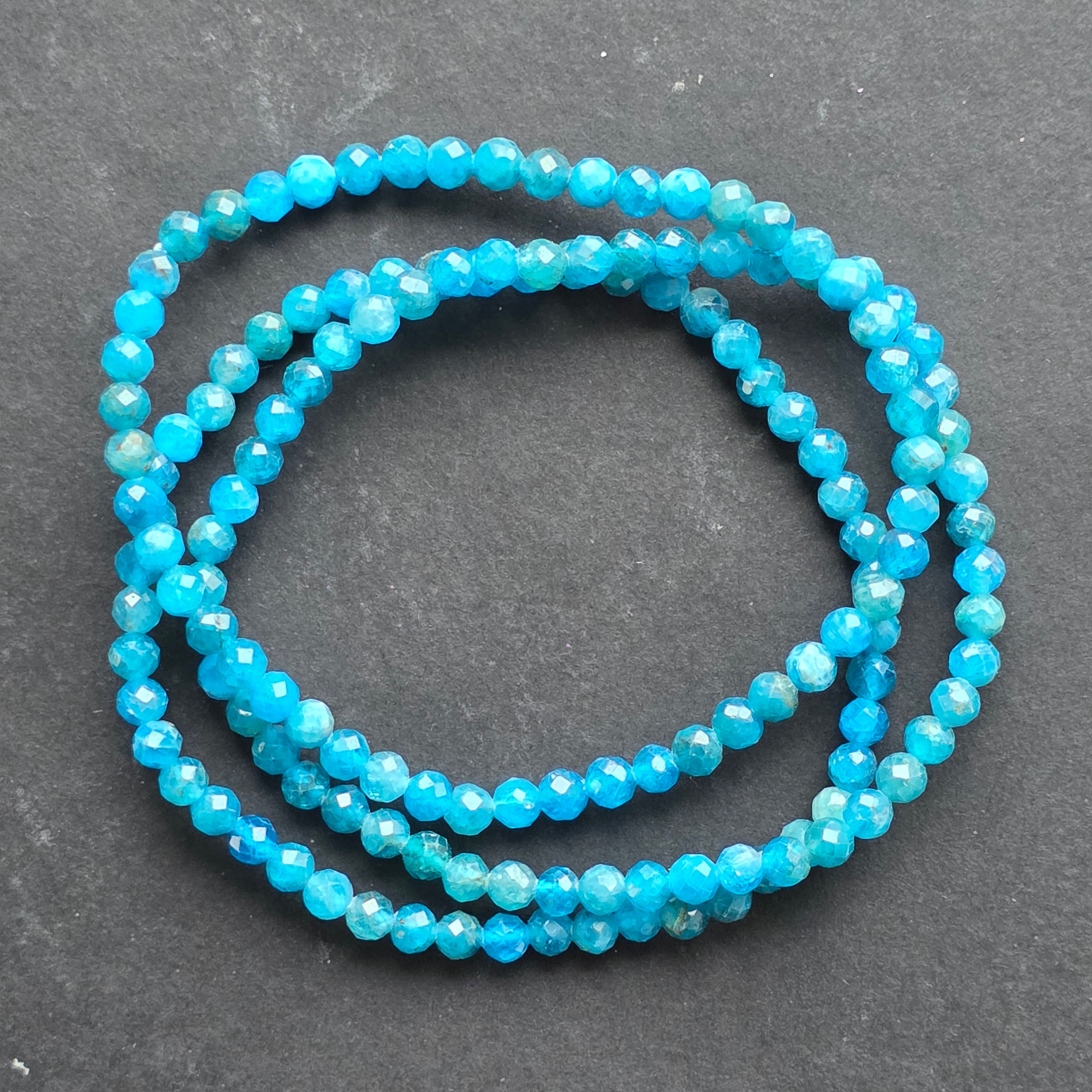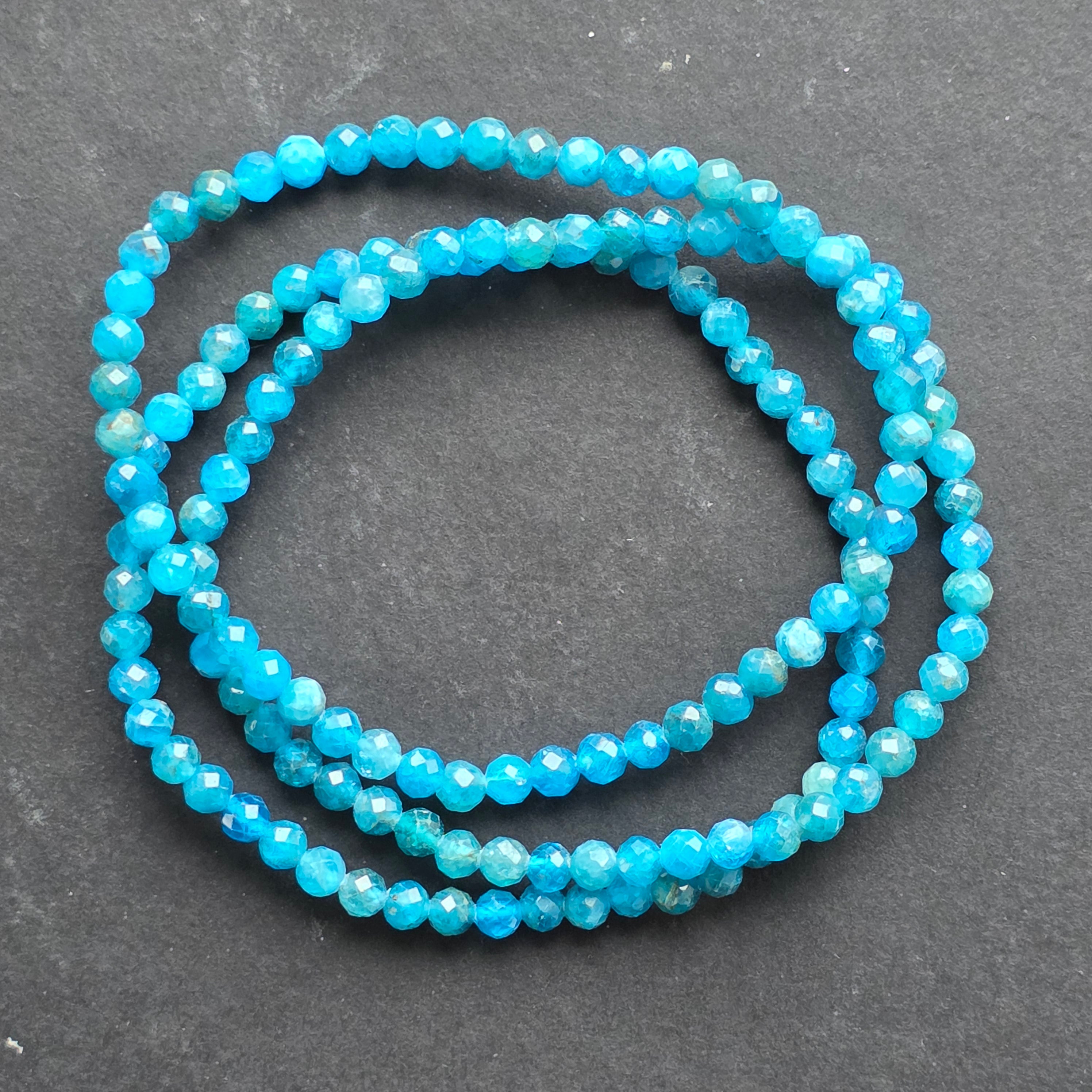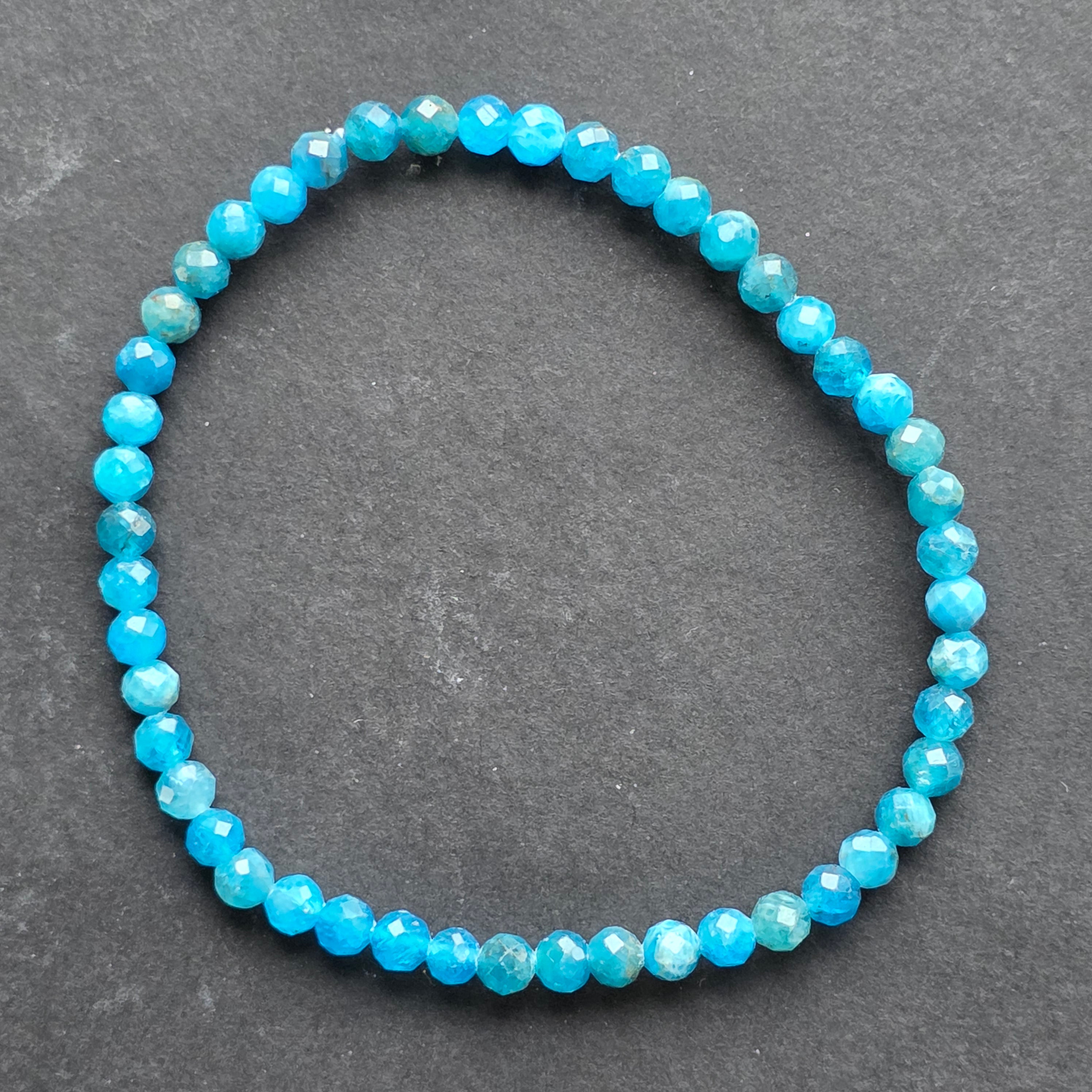 O brățară care surprinde profunzimea oceanului și limpezimea gândurilor senine. Mărgelele fațetate de apatit natural, cu diametrul de 4 mm, reflectă nuanțe fascinante de albastru-turcoaz, cu accente verzi translucide ce par să prindă viață în lumină. Este o bijuterie ce îmbină energia creativității cu liniștea minții, invitând la introspecție și exprimare autentică.