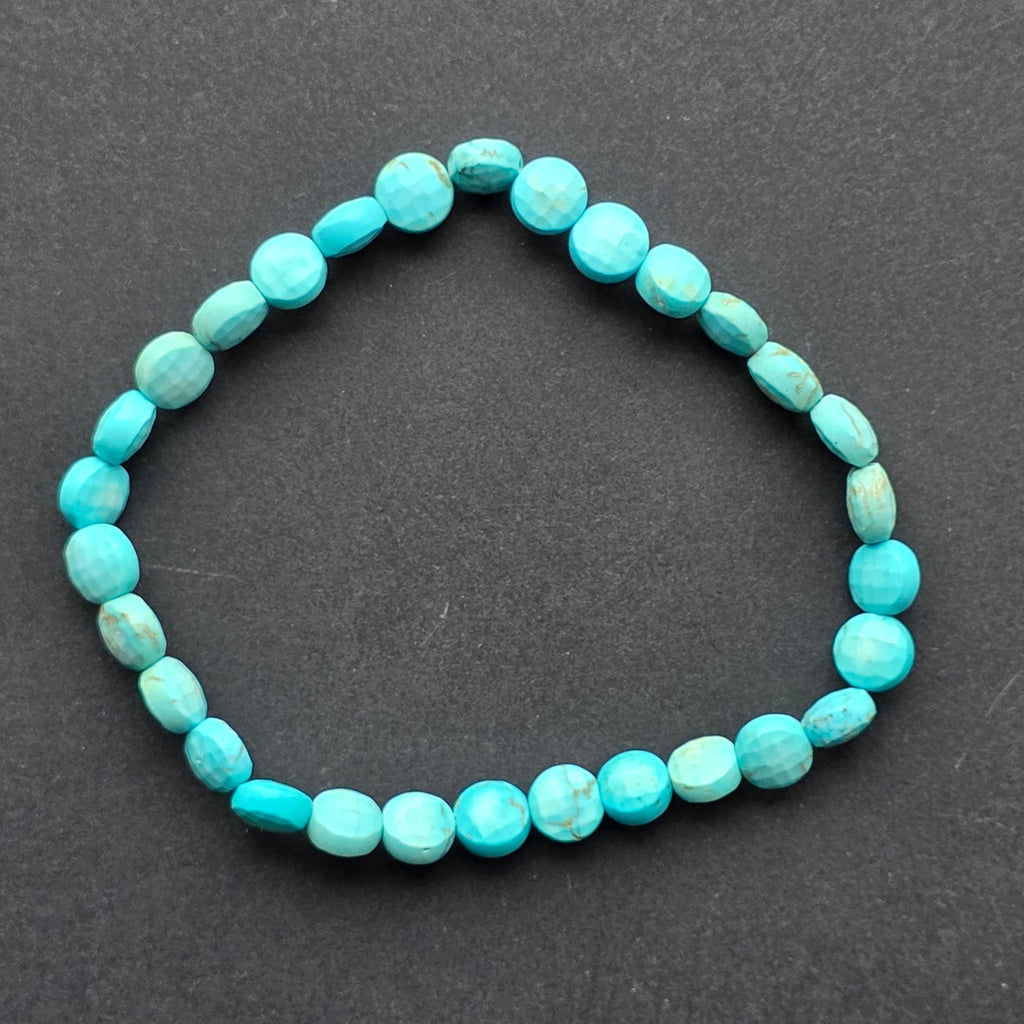 Howlitul albastru, cu nuanțele sale vii, îndrăznețe, aduce în această brățară o energie proaspătă și luminoasă. Discurile rotunde de 6×4 mm sunt fin fațetate, captând lumina în reflexe mici, jucăușe, care animă întreaga piesă asemenea unei brize ce face valurile să danseze.