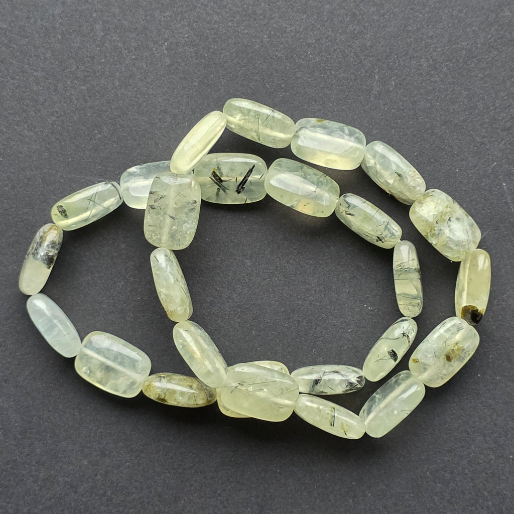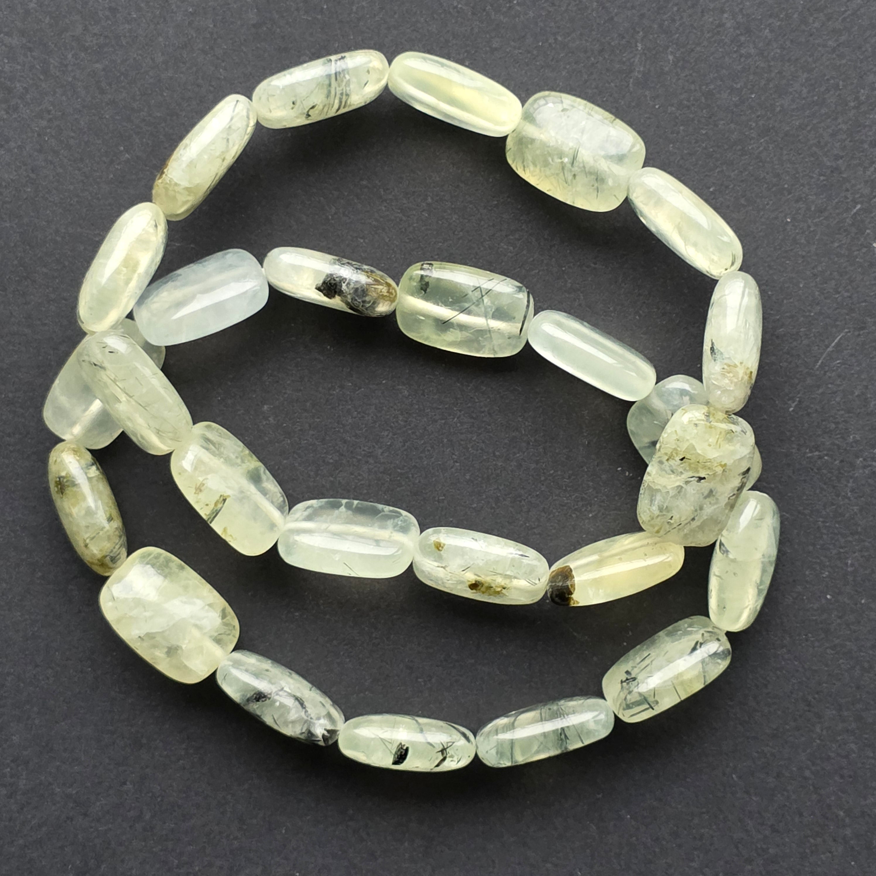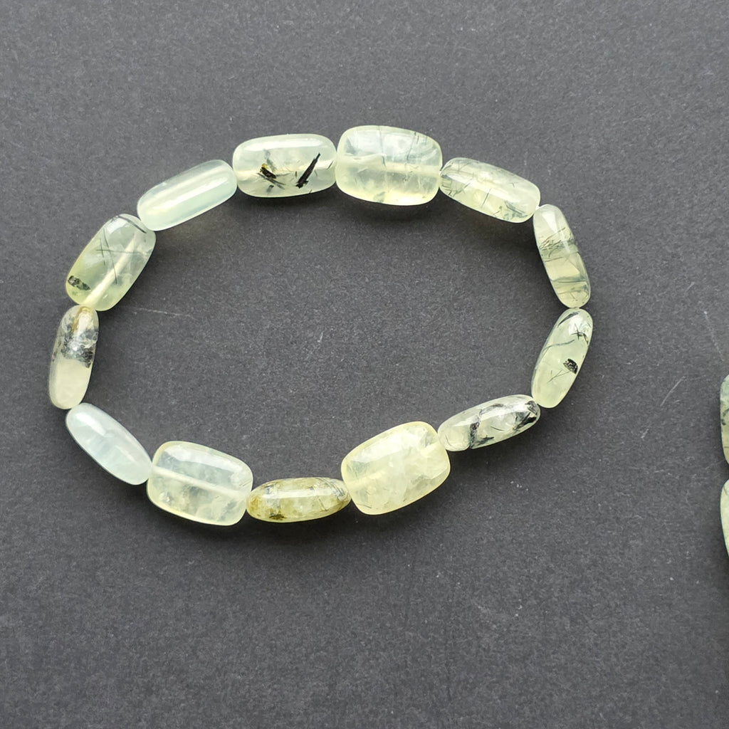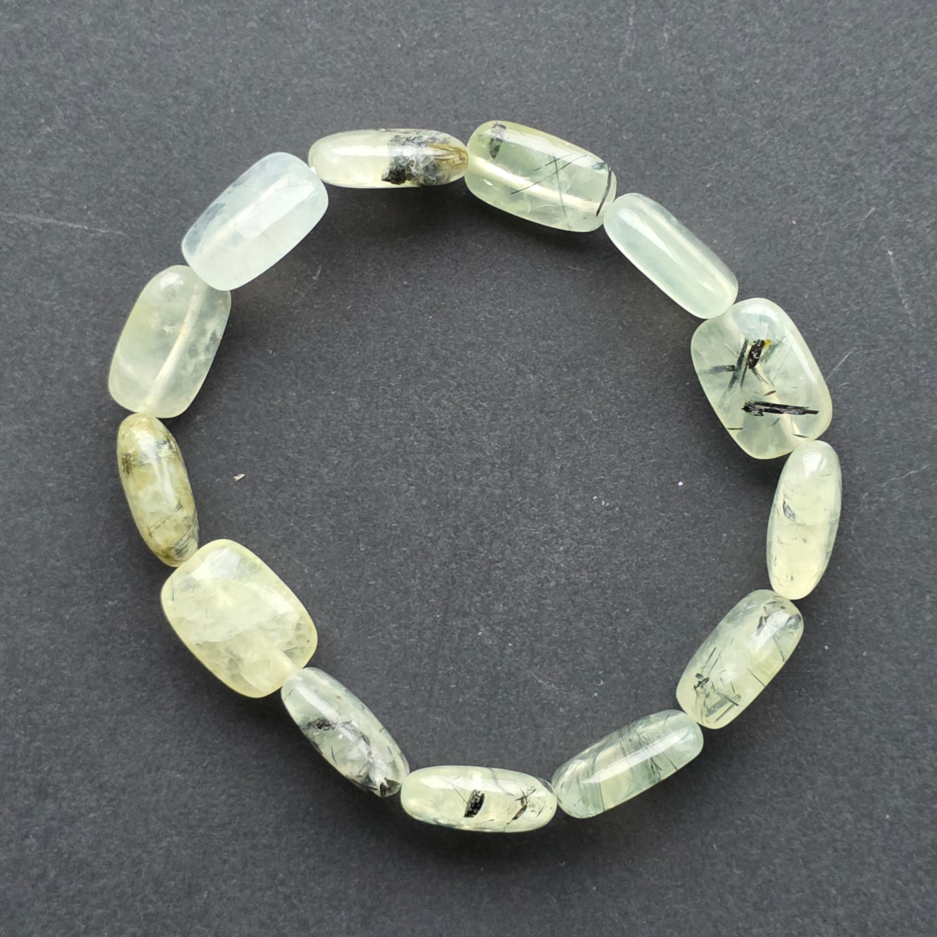Textura ușor mată și finețea formelor rotunjite conferă brățării o prezență calmă, aproape meditativă. La încheietură, prehnitul aduce o notă de prospețime și echilibru, combinând transparența blândă cu tonurile calde ale naturii.