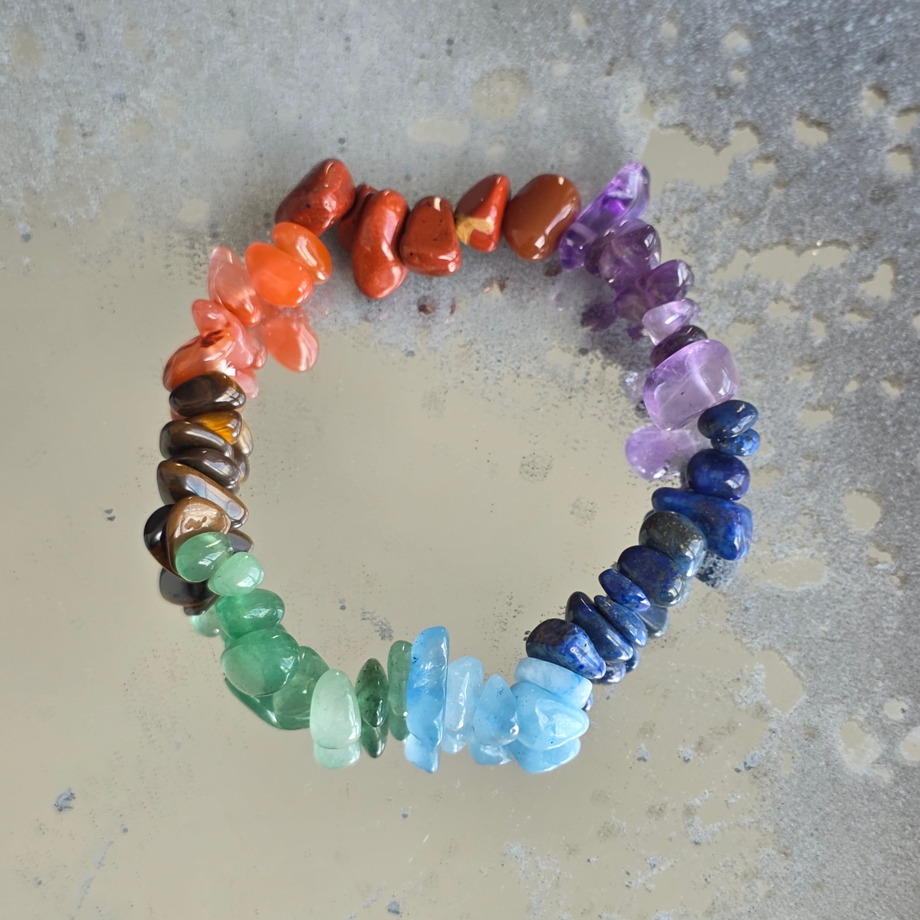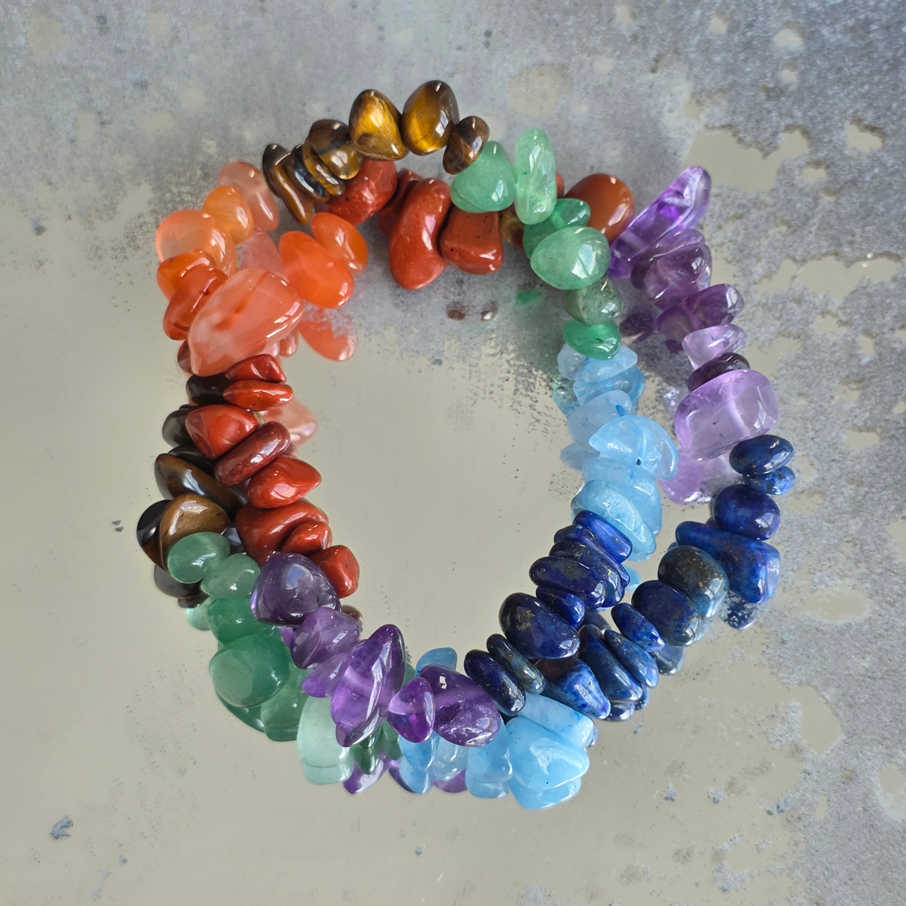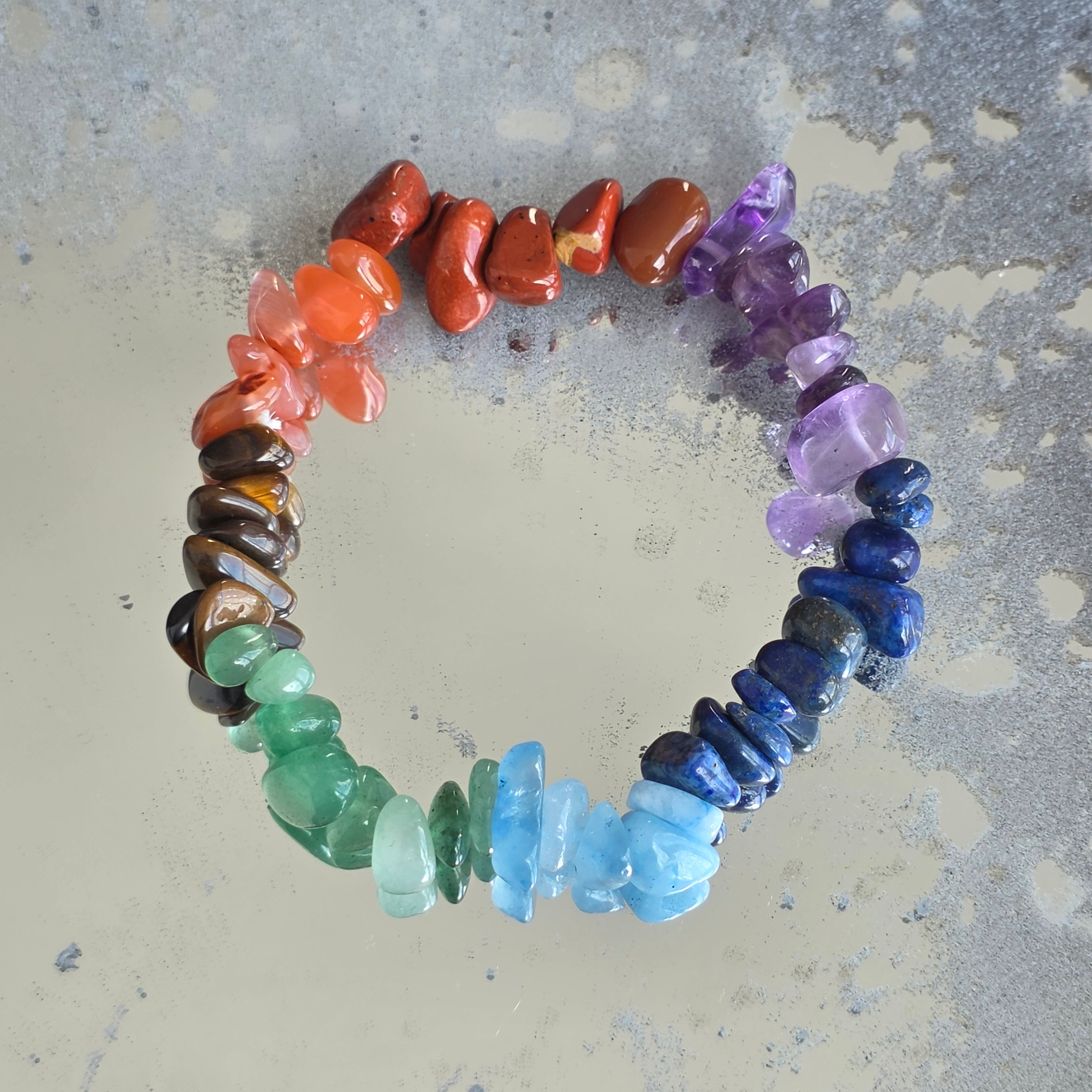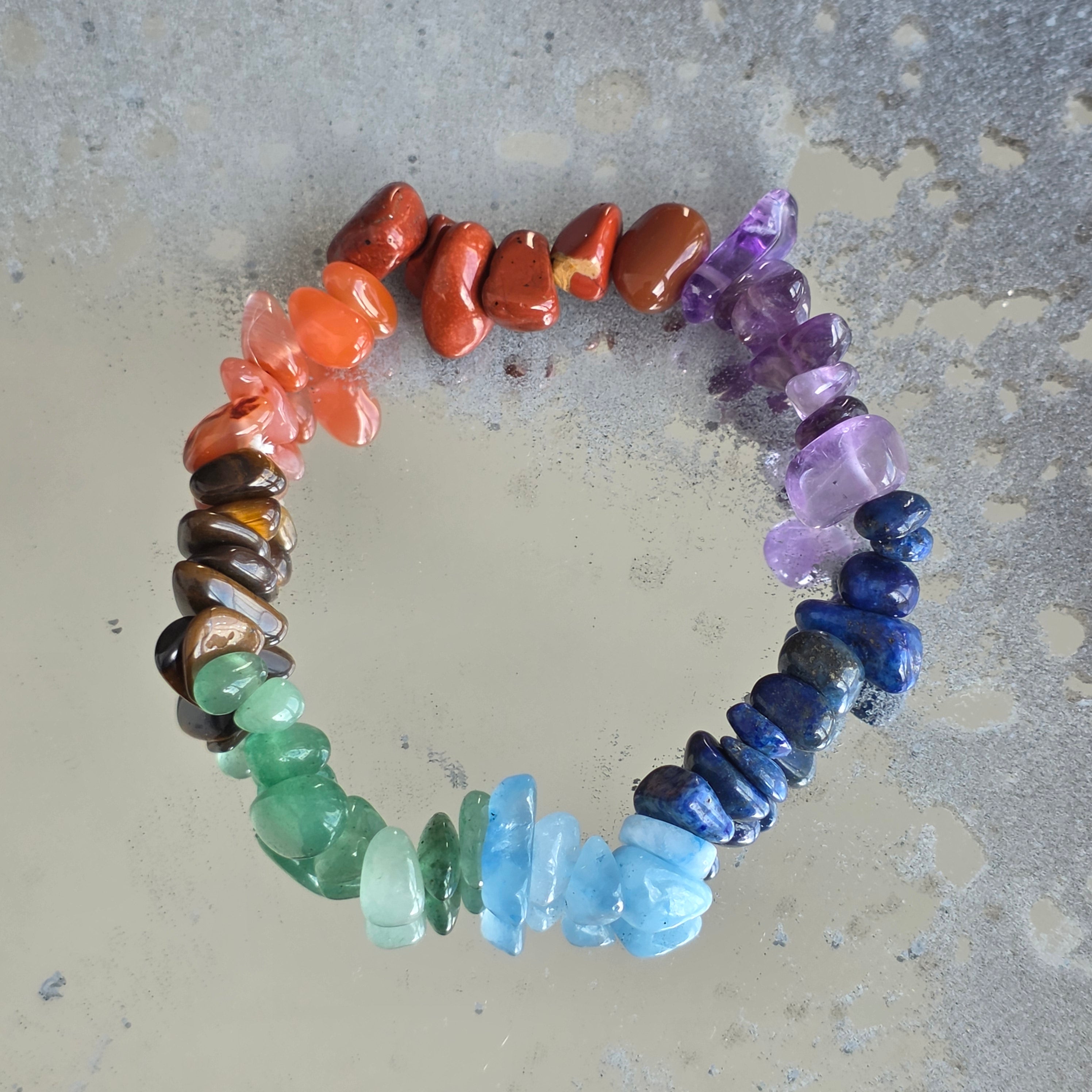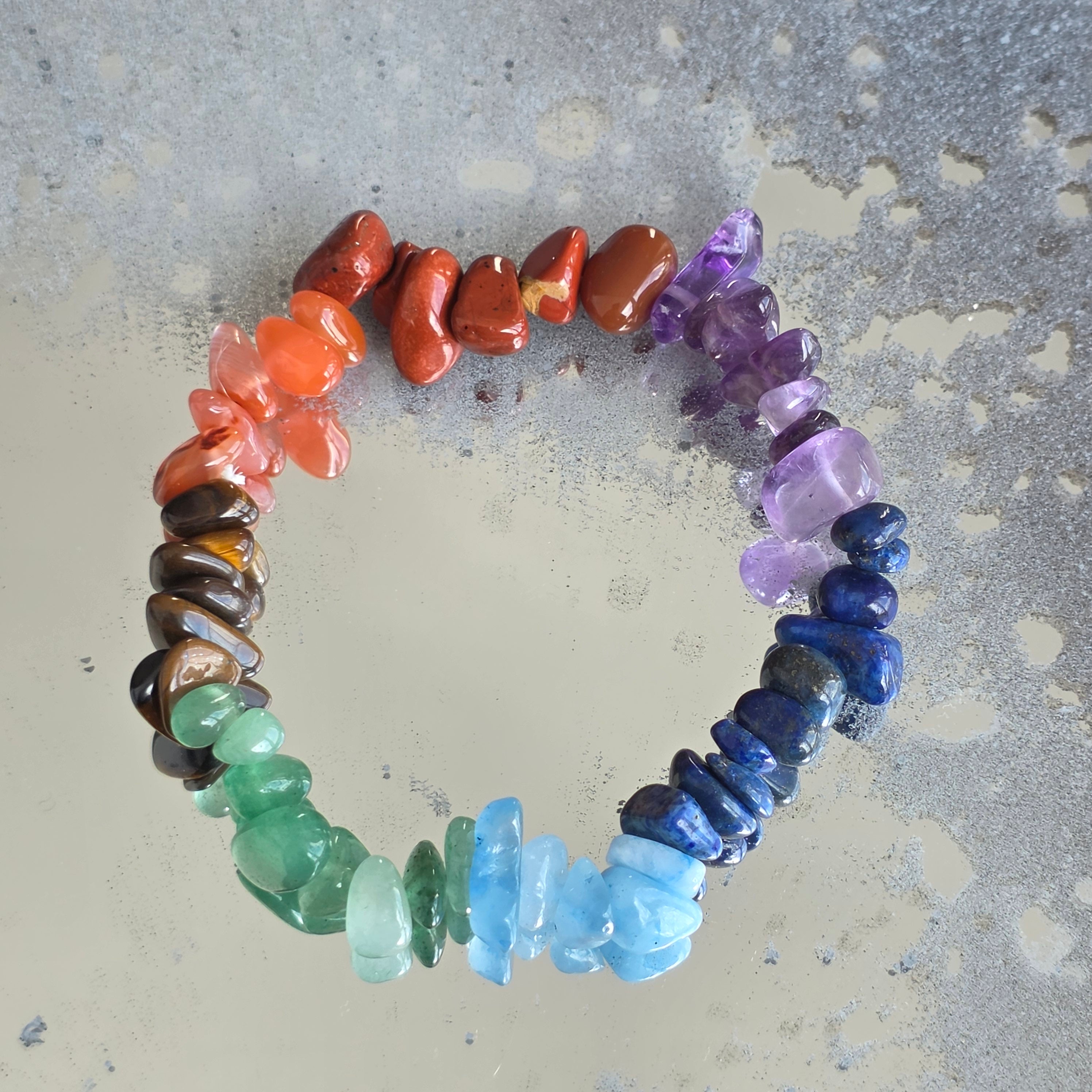 • Pierres: mix naturel spécifique aux 7 chakras (rouge, orange, jaune, vert, bleu clair, bleu foncé, violet)