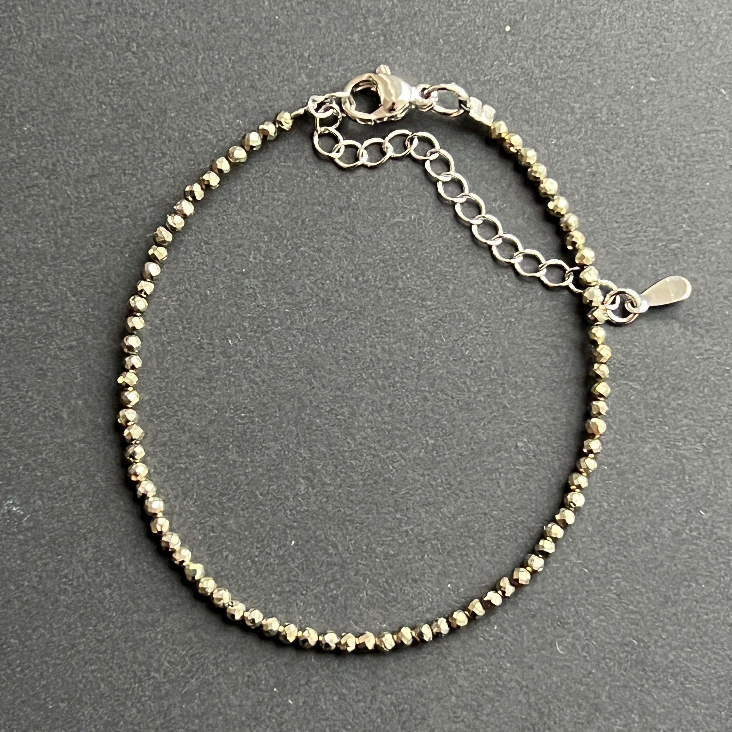 Dans ce bracelet délicat, les perles de pyrite semblent capturer l'essence du feu métallique : des étincelles dorées, des reflets froids et chauds à la fois, une lumière intérieure qui pulse discrètement à chaque mouvement du poignet. Les minuscules facettes des perles de 2 mm transforment la pyrite en une dentelle brillante, élégante et subtile.