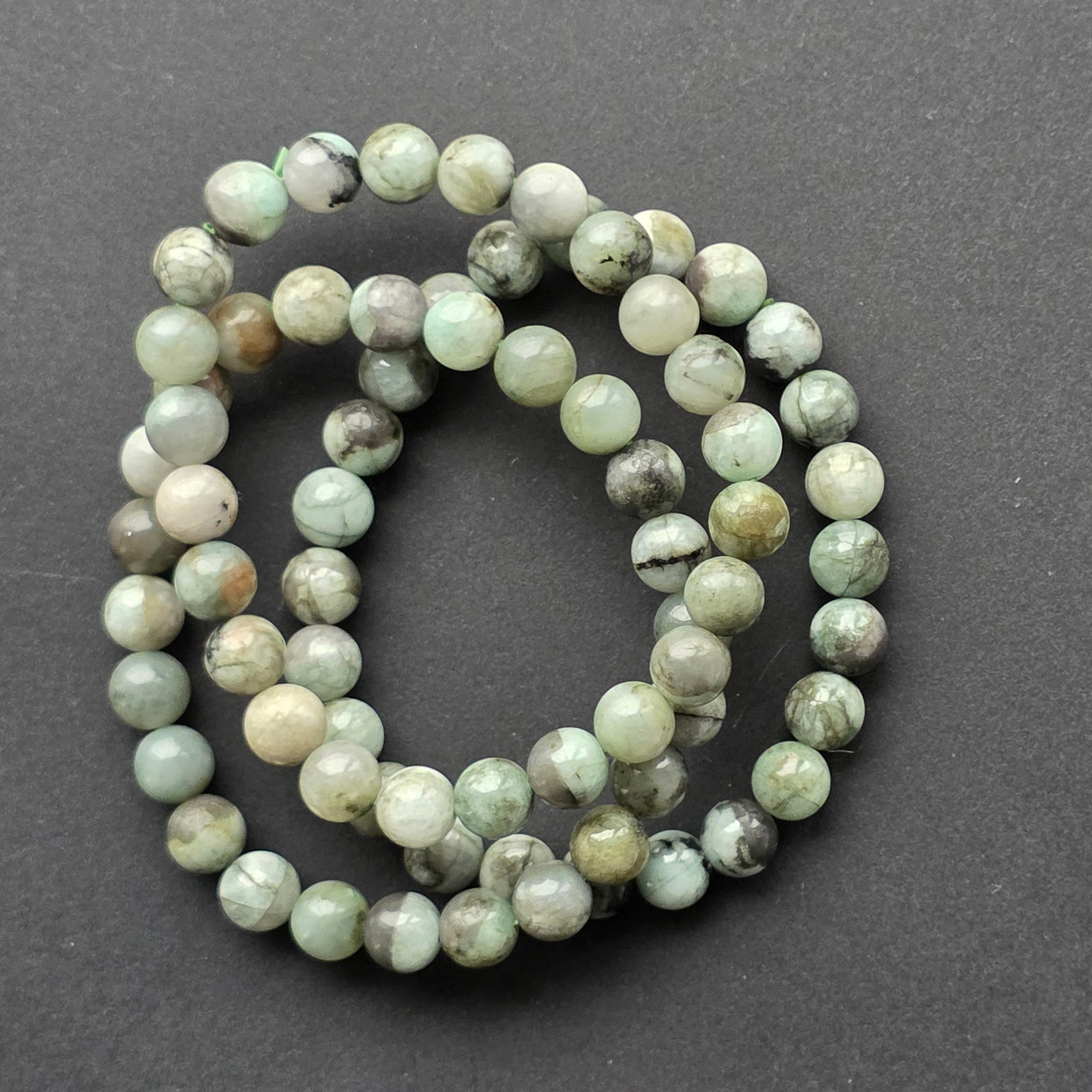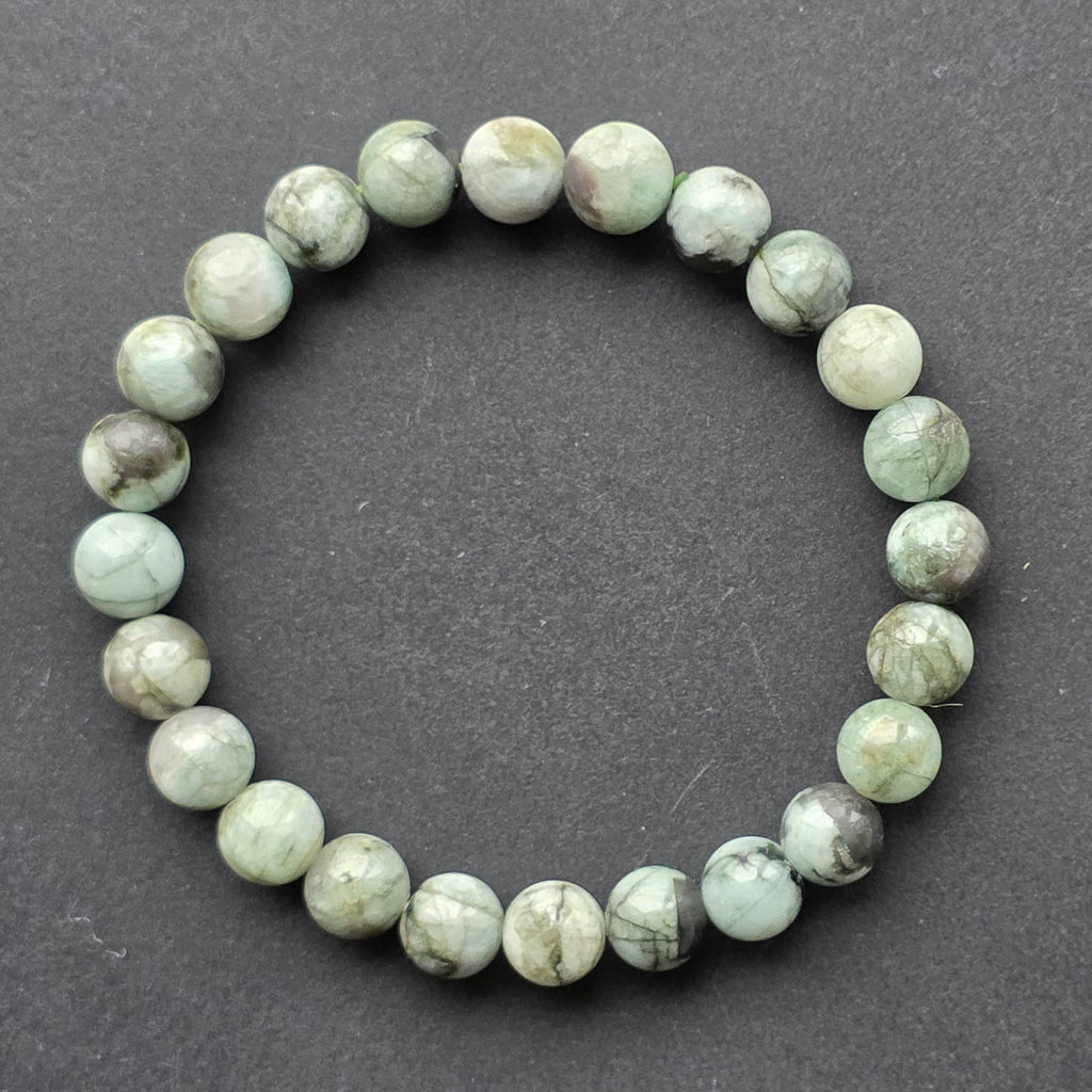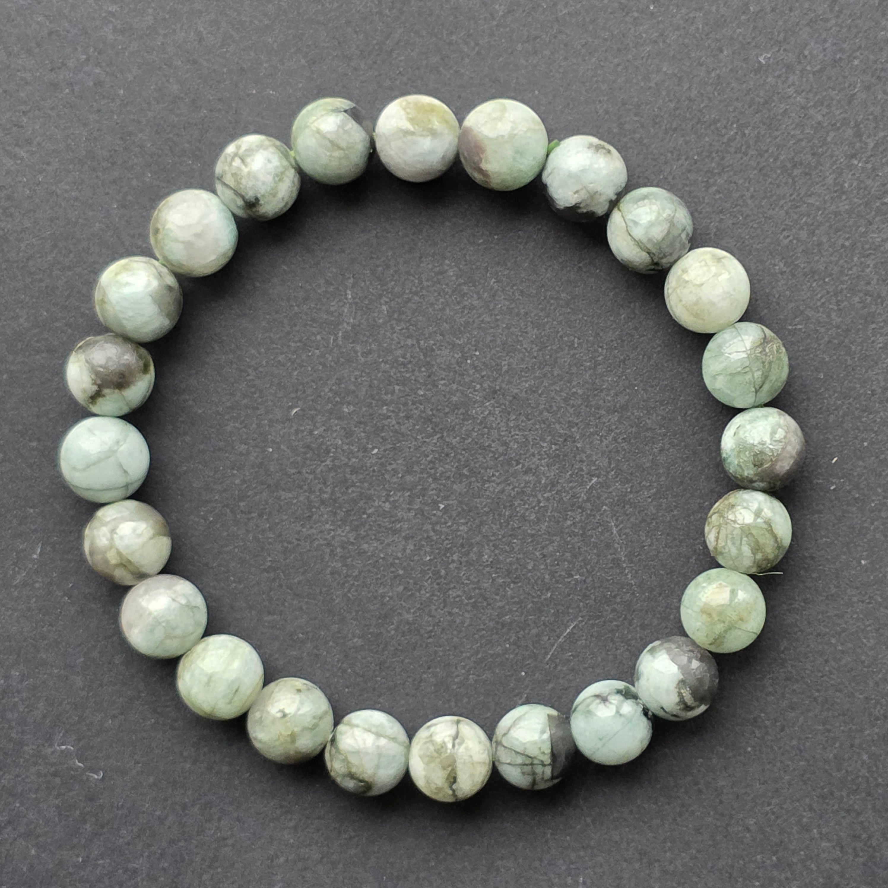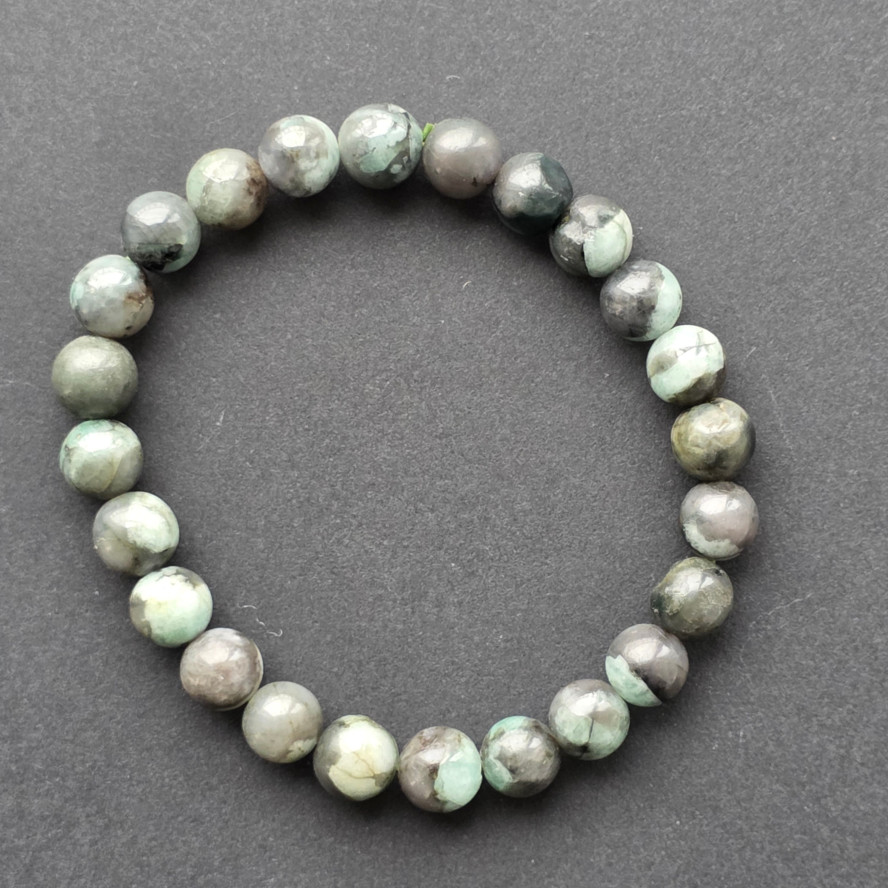 Le bracelet, réalisé avec de grosses perles de 7 à 8 mm, conserve la beauté authentique de l'émeraude naturelle. Les textures et inclusions caractéristiques créent la sensation d'un paysage minéral vivant, semblable à une forêt dense vue de près : contrastes entre zones lumineuses et ombres profondes, formes organiques, imperfections qui rendent chaque perle unique.