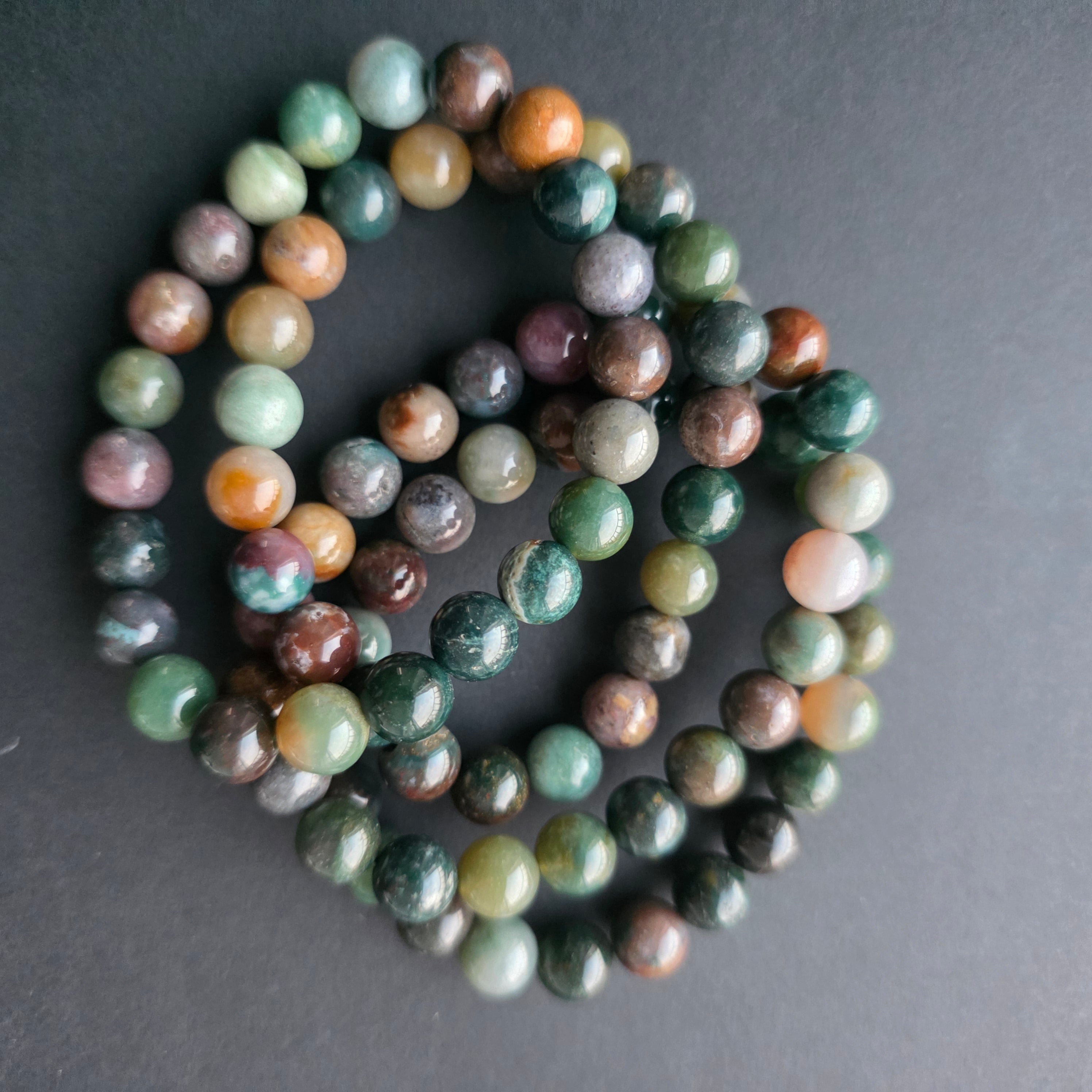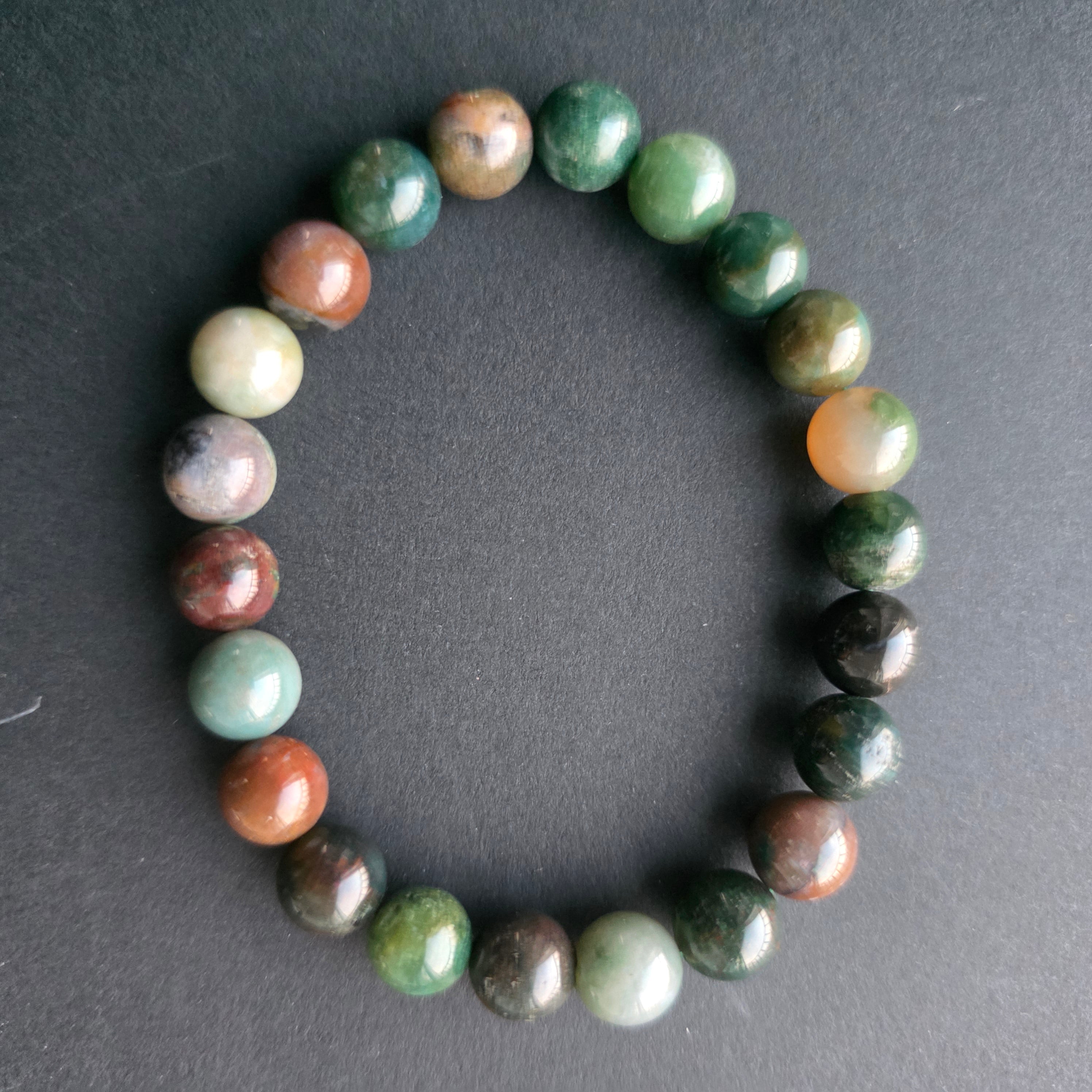 Ce bracelet en agate indienne, constitué de perles sphériques de 6 mm, impressionne par sa diversité chromatique subtile. Ses nuances naturelles de vert, rouge, brun et gris se mêlent dans une mosaïque harmonieuse, chaque bracelet étant une pièce unique.