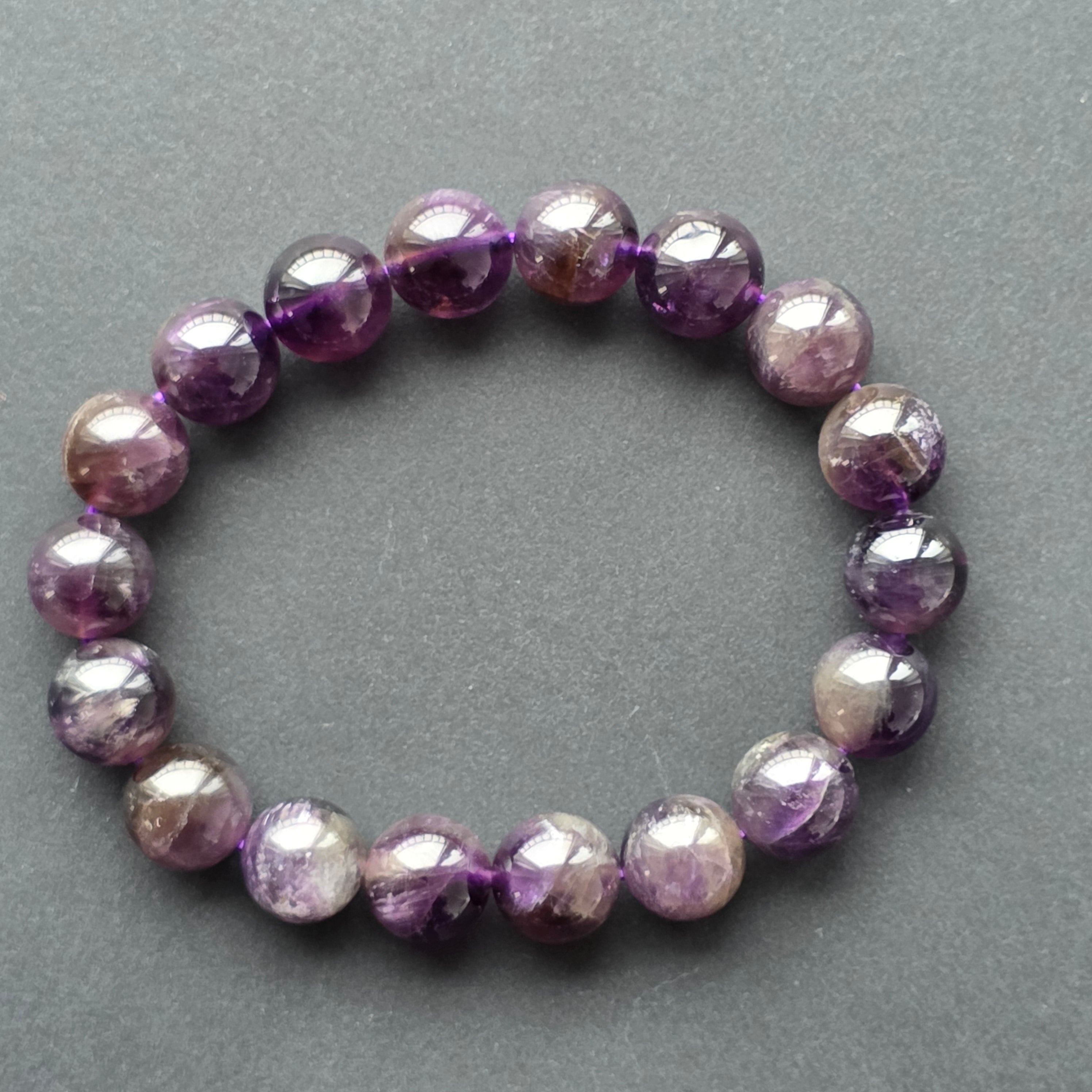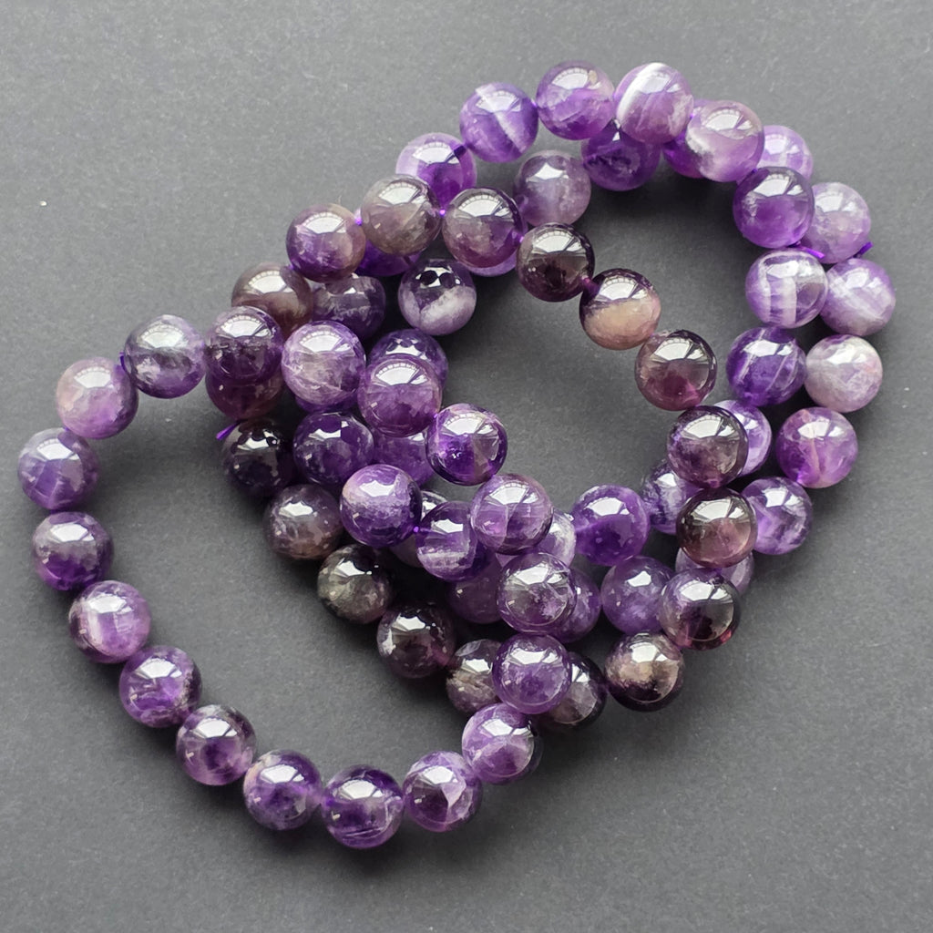 Fiecare mărgea surprinde lumina în reflexii subtile, iar tonurile variate de mov — de la nuanțe profunde până la accente diafane — transformă brățara într-o piesă elegantă, calmă și armonioasă. Este ușor de purtat, fină la încheietură și potrivită atât pentru ținute casual, cât și pentru un stil mai sofisticat.