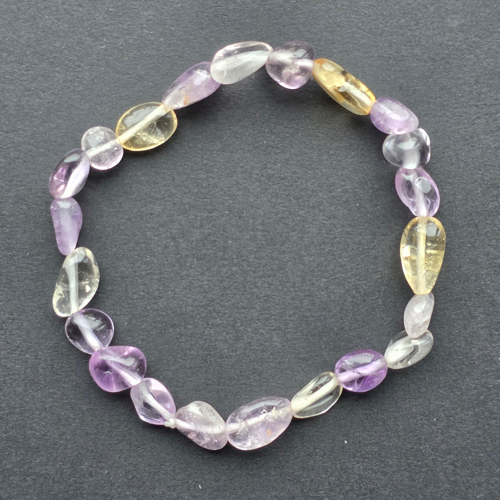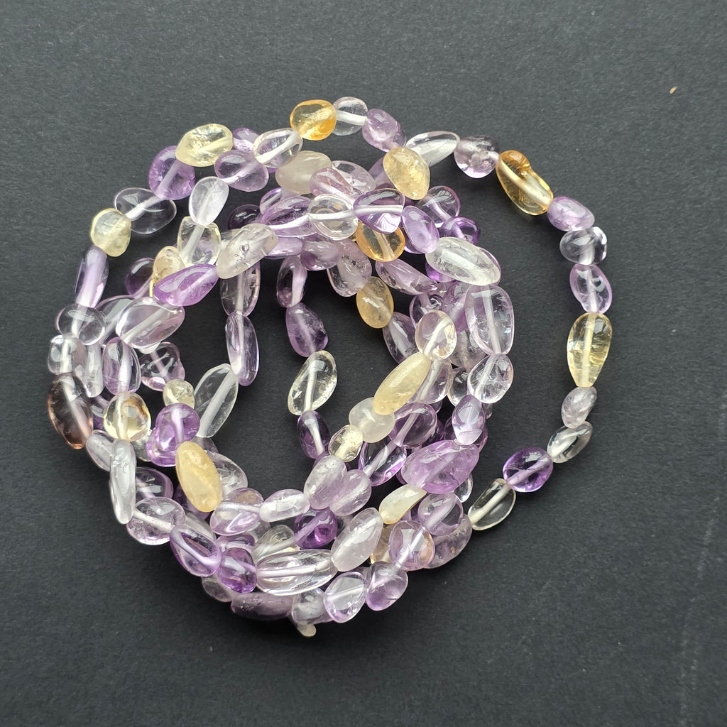 Ametrinul este una dintre cele mai fascinante pietre naturale, împletind într-un singur cristal două energii și două culori: violetul profund al ametistului și lumina aurie a citrinului. În această brățară, fiecare piatră tumble păstrează urme ale transformărilor geologice care au creat această combinație rară – o fuzionare perfectă între calm și claritate, între intuiție și vitalitate.