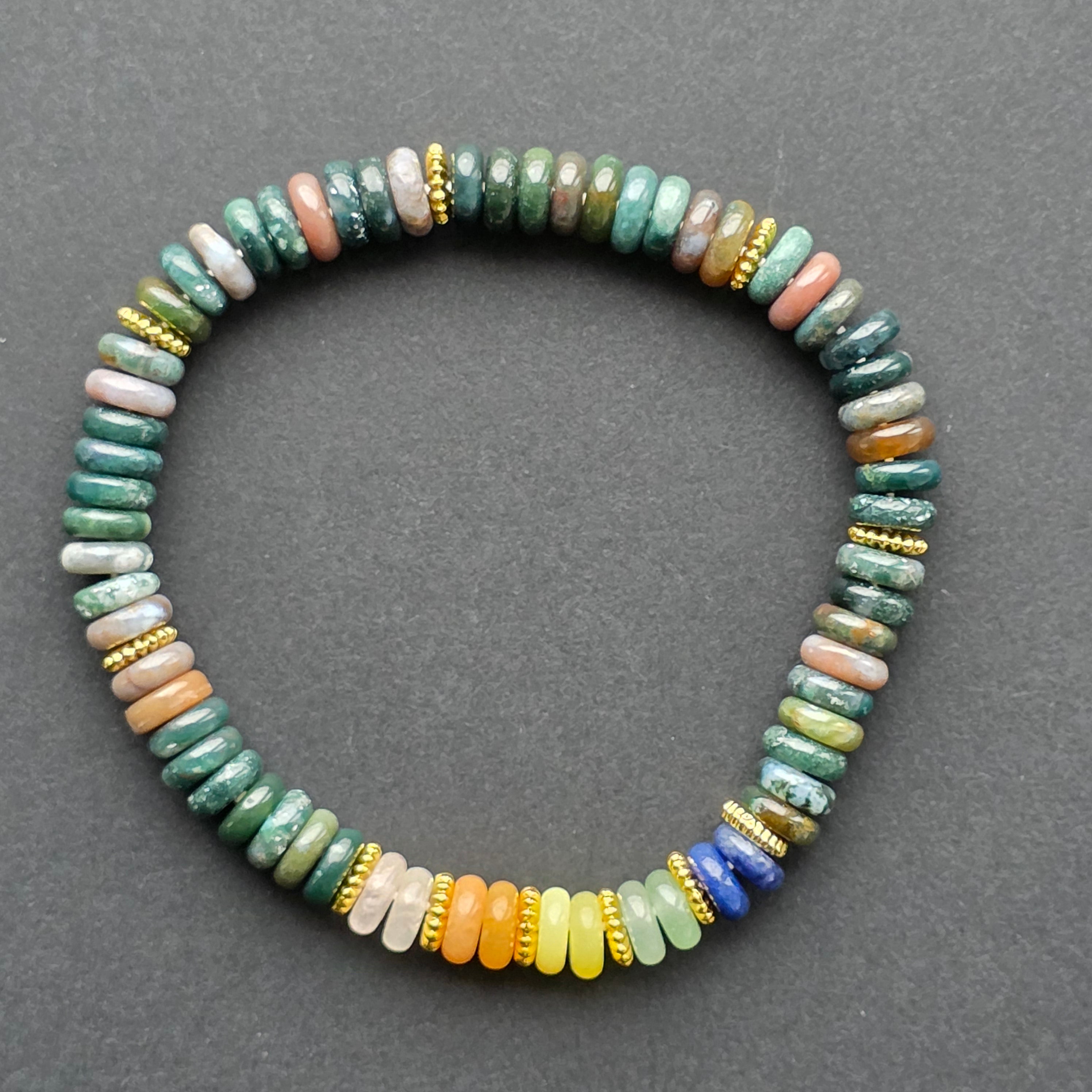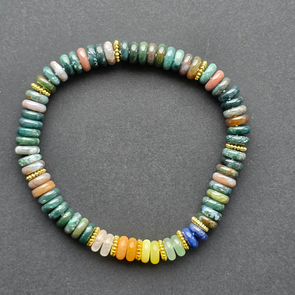În partea frontală, segmentul dedicat celor 7 chakre aduce un contrast viu și intenționat, oferind brățării un punct de lumină și echilibru. Combinația dintre tonurile earthy ale agatului indian și culorile vibrante ale chakrelor creează o prezență armonioasă — un accesoriu ce poate fi purtat atât ca simbol, cât și ca bijuterie rafinată de zi cu zi.