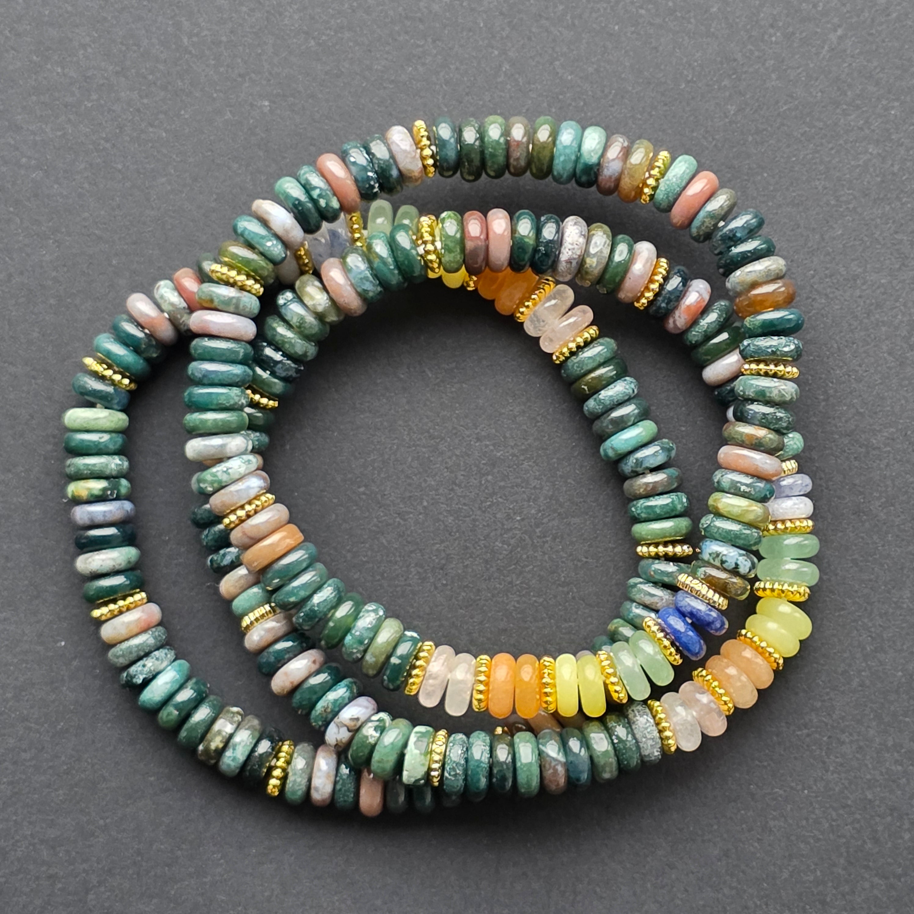 Agatul indian este recunoscut pentru diversitatea lui cromatică — o împletire organică de verde adânc, maro pământiu și tonuri discrete de gri, toate așezate în straturi naturale, exact ca în interiorul unei pietre formate în milioane de ani. Fiecare disc păstrează amprenta unică a mineralului, iar această variabilitate subtilă transformă brățara într-o piesă cu personalitate proprie.