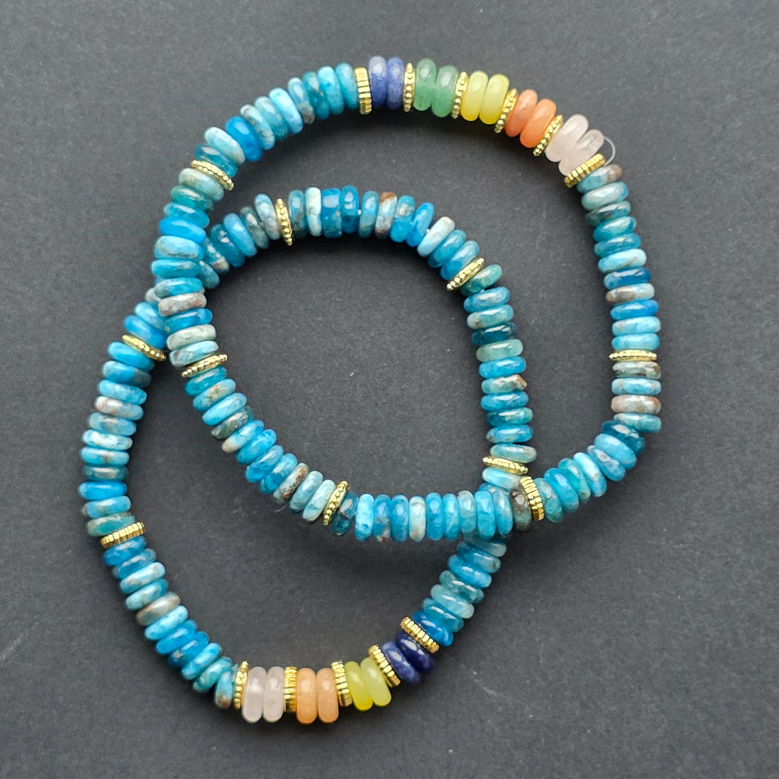 Brățara din apatit albastru captează lumina într-un mod aparte, cu reflexe profunde ce amintesc de valurile oceanului. Fiecare disc este slefuit pentru a păstra acel joc cromatic specific apatitei — un amestec vibrant de albastru turcoaz și nuanțe marine mai închise, care creează o textură vizuală bogată și elegantă.