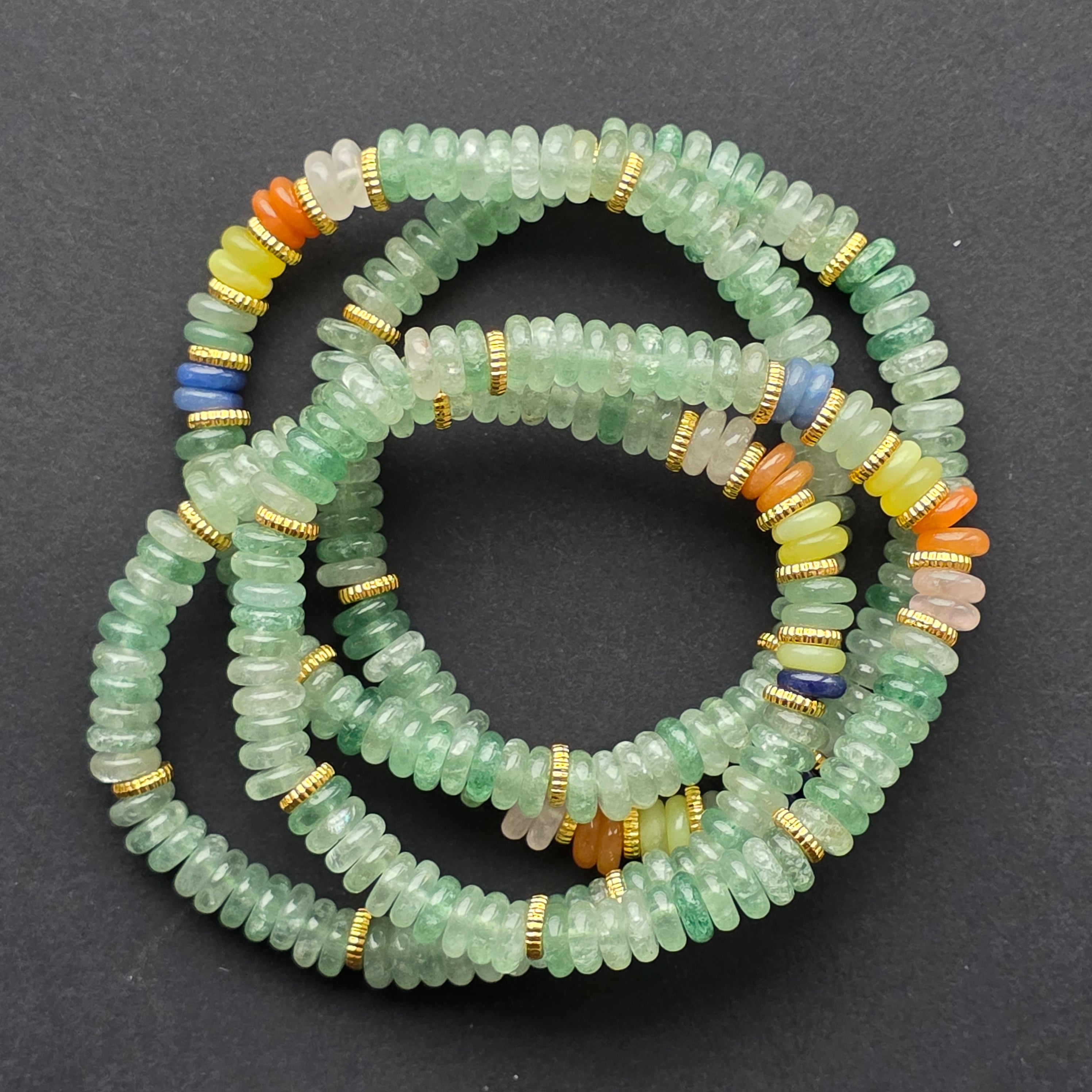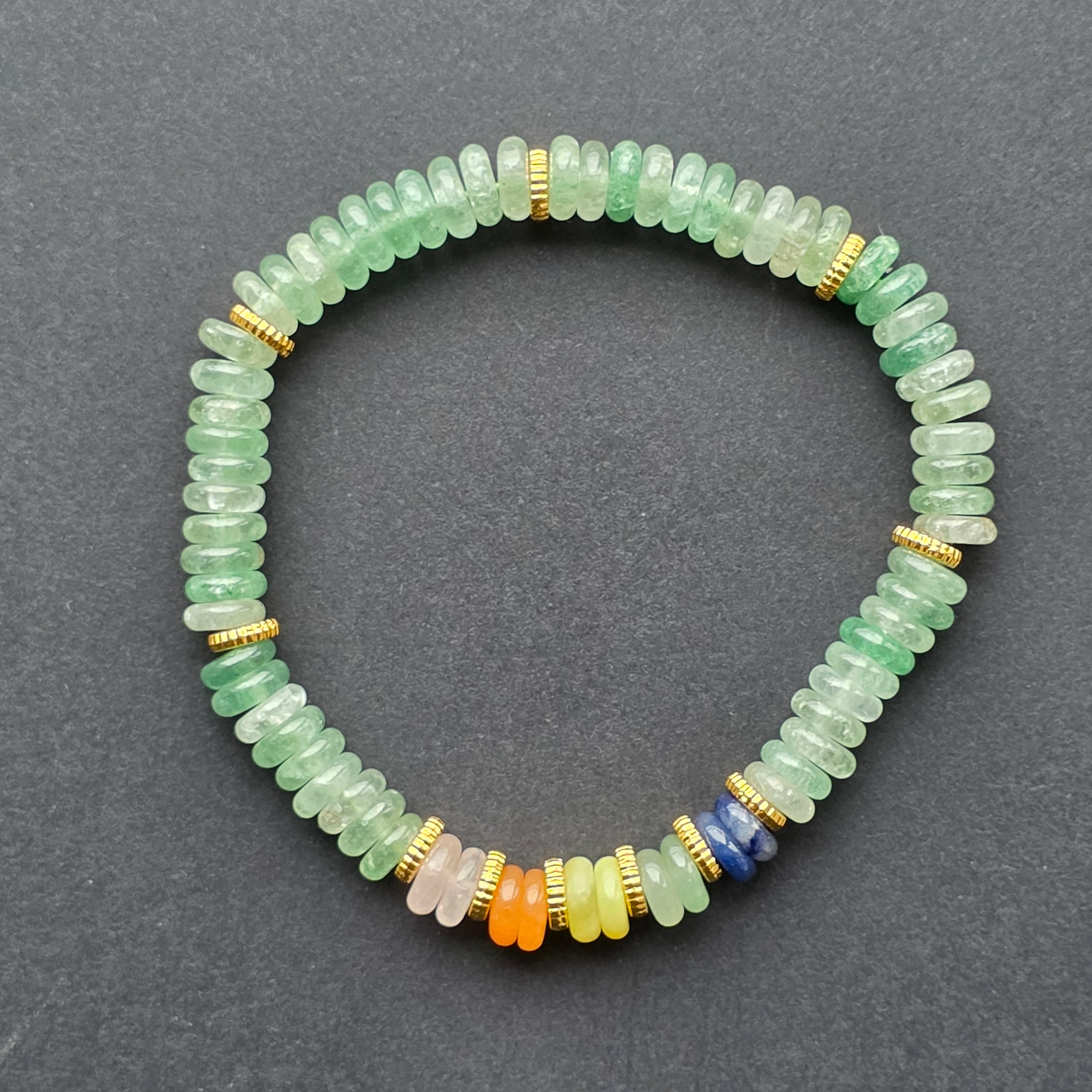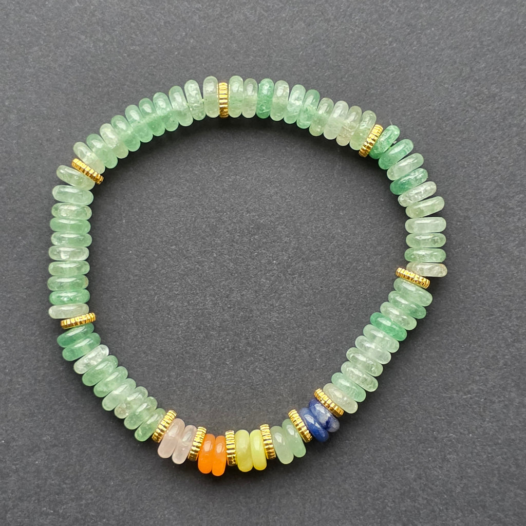 Segmentul 7 chakre adaugă o vibrație colorată, plină de optimism, îmbinând simbolismul energetic cu estetica modernă. Contrastul dintre verdele aventurinului și culorile vii din centru creează un design fresh, luminos și ușor de purtat în orice combinație.