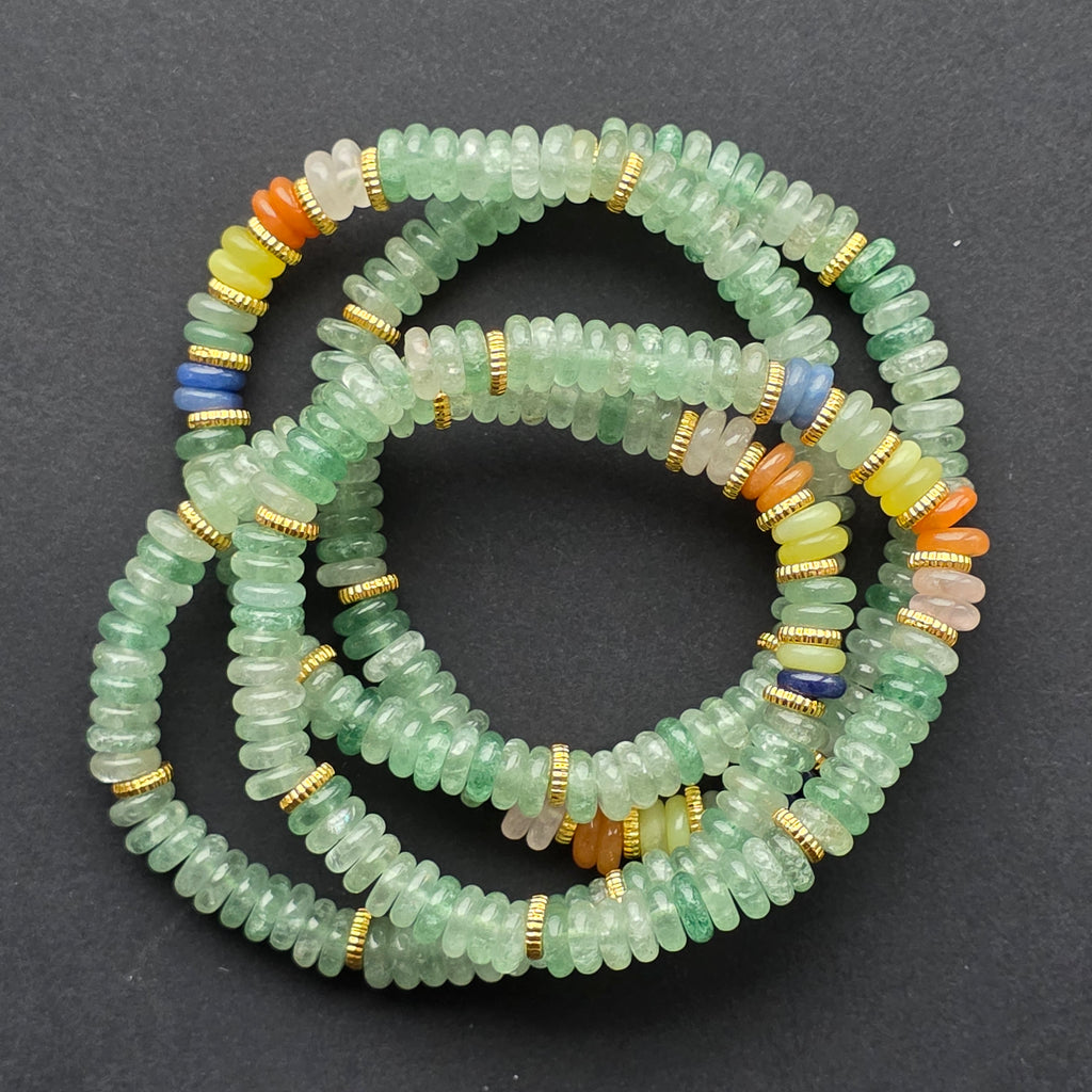 Brățara cu aventurin verde aduce un strop de prospețime și claritate, asemenea luminii filtrate prin frunziș într-o dimineață calmă. Fiecare disc este șlefuit fin, păstrând textura ușor translucidă specifică aventurinului și acele mici licăriri interne care îl fac atât de îndrăgit de purtători.