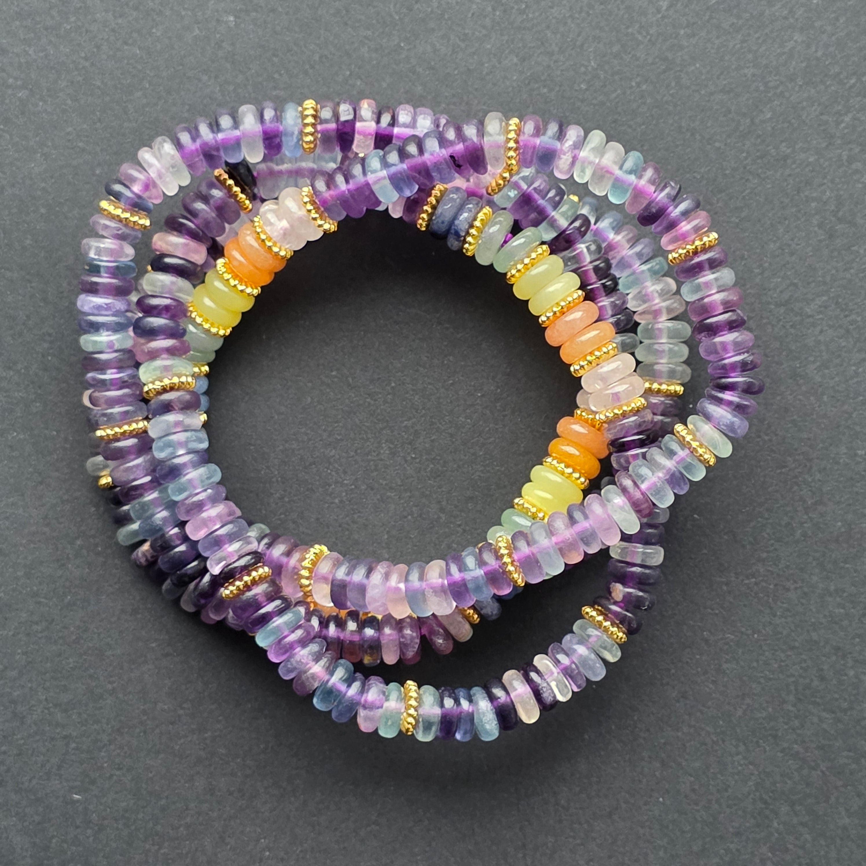 Brățara realizată din fluorină mov se distinge prin transparența ei ușor misterioasă, cu nuanțe care oscilează între liliachiu, violet profund și tonuri reci de ametist. Discurile subțiri formează o structură elegantă, fină, care aduce pe încheietură o estetică calmă și echilibrată.
