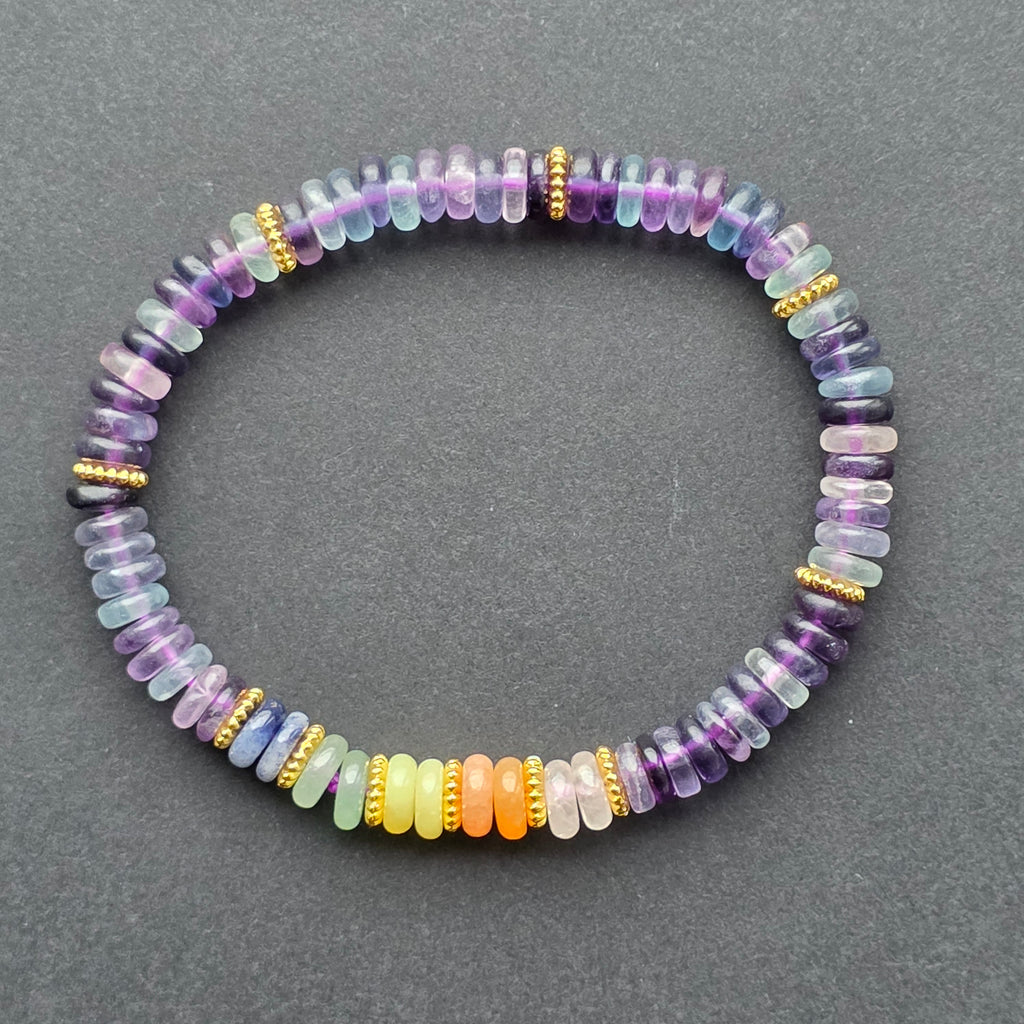 În zona centrală se află un segment dedicat celor 7 chakre, creat din pietre multicolore ce adaugă un accent vibrant și simbolic. Acest contrast dintre movul eteric al fluorinei și culorile calde ale chakrelor creează o brățară ce radiază armonie, expresivitate și sensibilitate vizuală.