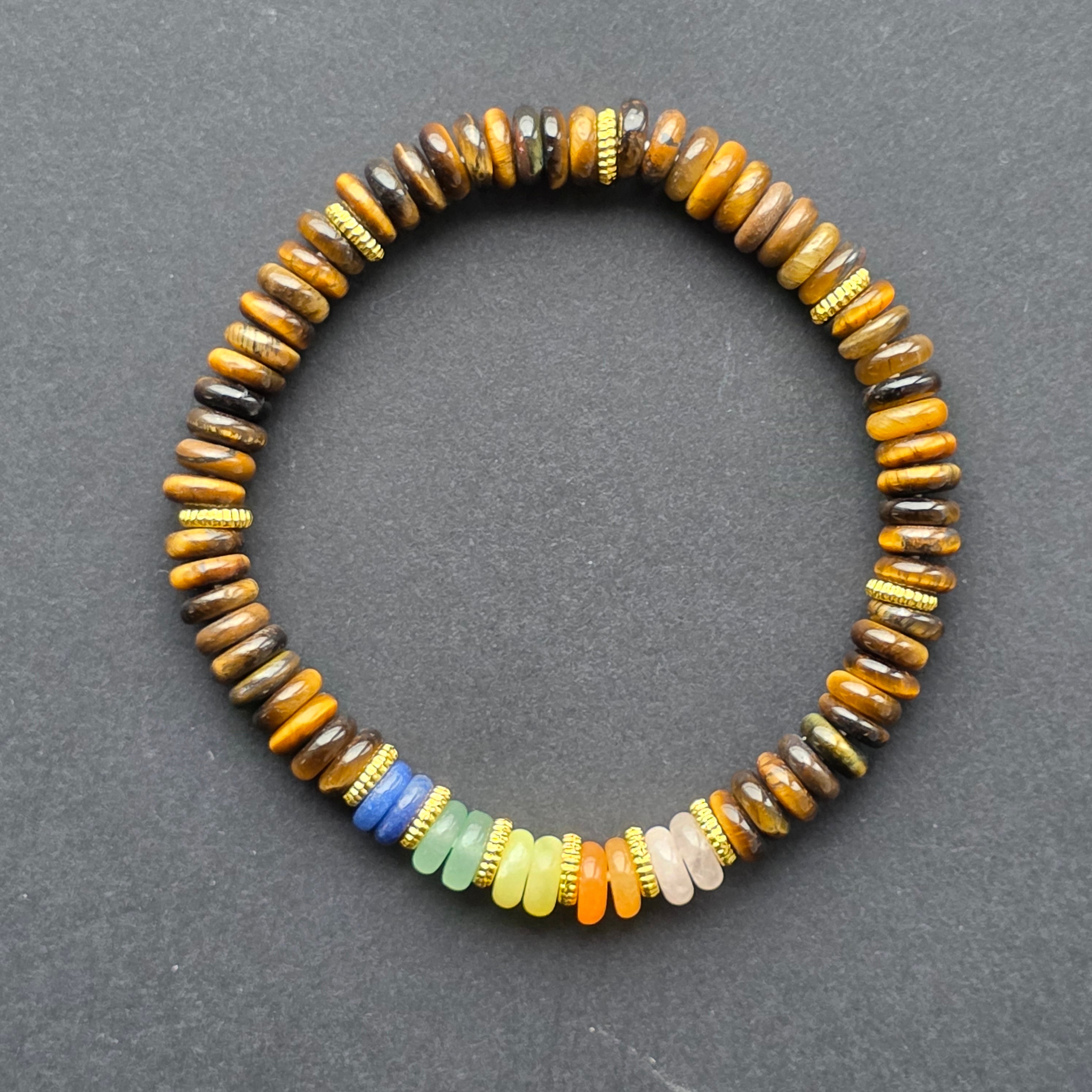Realizată din ochi de tigru natural, această brățară îmbină frumusețea mătăsoasă a pietrei cu energia culorilor chakrelor. Discurile fine, cu luciu specific cat’s eye, creează o strălucire caldă, mișcătoare, ce dansează la lumină, în timp ce segmentul central multicolor aduce un contrast plin de vitalitate.