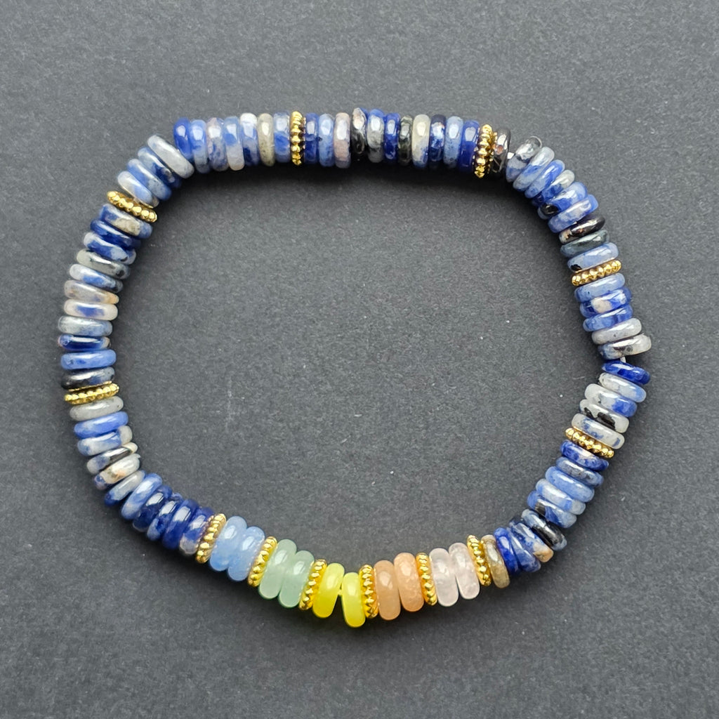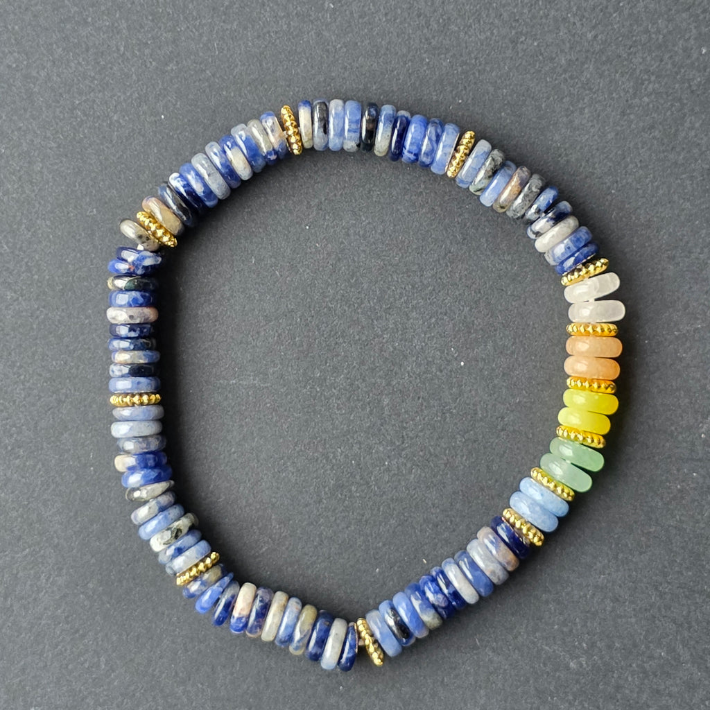 Segmentul central, alcătuit din pietre în culorile celor 7 chakre, aduce o notă vibrantă și echilibrată, simbolizând călătoria interioară și armonia personală. Contrastul dintre albastrul profund și tonurile calde ale chakrelor creează un design modern, care poate fi purtat atât ca accesoriu de zi cu zi, cât și în combinații creative cu alte brățări.